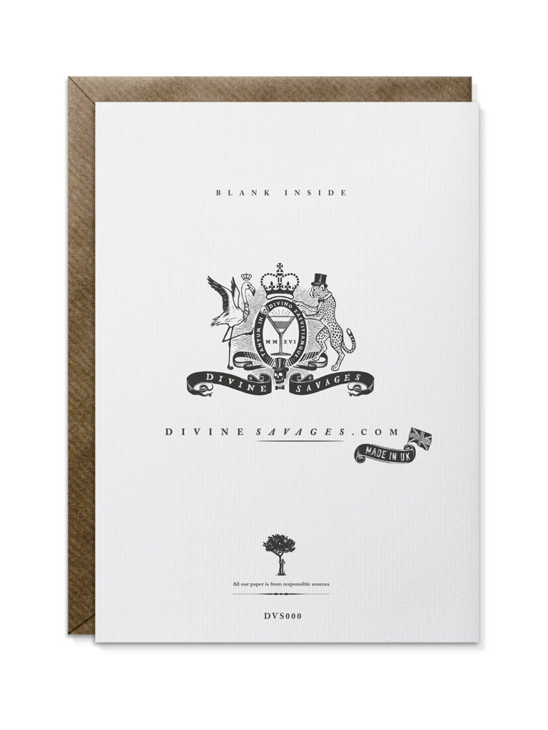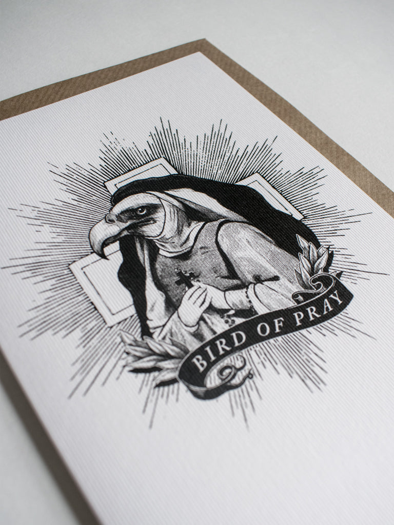 ‘Bird of Pray’ is written on the front and the card is blank inside for your own message. Printed on luxurious FSC certified 300gsm un-coated textured paper, supplied with a brown kraft envelope and cello wrap.