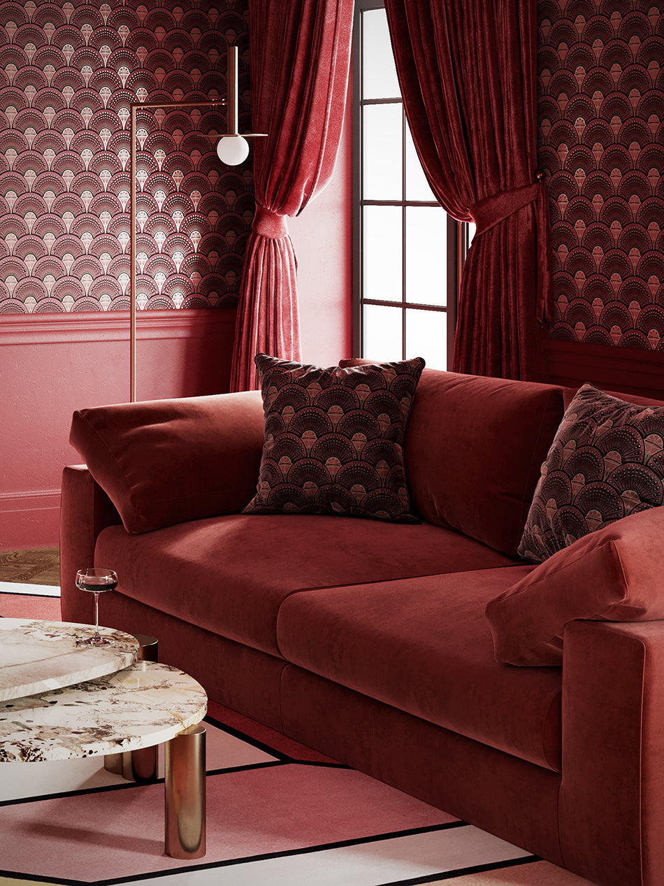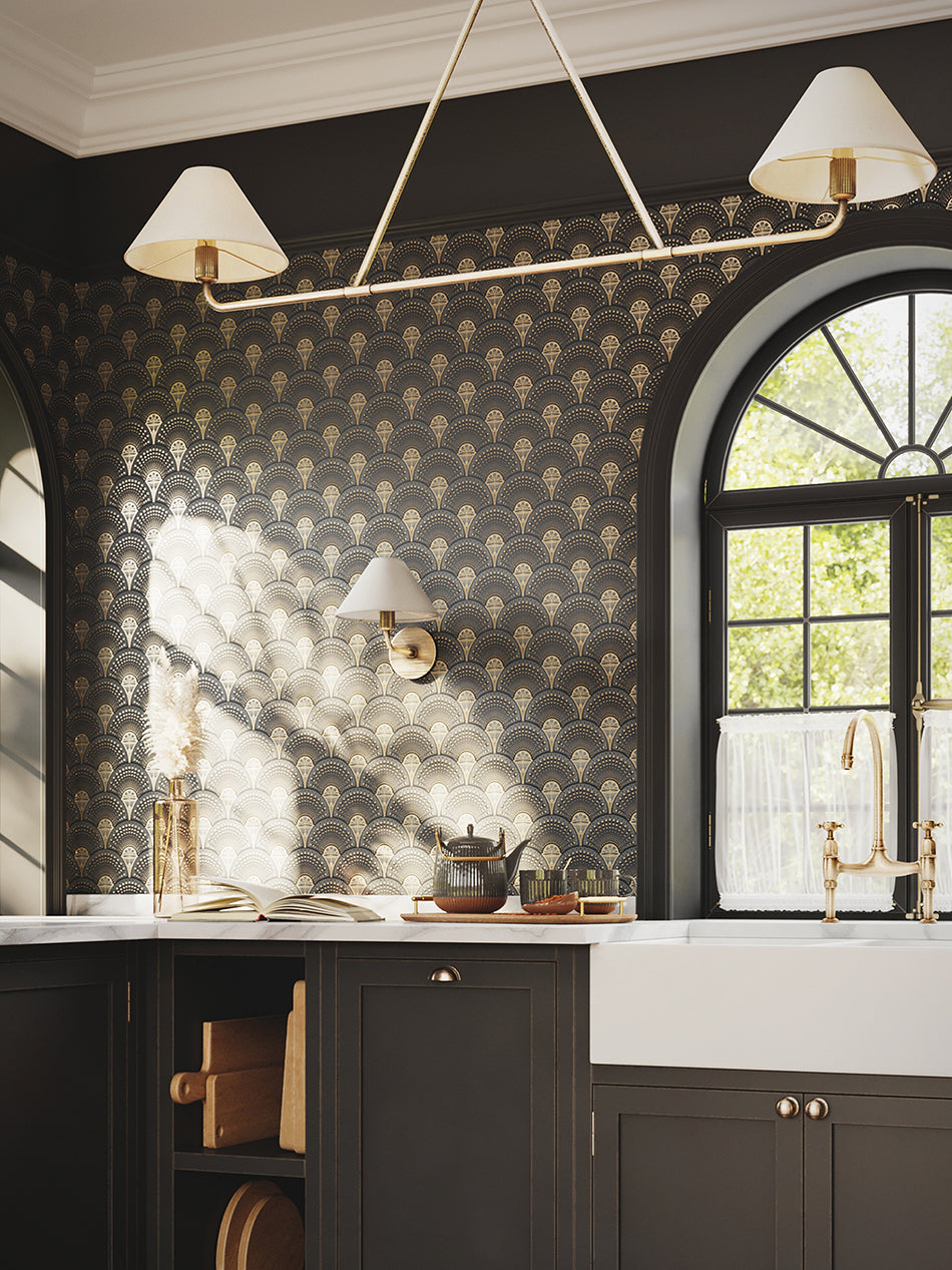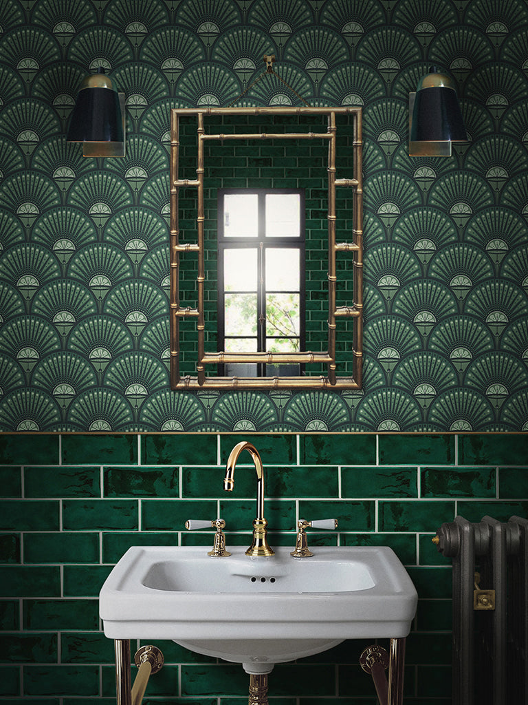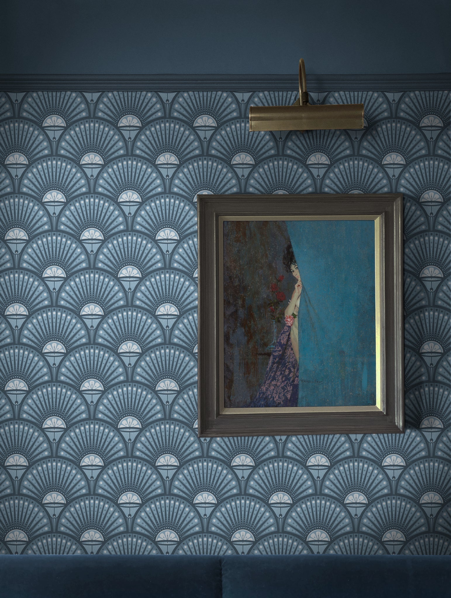 An Art Deco inspired design that brings Gatsby glamour to your home. Inspired by the Roaring Twenties and the decadent tastemakers of the jazz age, this bold graphic print brings Art Deco opulence to your interior with our Divine Savages twist on the traditional fan motif, featuring a hidden martini glass within the design.