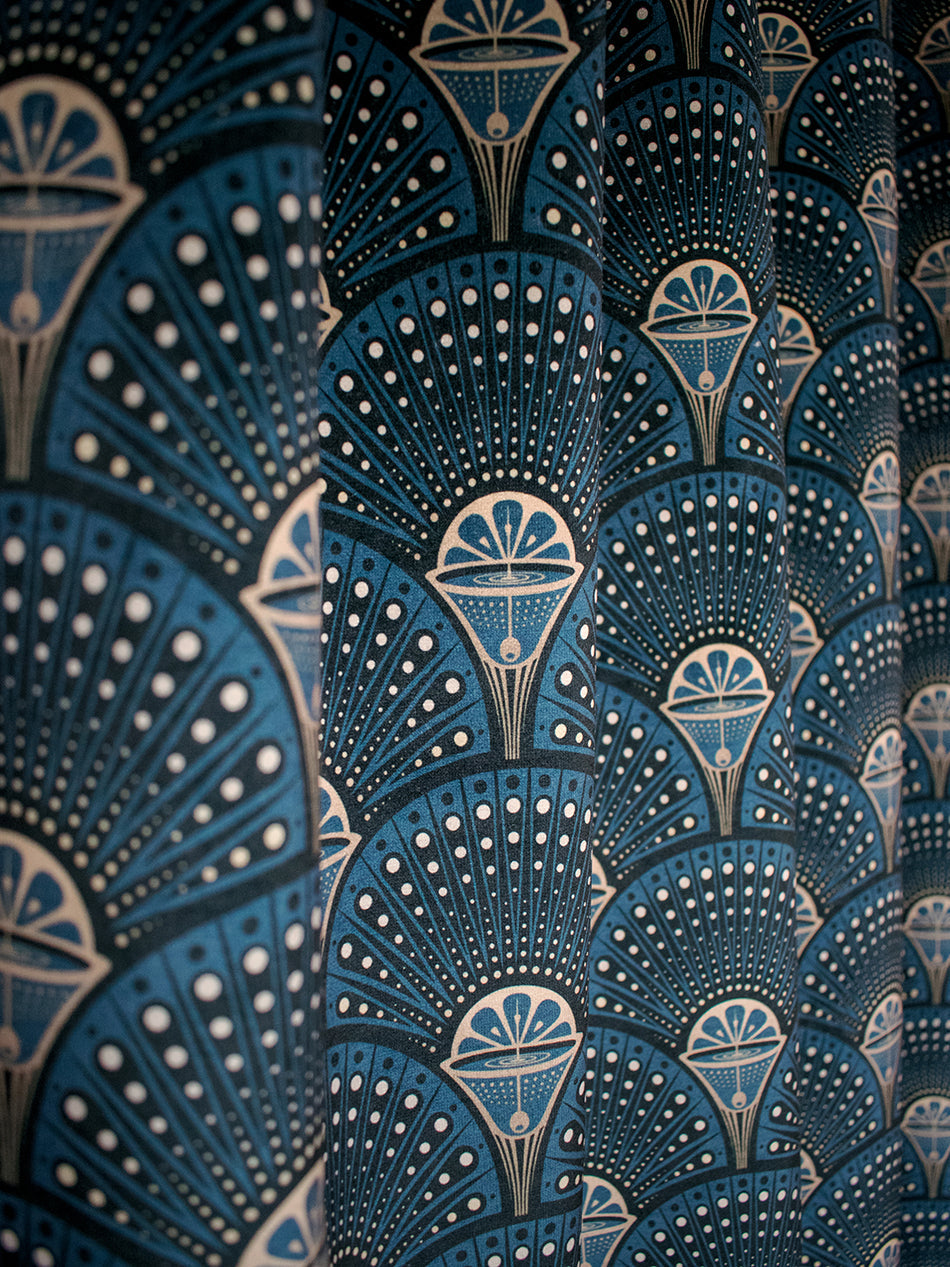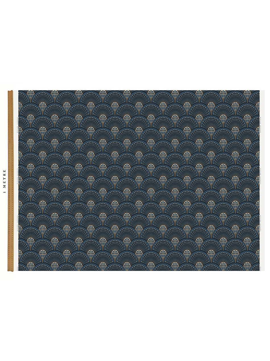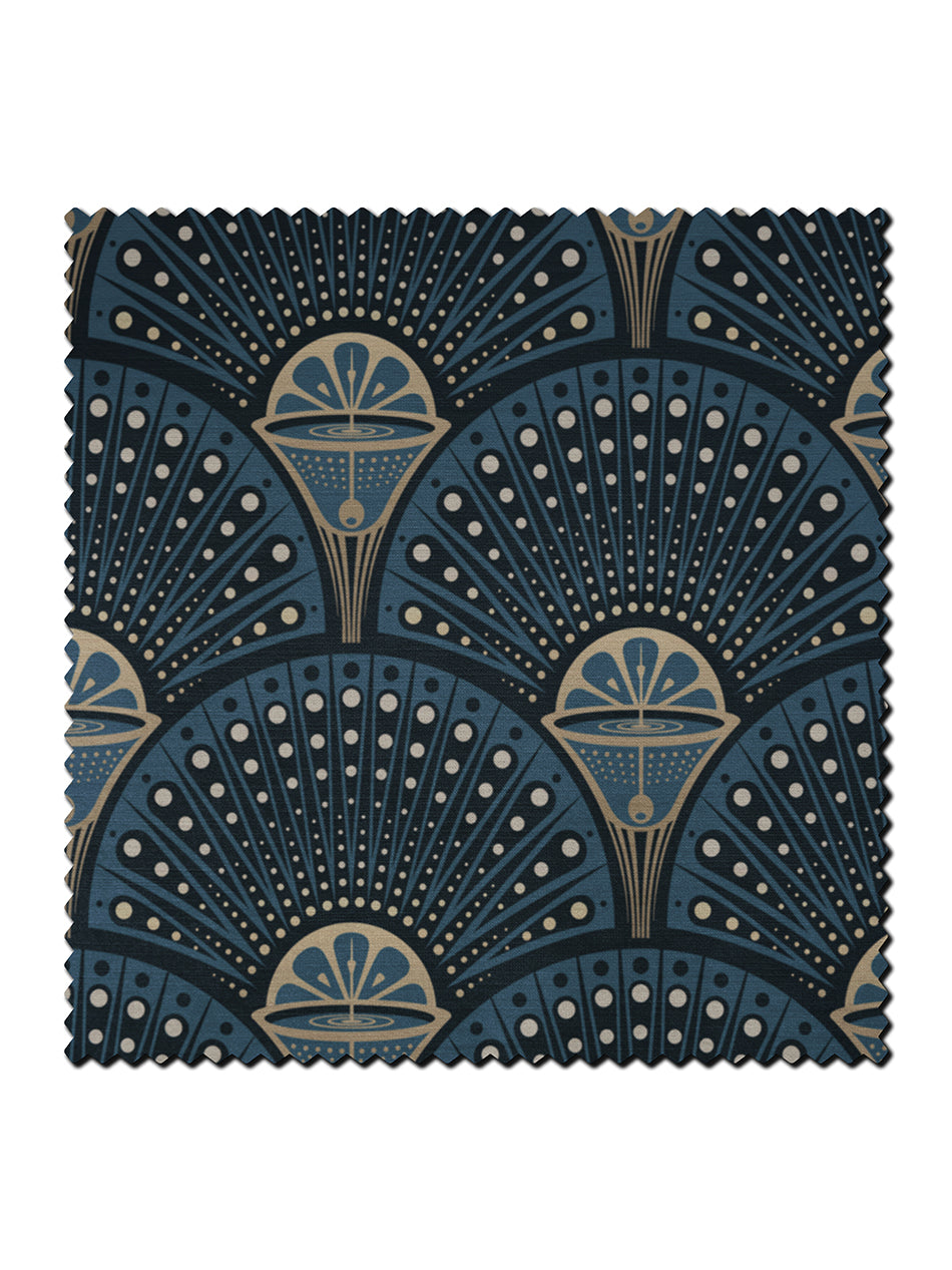 An Art Deco velvet that brings Gatsby glamour to your home. With a striking colour palette of deep blue, black and gold, this works particularly well as sumptuous velvet bedroom curtains, or an exquisite upholstered daybed.