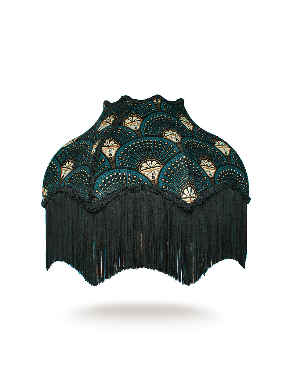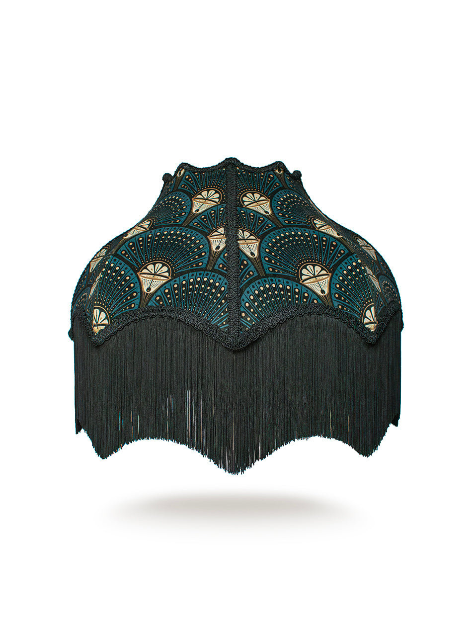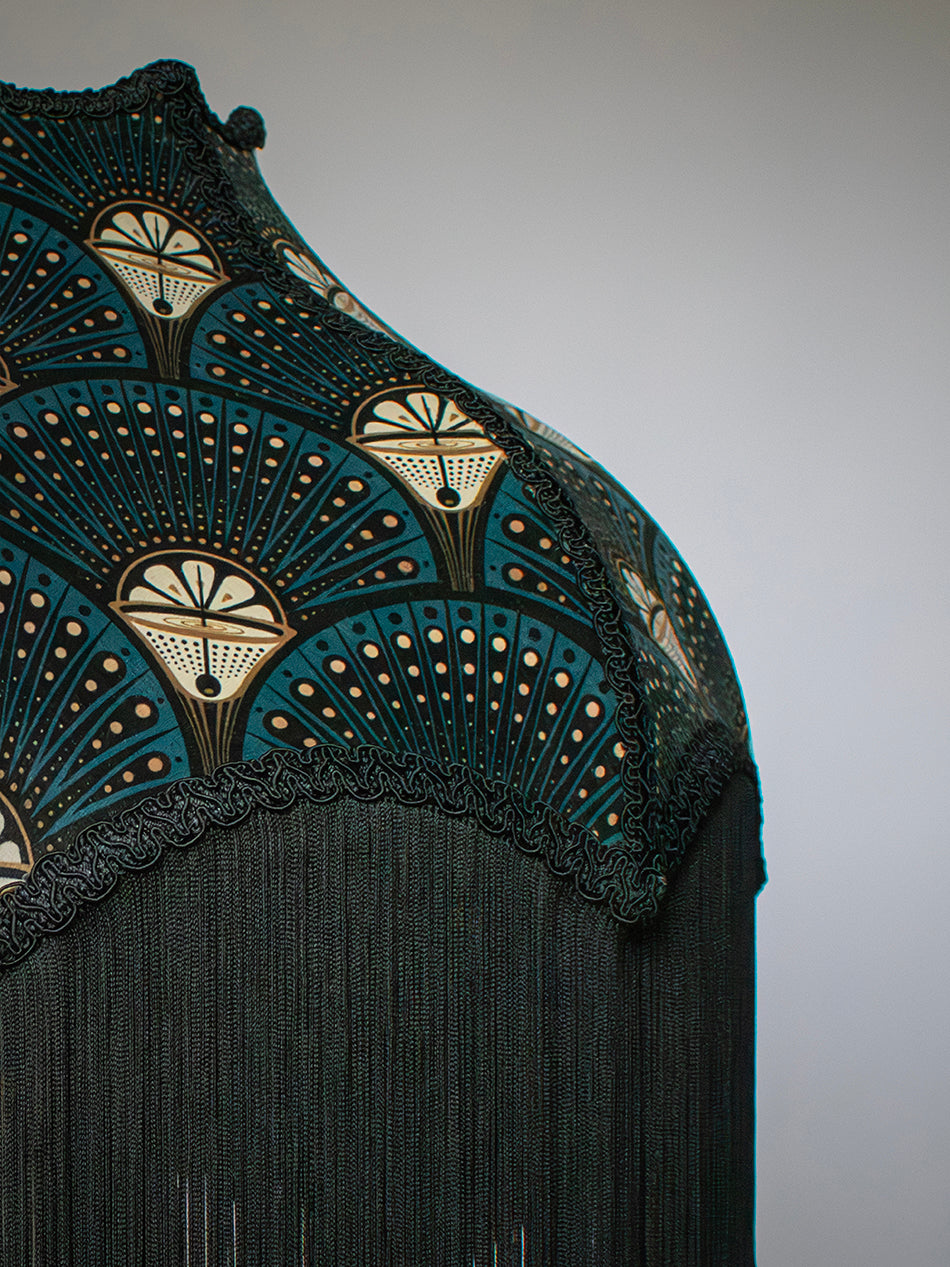 A handmade velvet lampshade in beautiful shades of teal, black and gold, finished with ornate braiding and fringe.