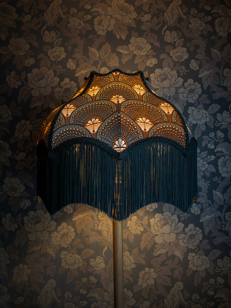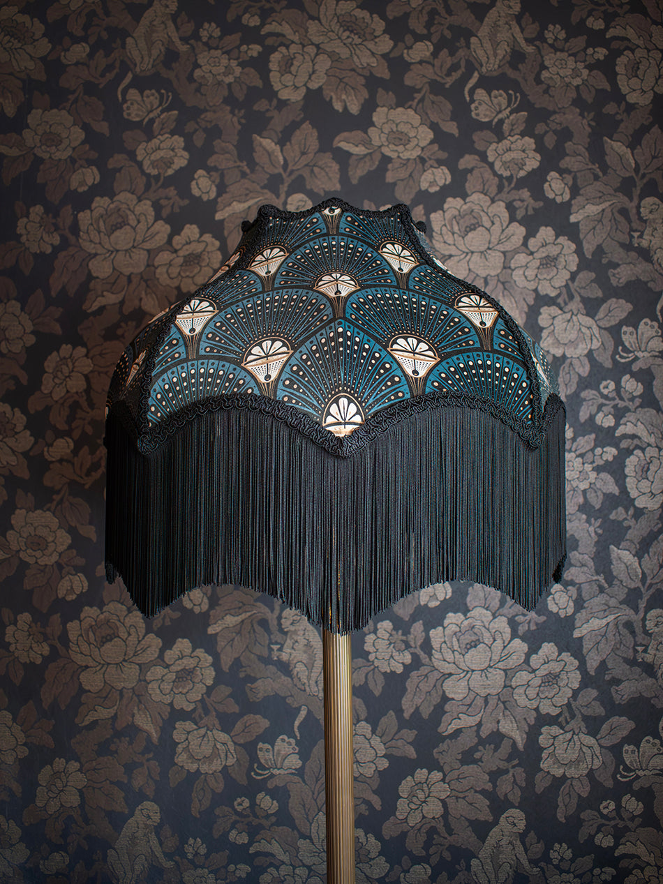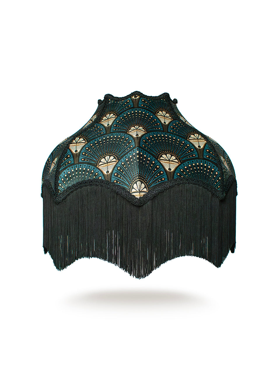 A handmade velvet lampshade in beautiful shades of teal, black and gold, finished with ornate braiding and fringe.