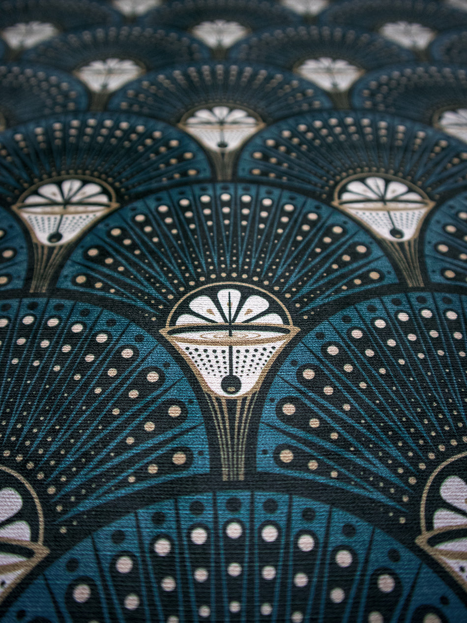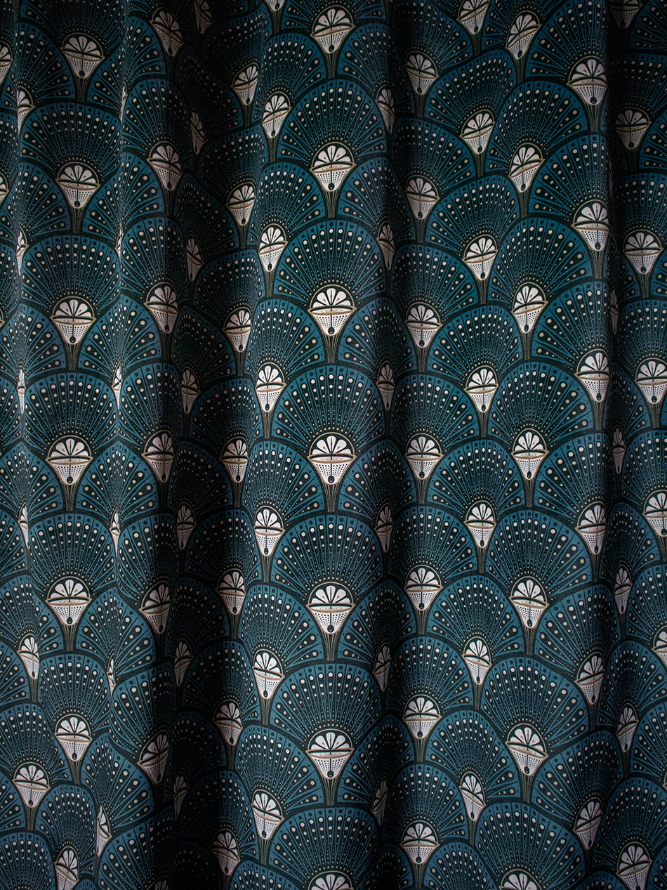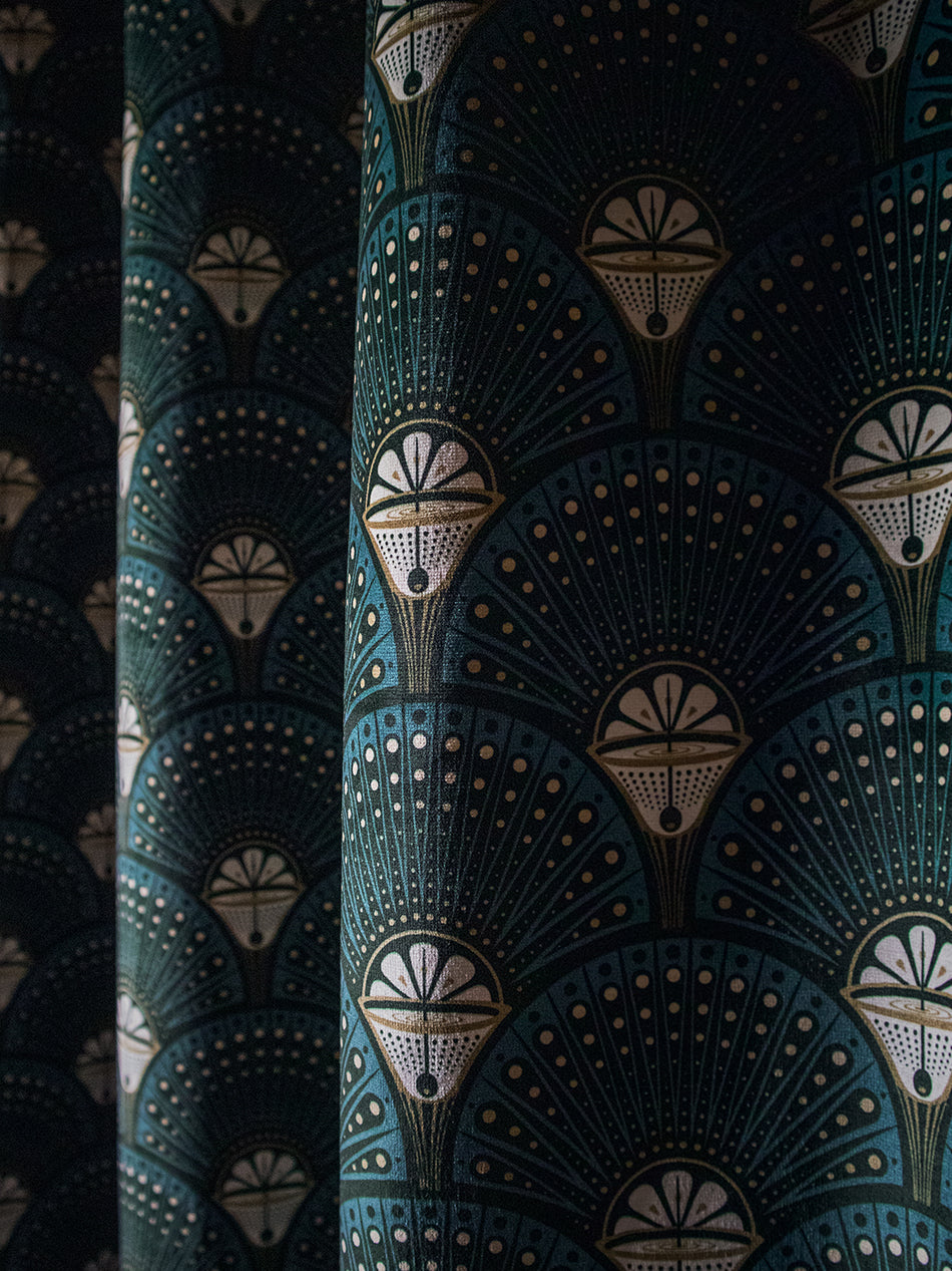 An Art Deco velvet that brings Gatsby glamour to your home. With a vibrant colour palette of teal, black and gold, this works particularly well as sumptuous velvet curtains, or on an upholstered chair.