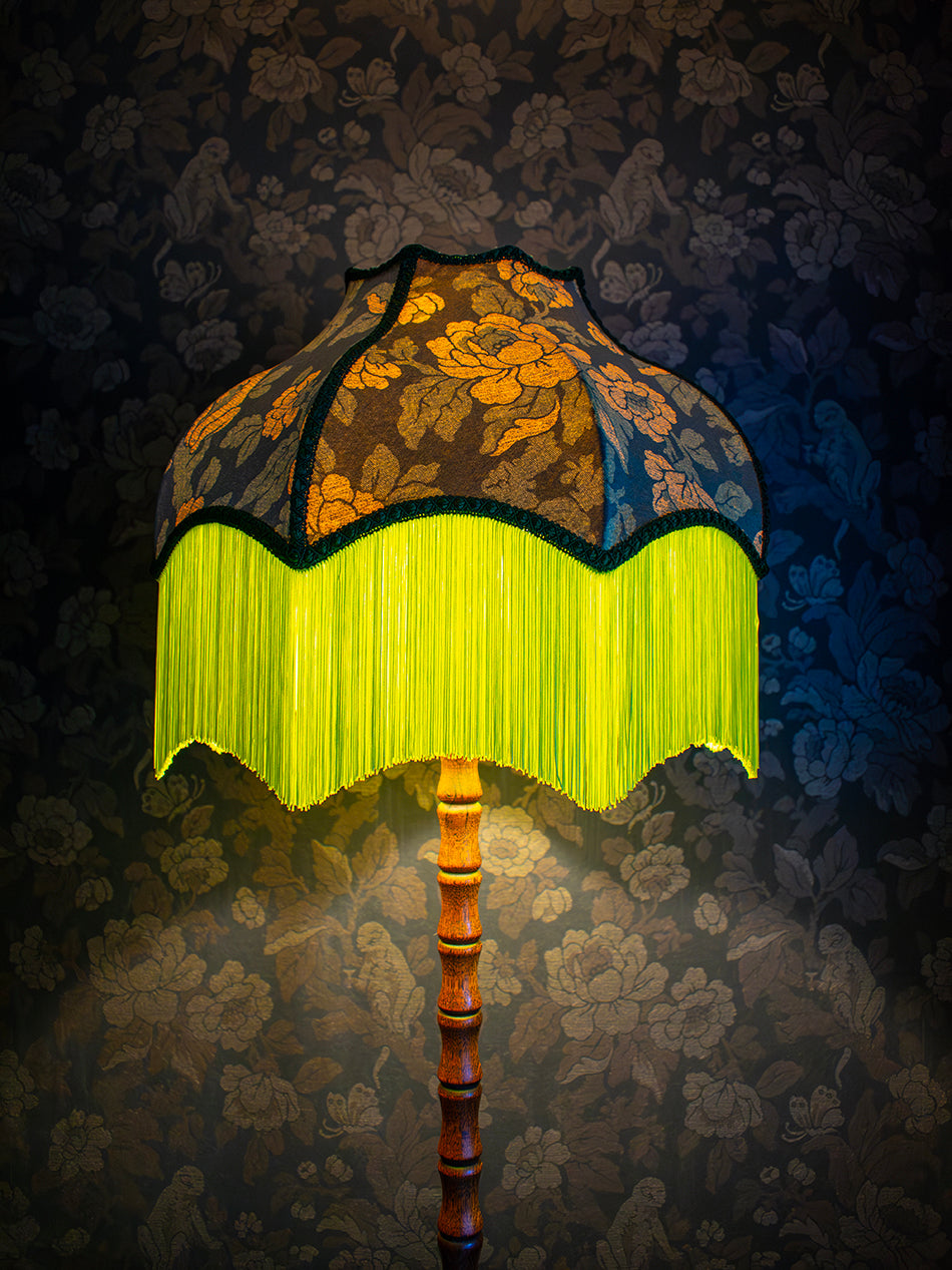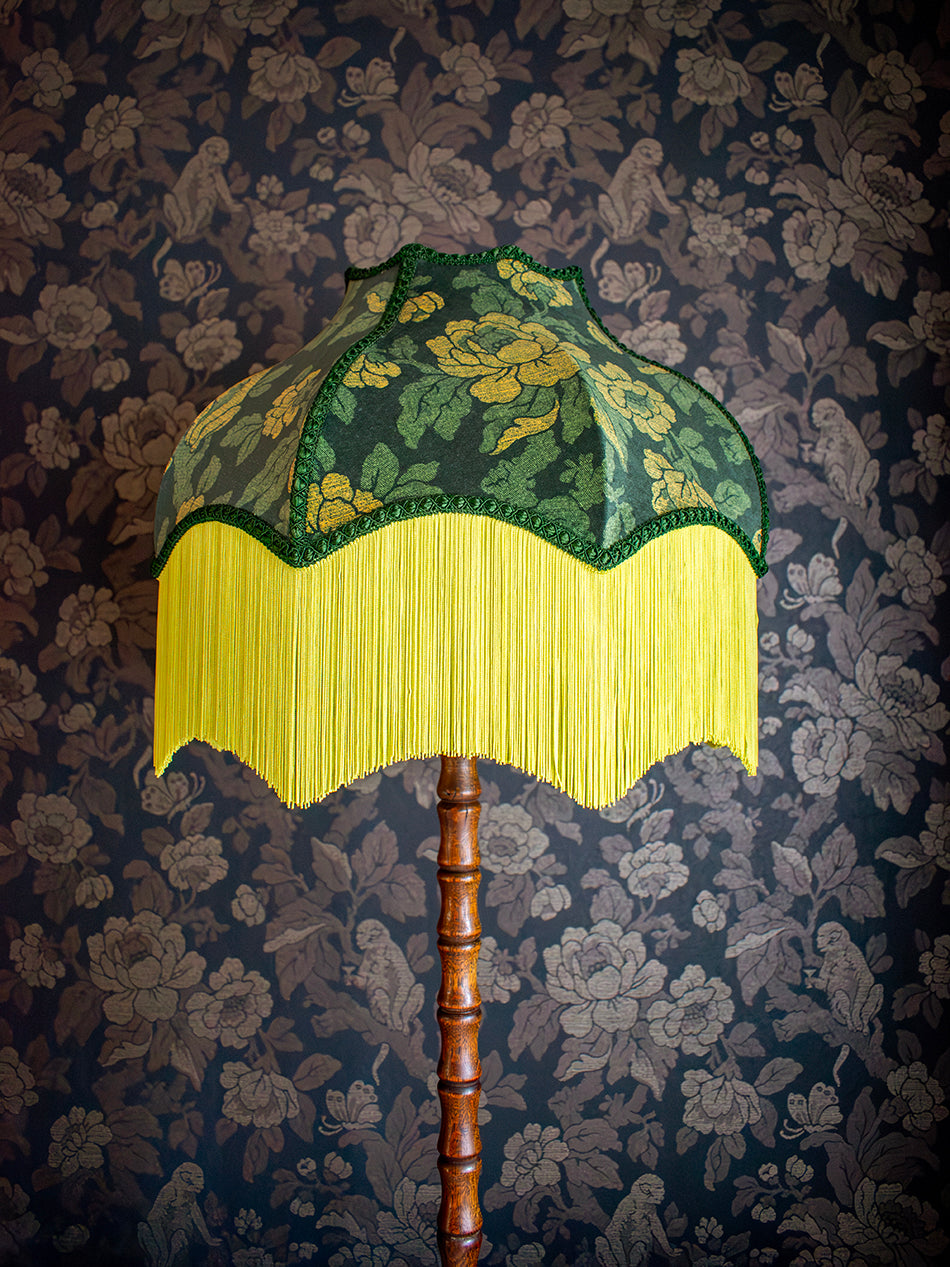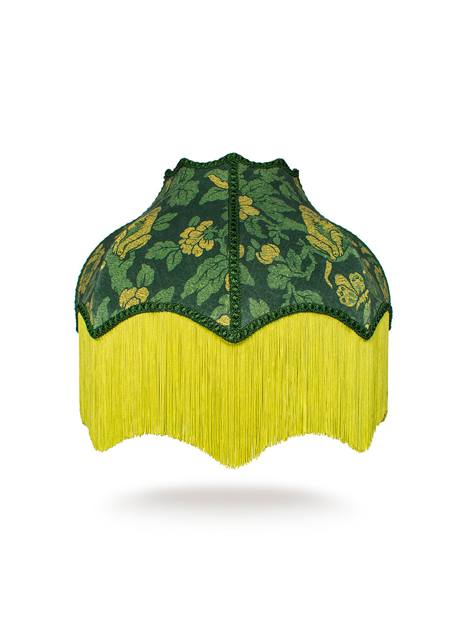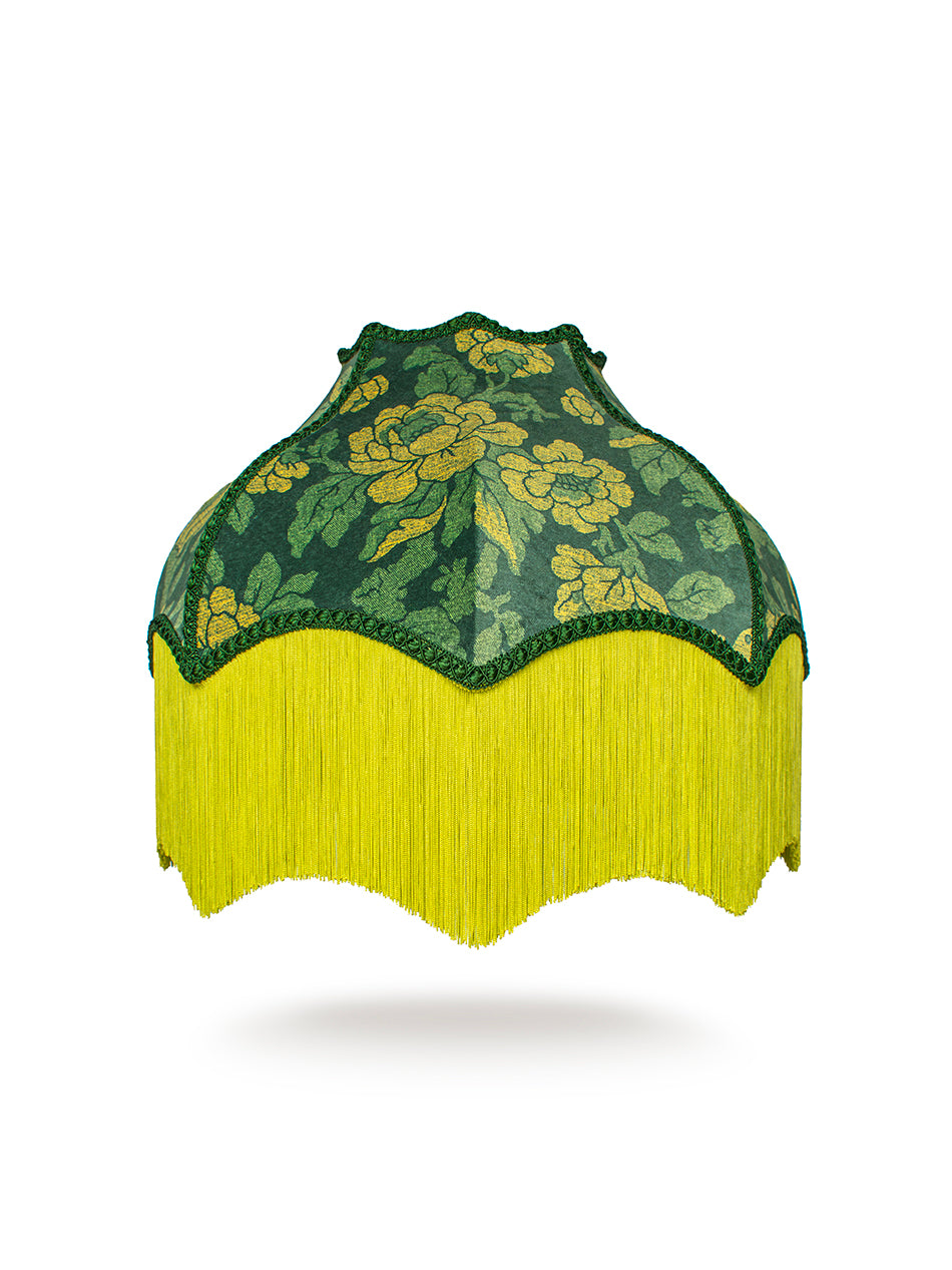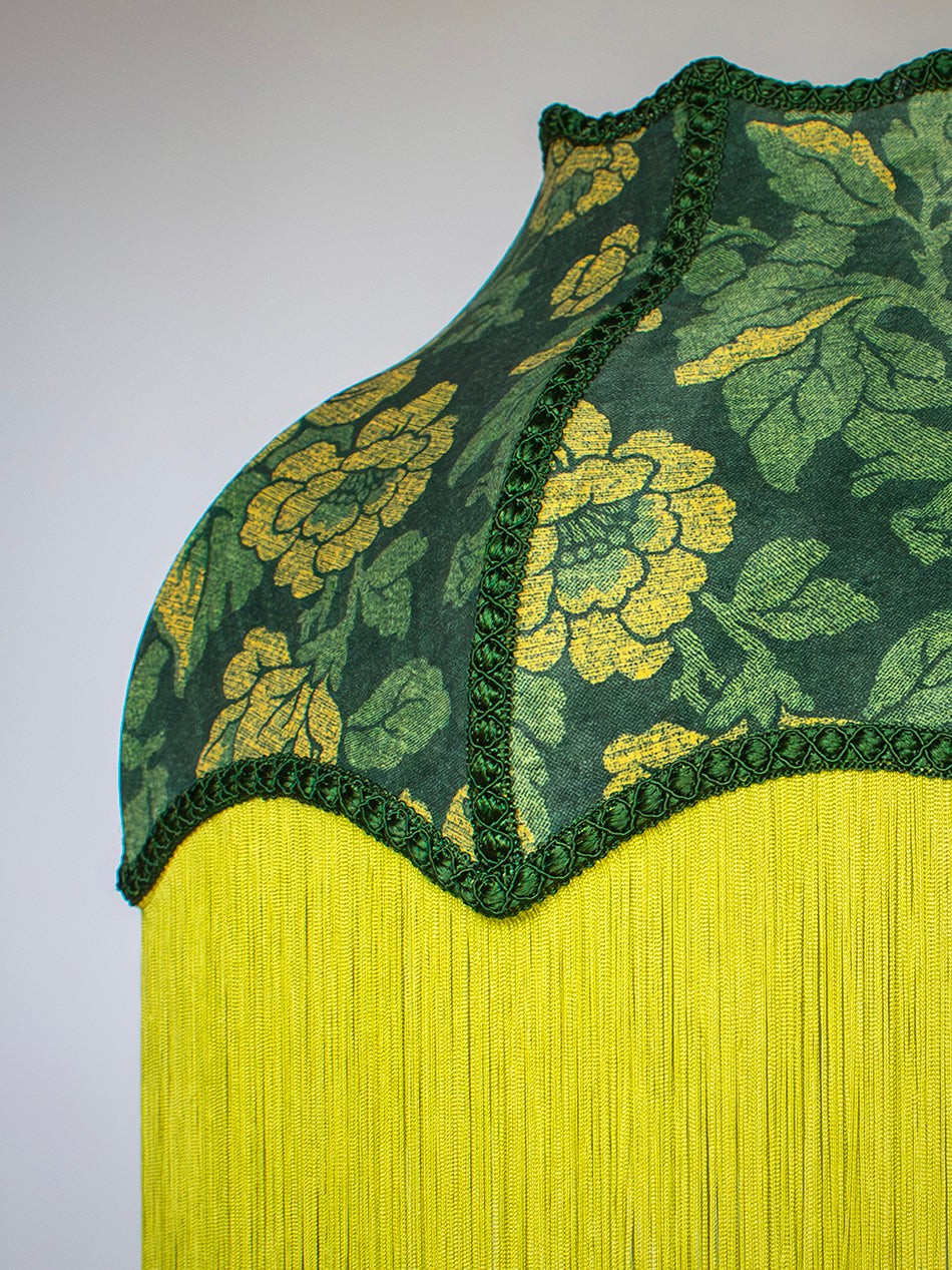 A vibrant Seventies-inspired colour palette for this lampshade, featuring a combination of yellows and greens with gorgeous fringing and delicate braiding.