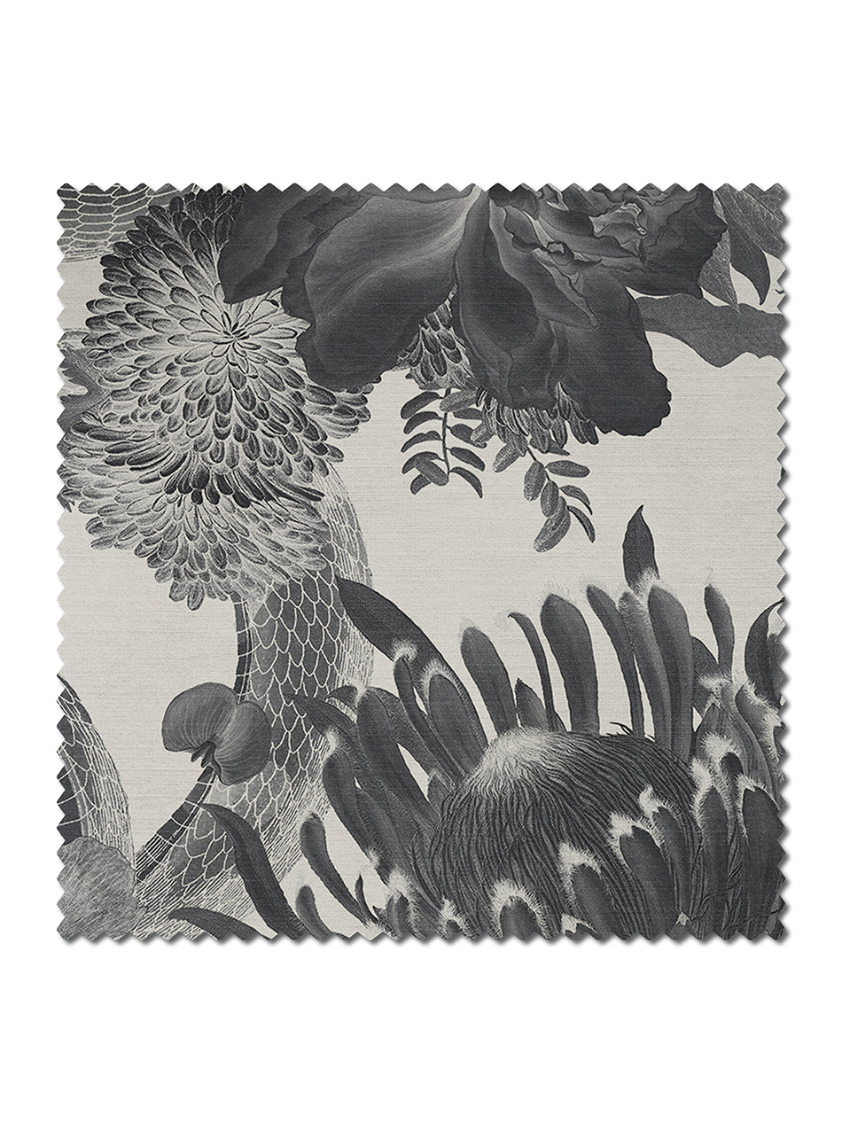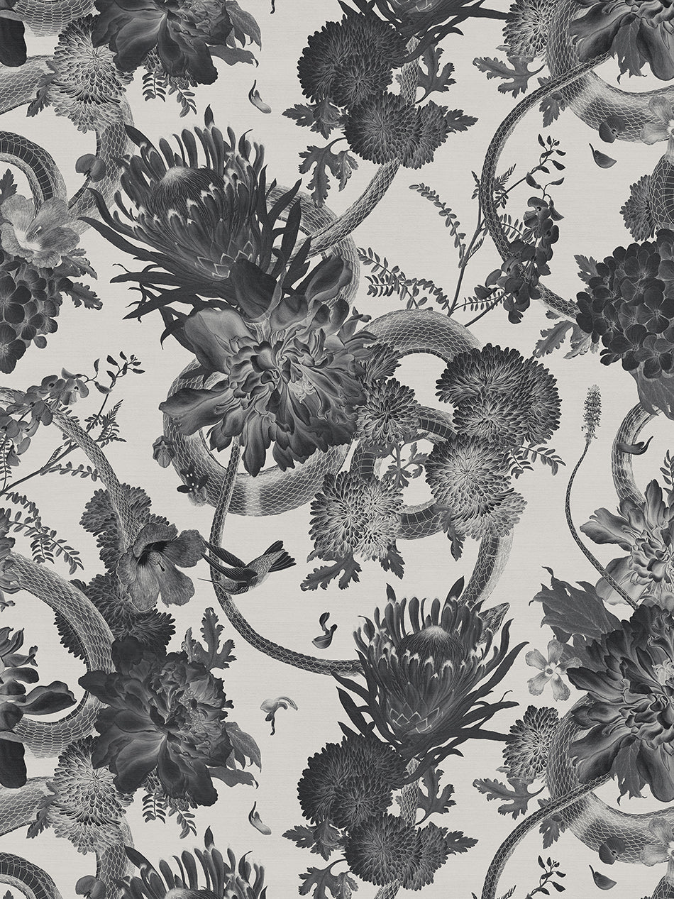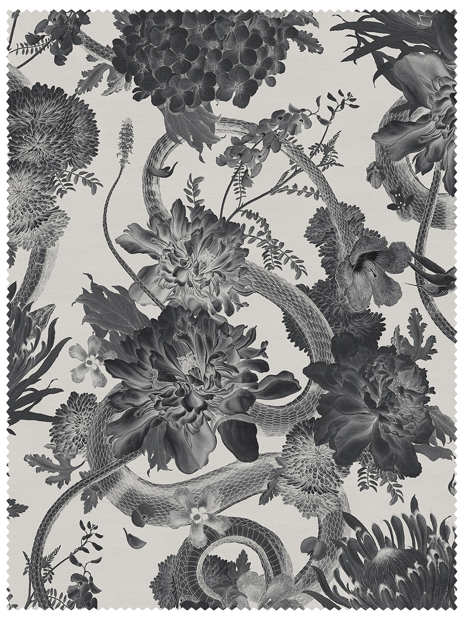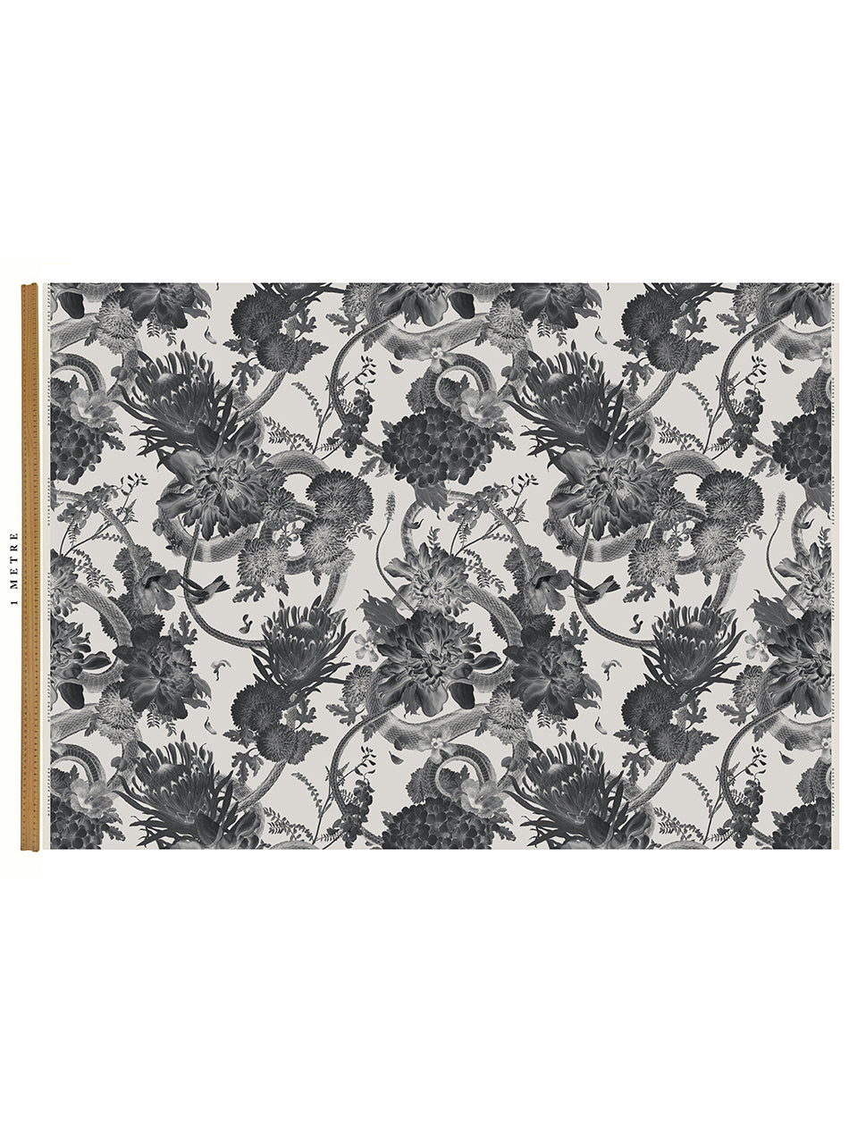 Blending the botanical and reptile collections from The Natural History Museum, this recycled velvet features beautifully illustrated floral blooms mysteriously intertwined with sweeping serpents for a wild and untamed interior. Our 'Monochrome' velvet features an off-white base with details in a sublime palette of greys and blacks which we love using for luxuriously dramatic velvet curtains.