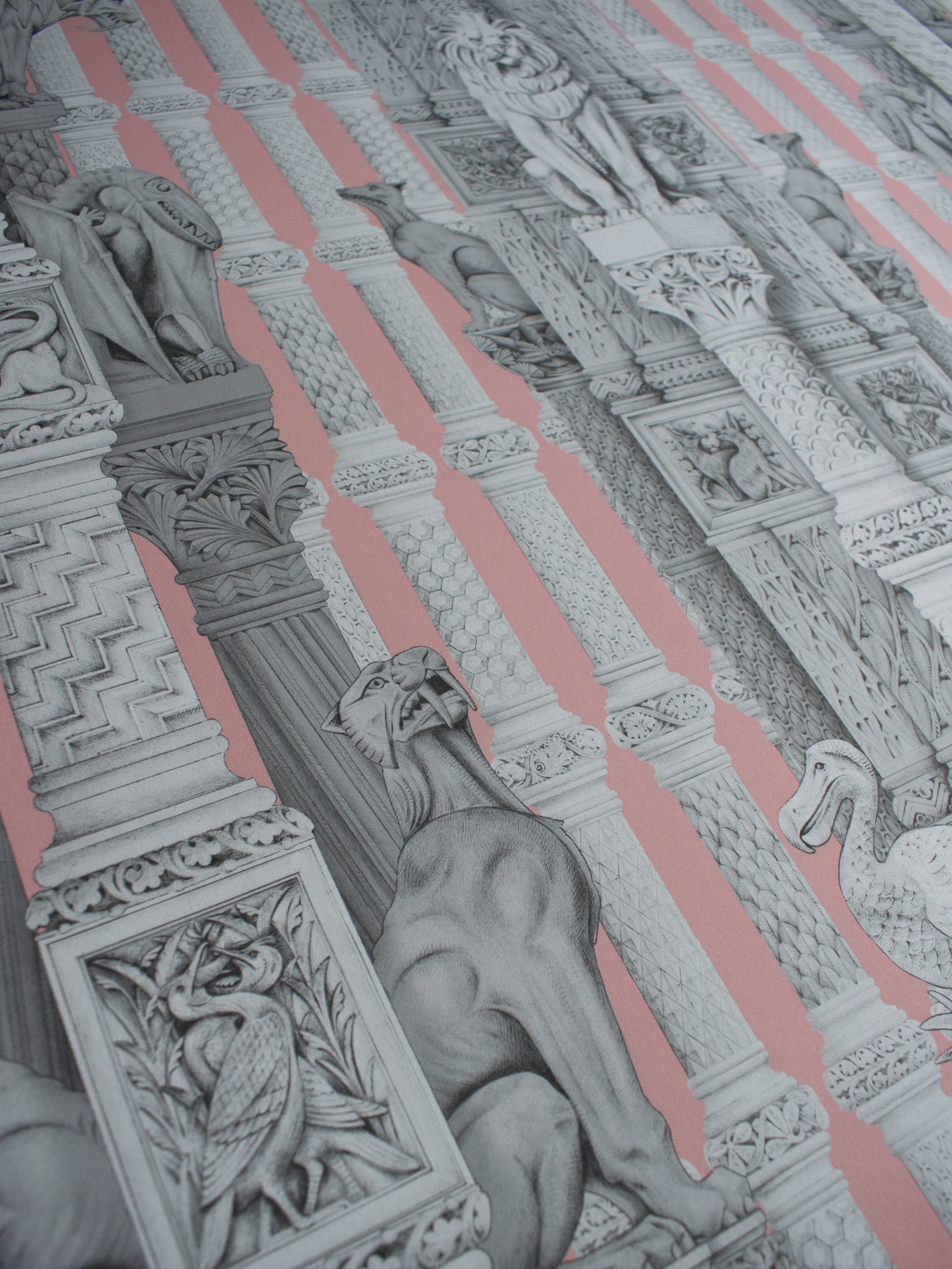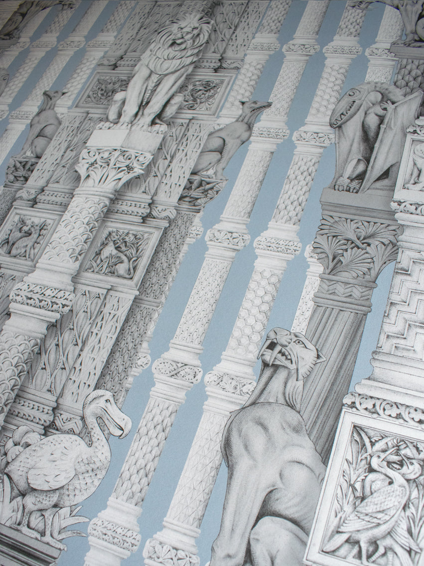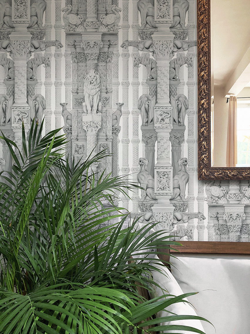 Hierarchy celebrates the intricately carved stonework that adorns the exterior of London’s Natural History Museum to create a striking wallcovering full of architectural splendour as well as the incredible natural world. The gargoyles featured here are not grotesque or of mythological form, but rather intricately carved animals, with a proud lion taking centre stage.