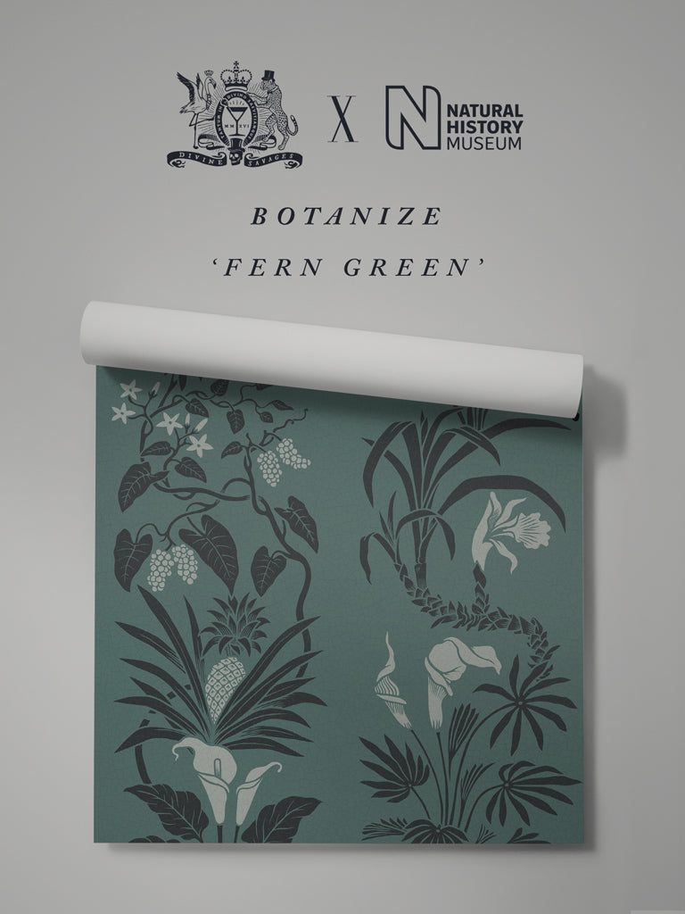 Inspired by the ‘Cathedral to Nature’ at London’s Natural History Museum – the iconic great hall. Most visitors miss the spectacular vaulted ceiling, adorned with 162 illustrated panels showing plants from across the world discovered during the epic adventures undertaken by the great explorers. Our Botanize wallpaper celebrates these illustrations that were a tribute both to the immense diversity of life on Earth, and those working to protect it.