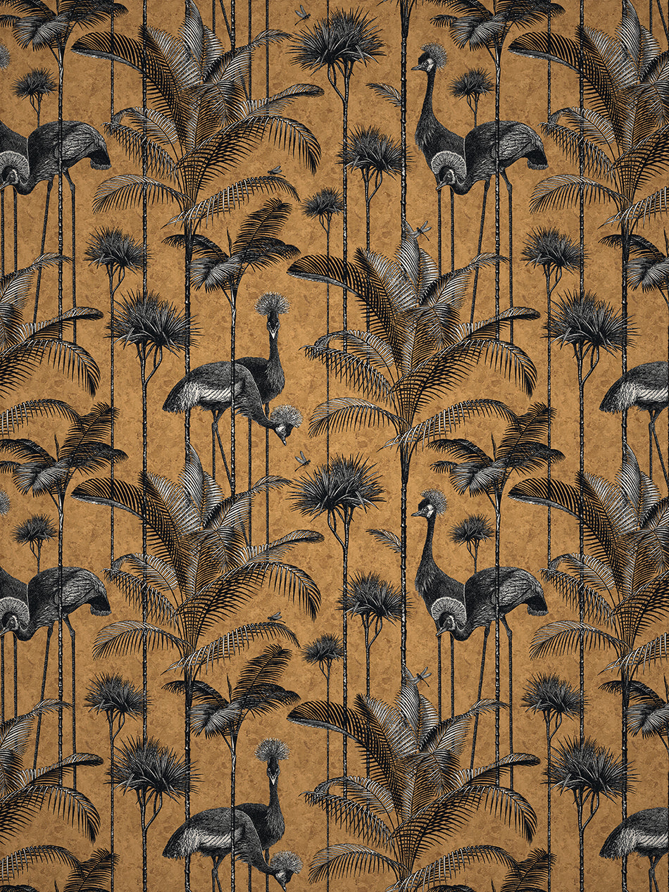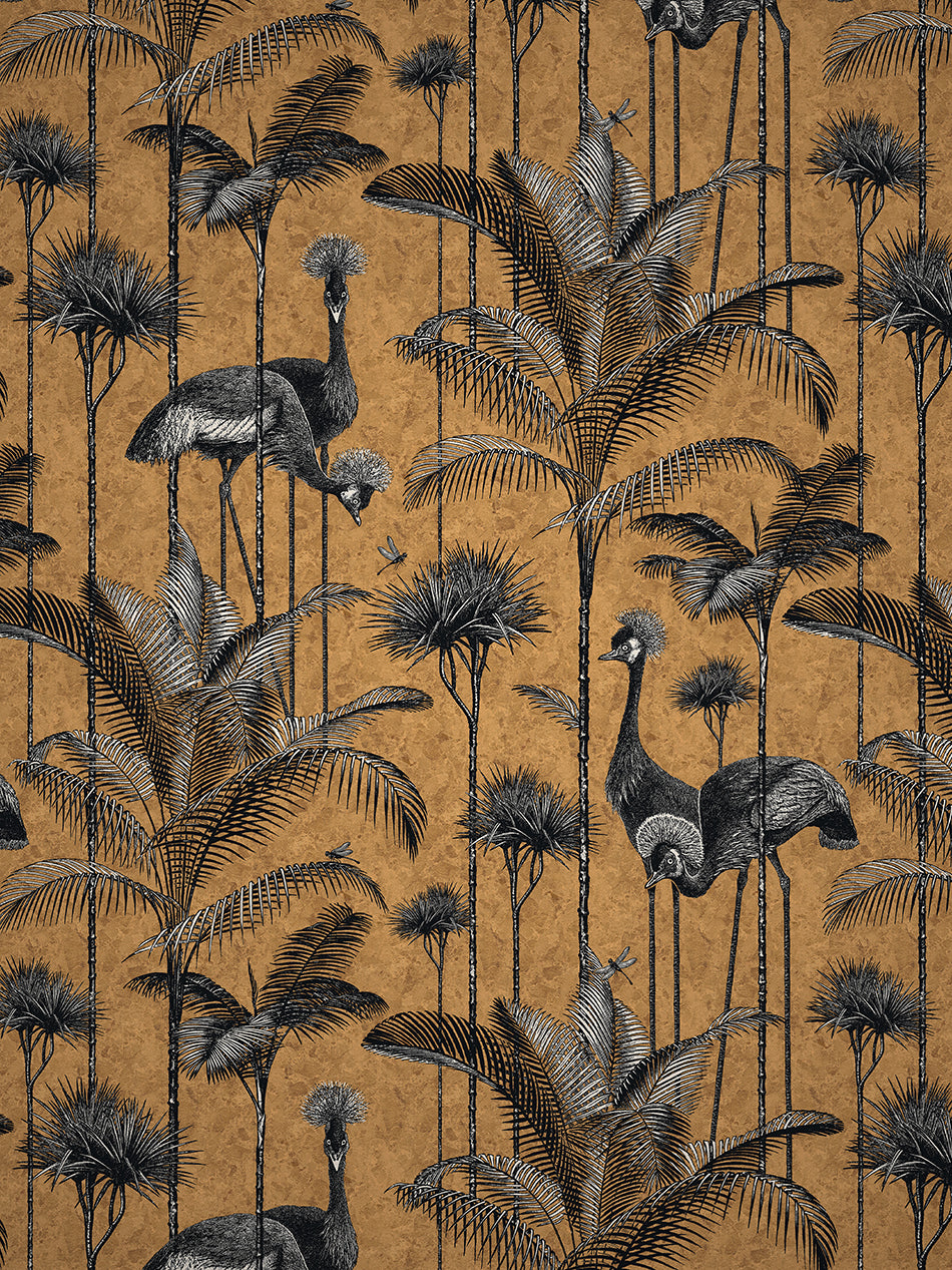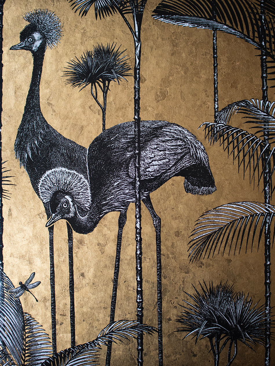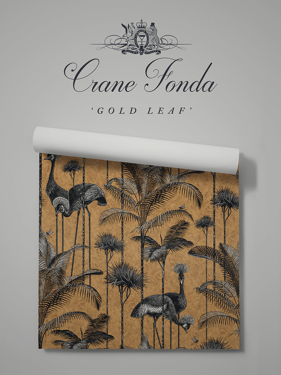 A stunningly flamboyant gold leaf wallpaper that we love to use as a fabulous feature wallpaper featuring the fabulous Grey Crowned Crane amongst lush palm trees.