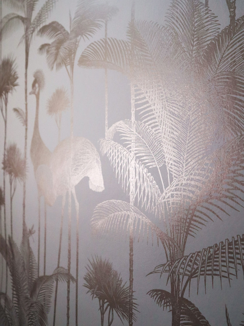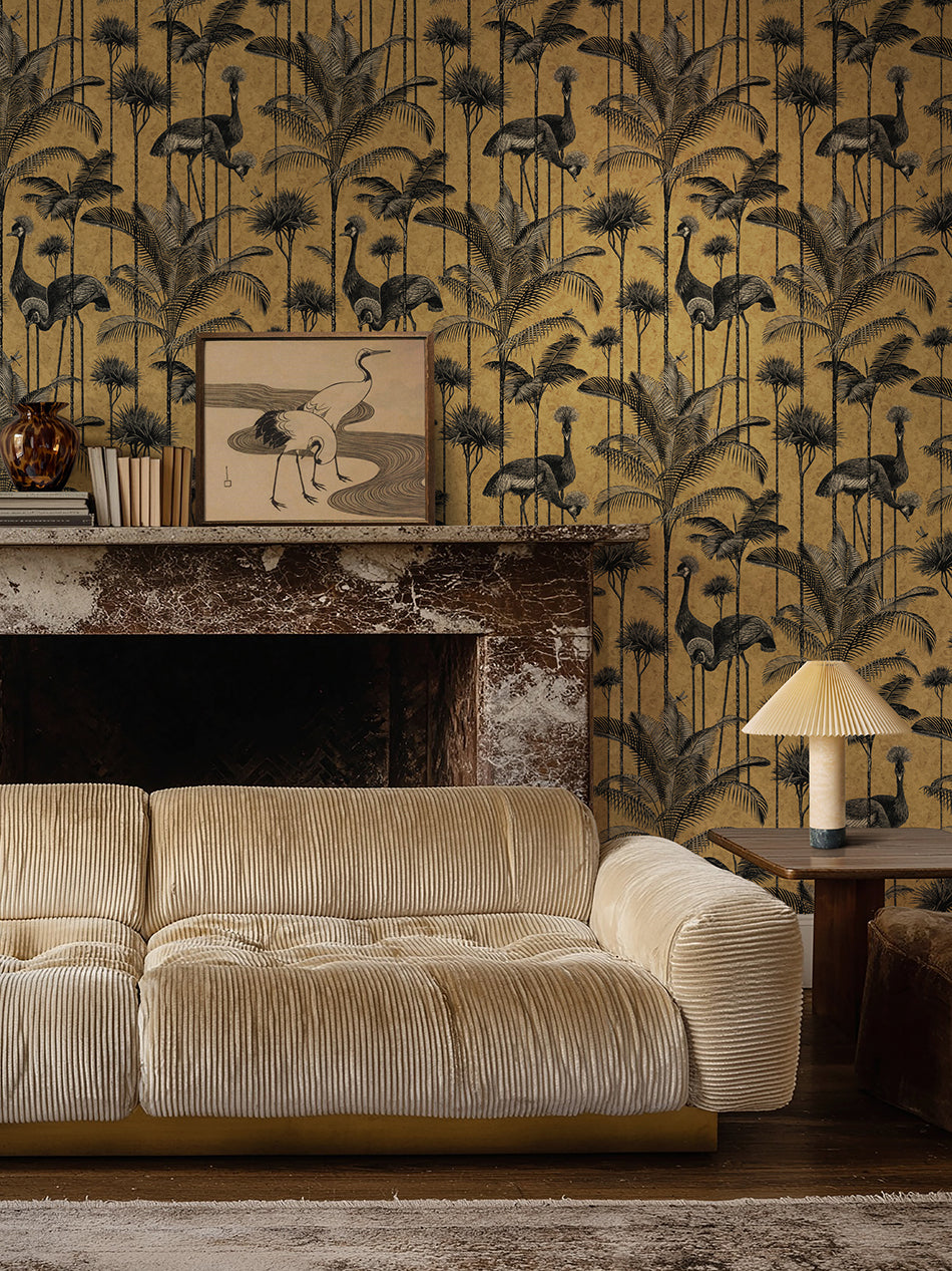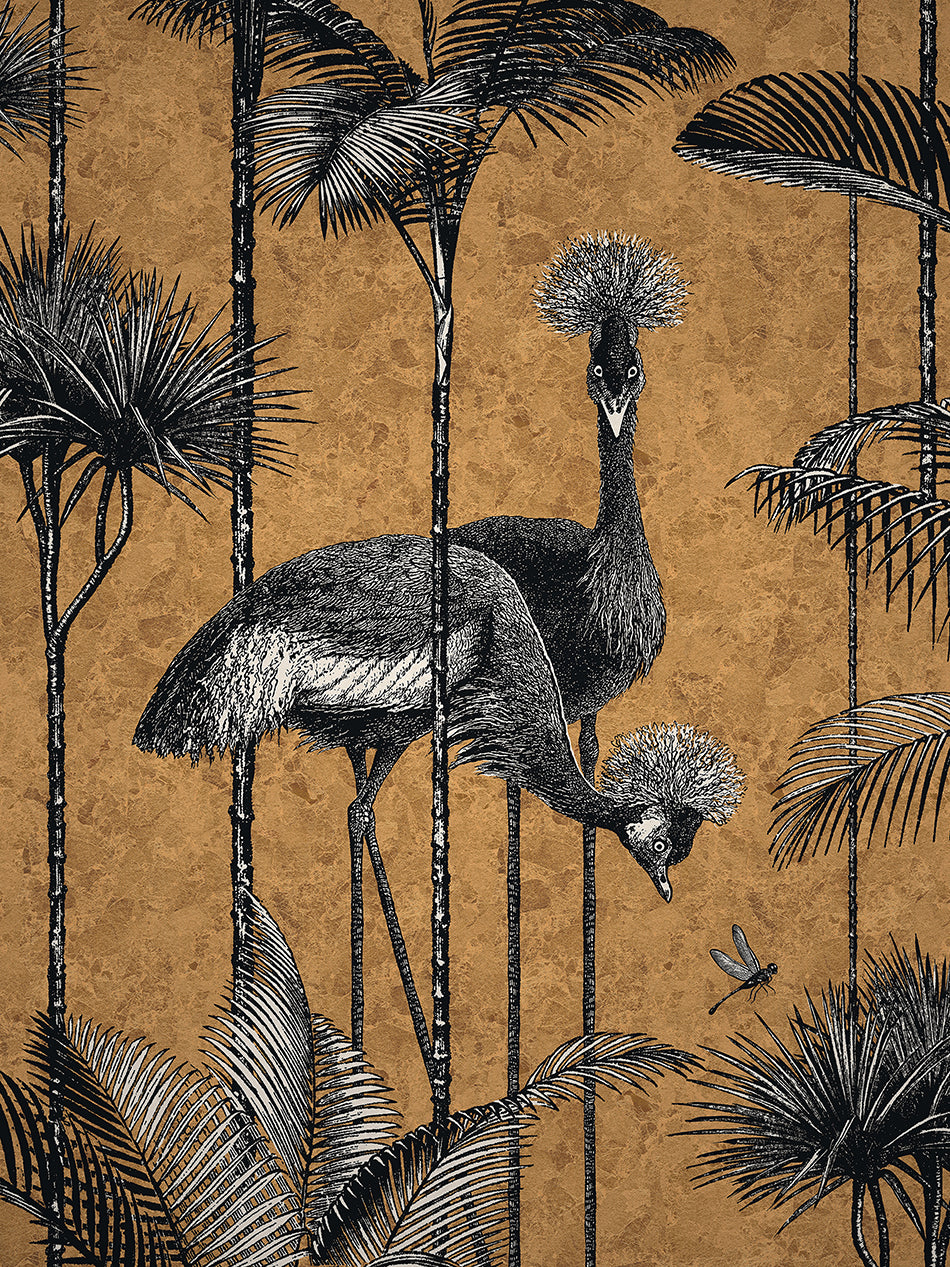 A stunningly flamboyant gold leaf wallpaper that we love to use as a fabulous feature wallpaper featuring the fabulous Grey Crowned Crane amongst lush palm trees.