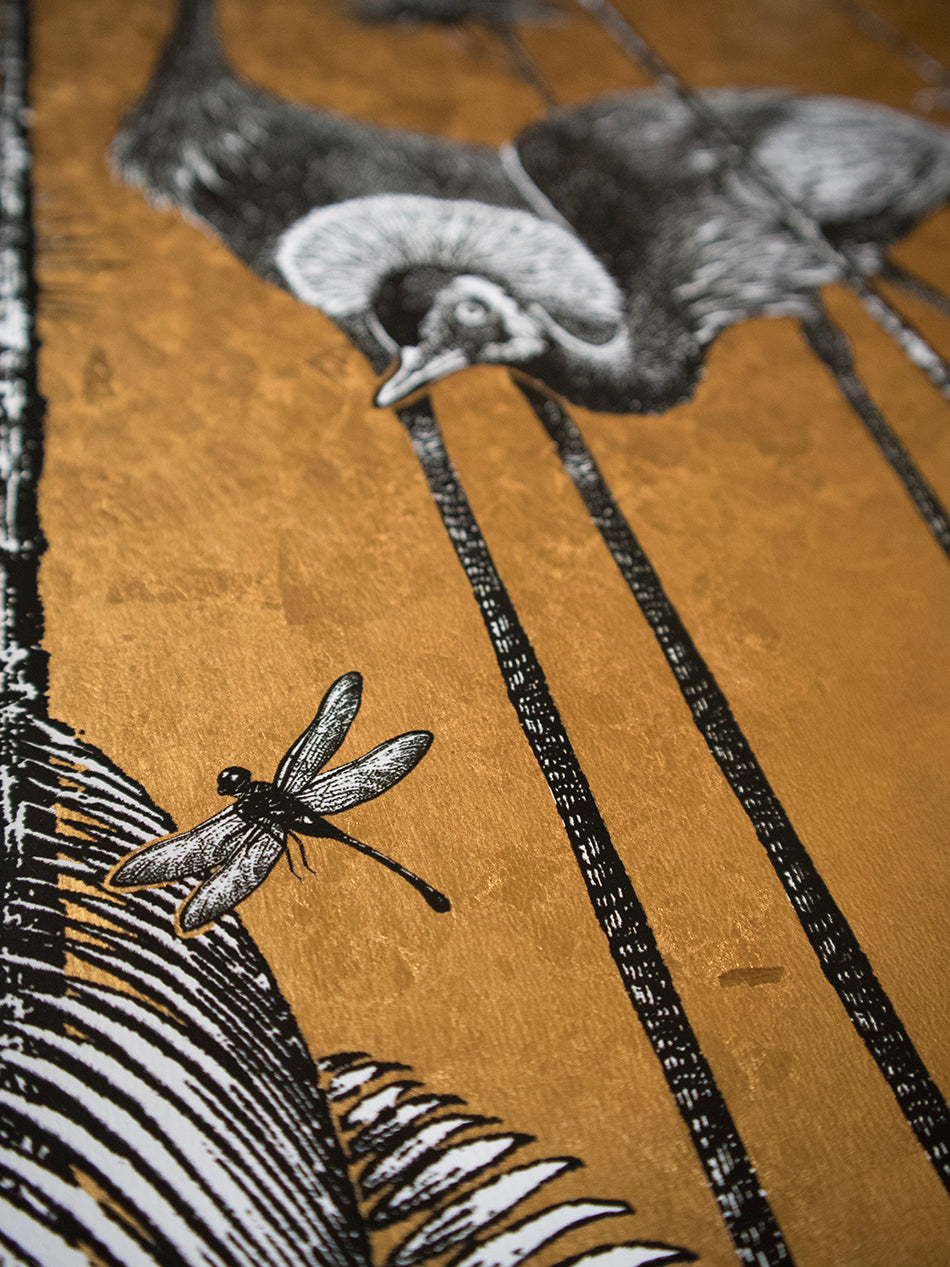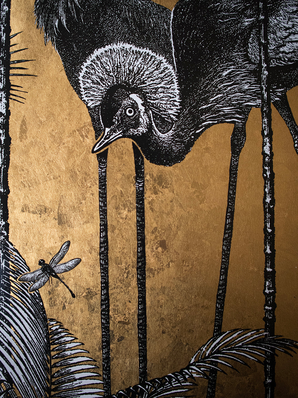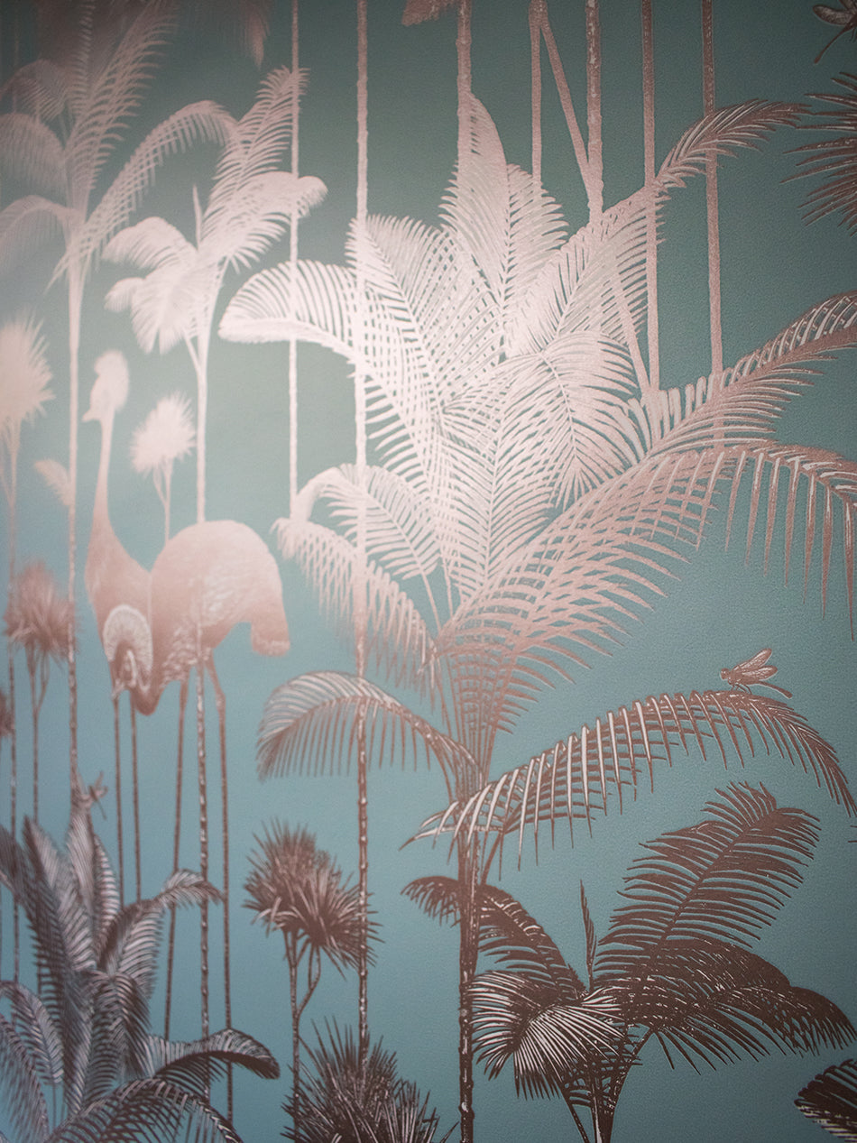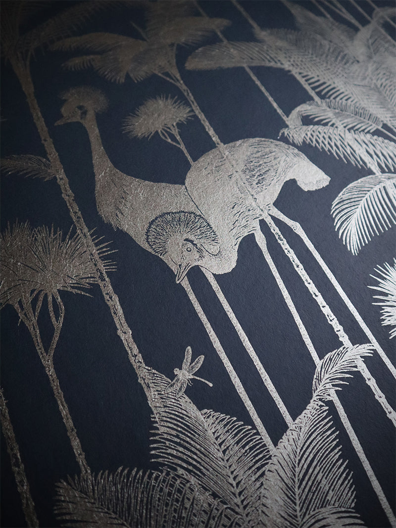 A stunningly flamboyant gold leaf wallpaper that we love to use as a fabulous feature wallpaper featuring the fabulous Grey Crowned Crane amongst lush palm trees.