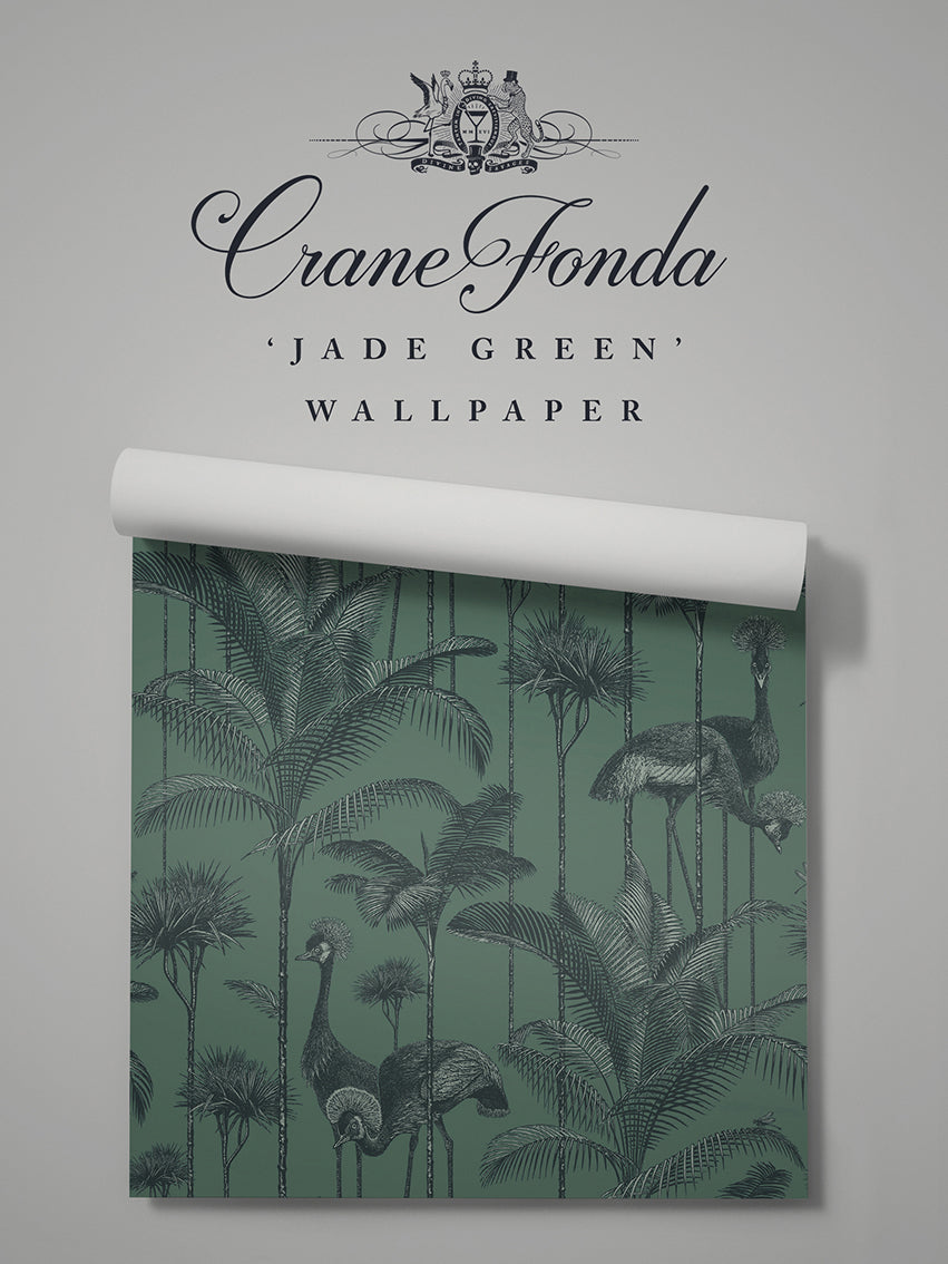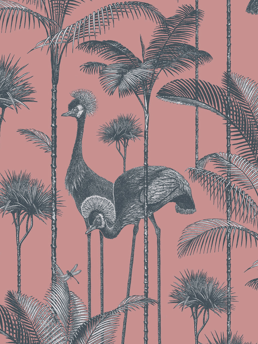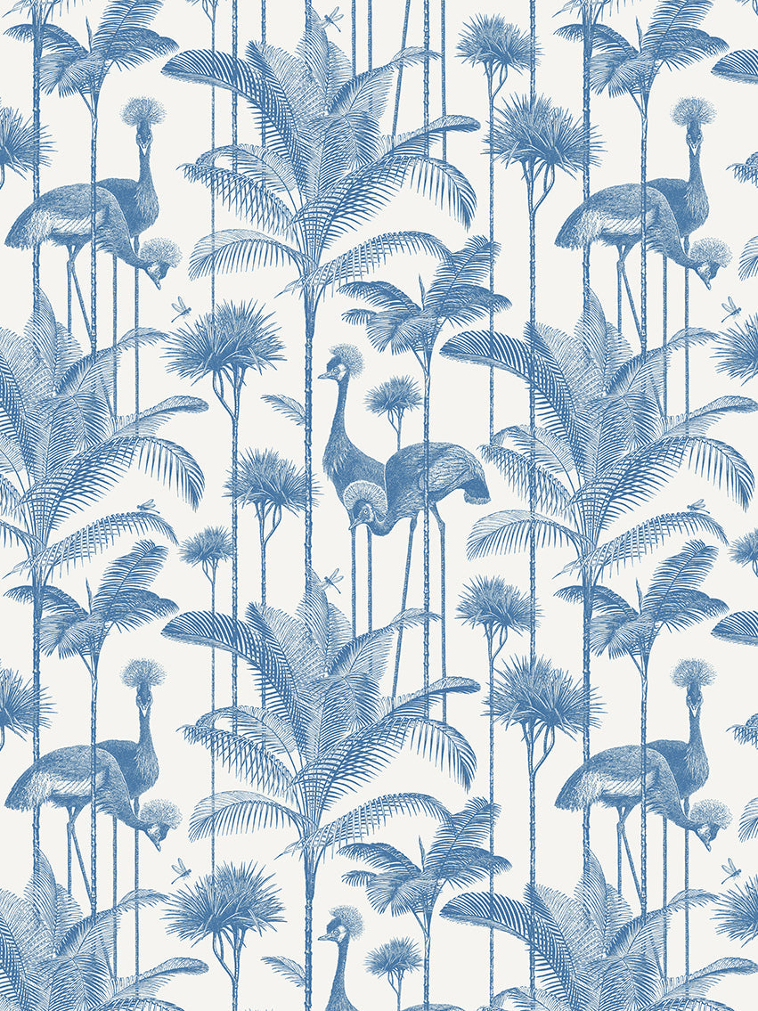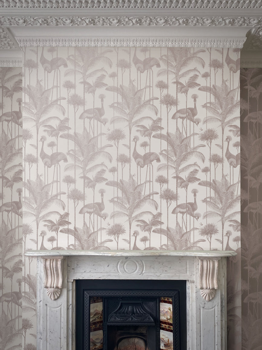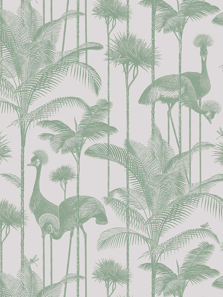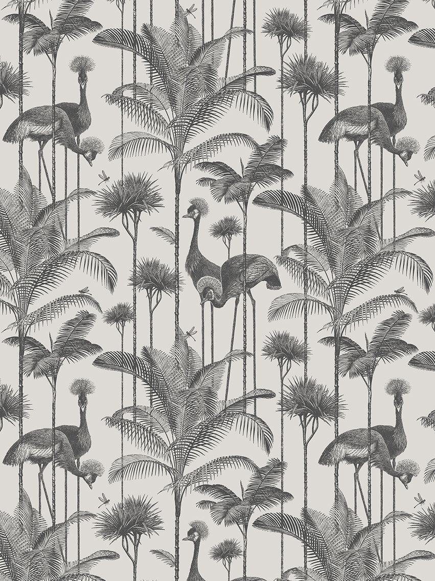 Our iconic Crane Fonda wallpaper features the elegantly fabulous Grey Crowned Crane amongst lush palm fronds for a fresh and breezy interior.