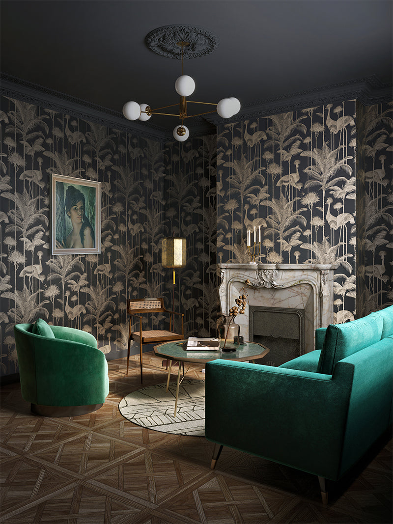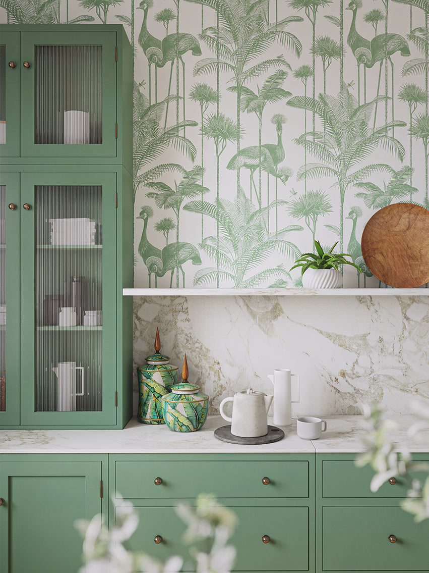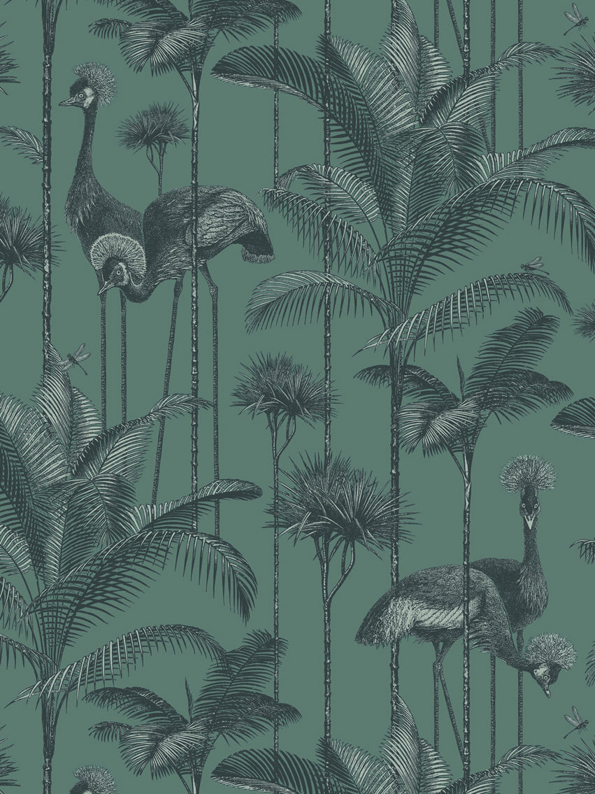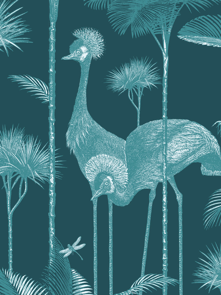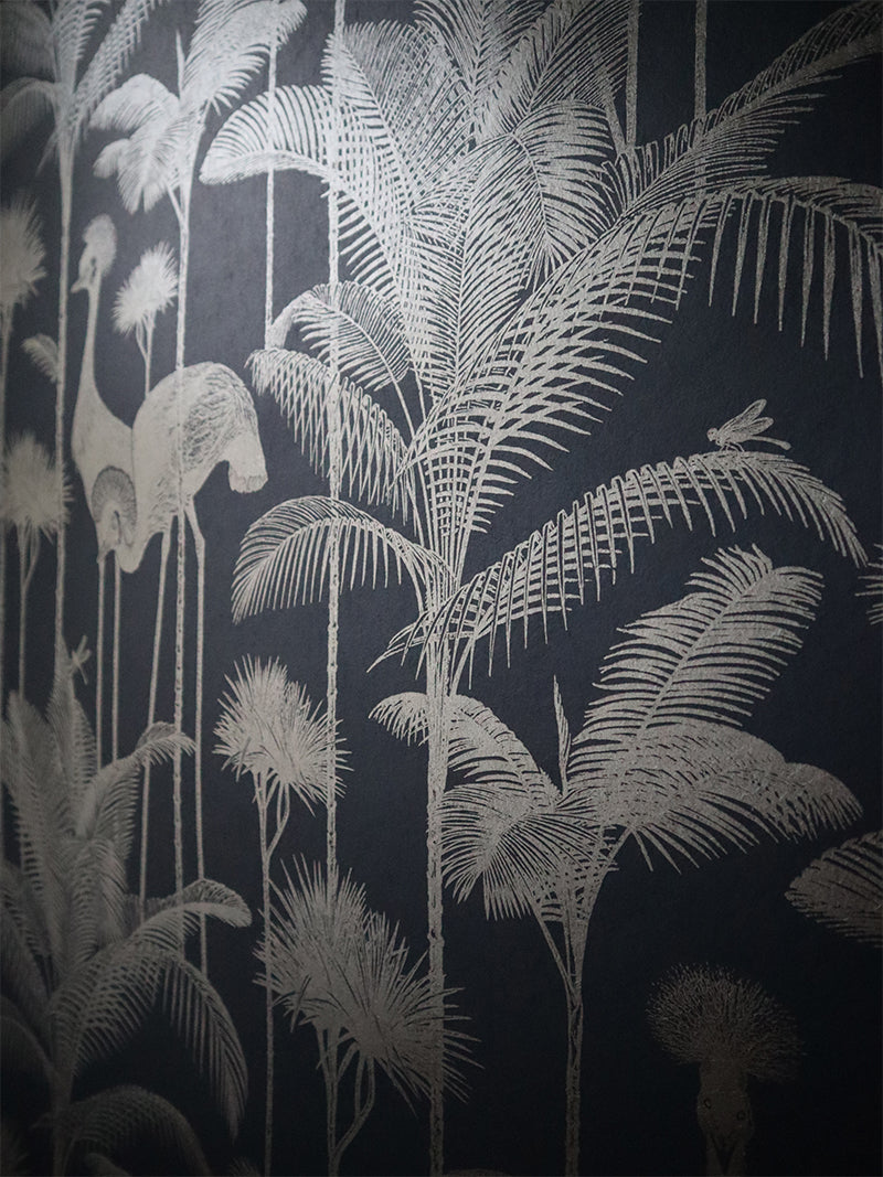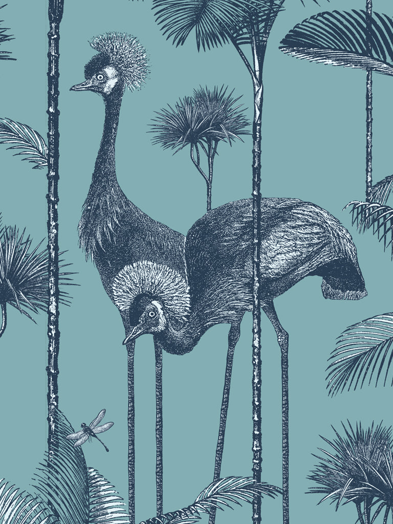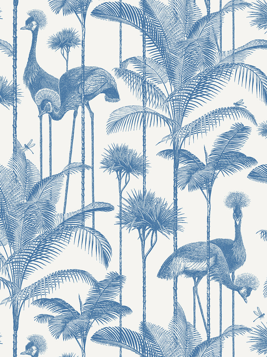 Our iconic Crane Fonda wallpaper features the elegantly fabulous Grey Crowned Crane amongst lush palm fronds for a fresh and breezy interior.