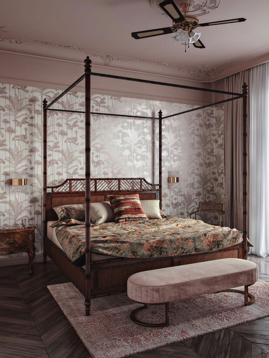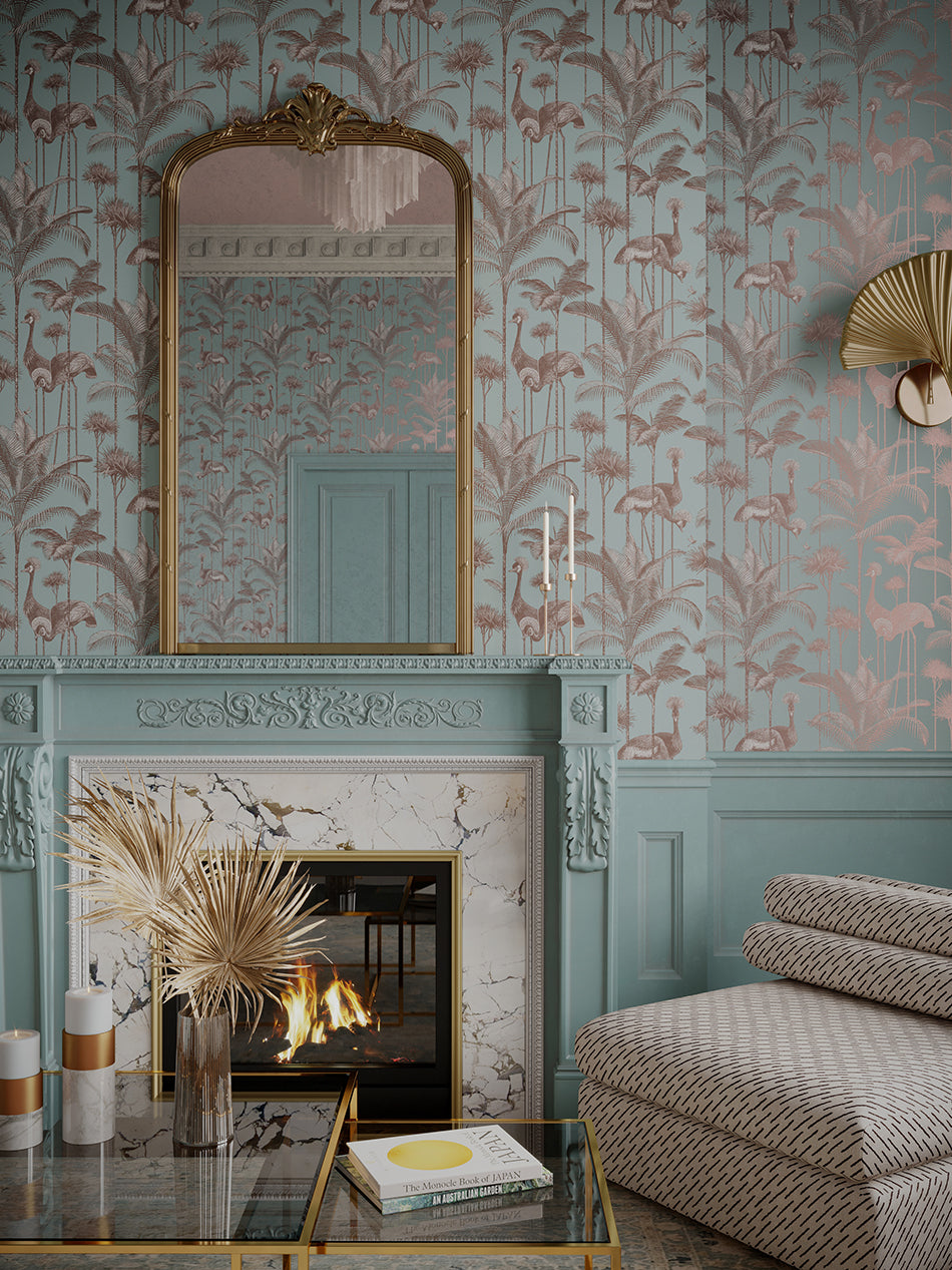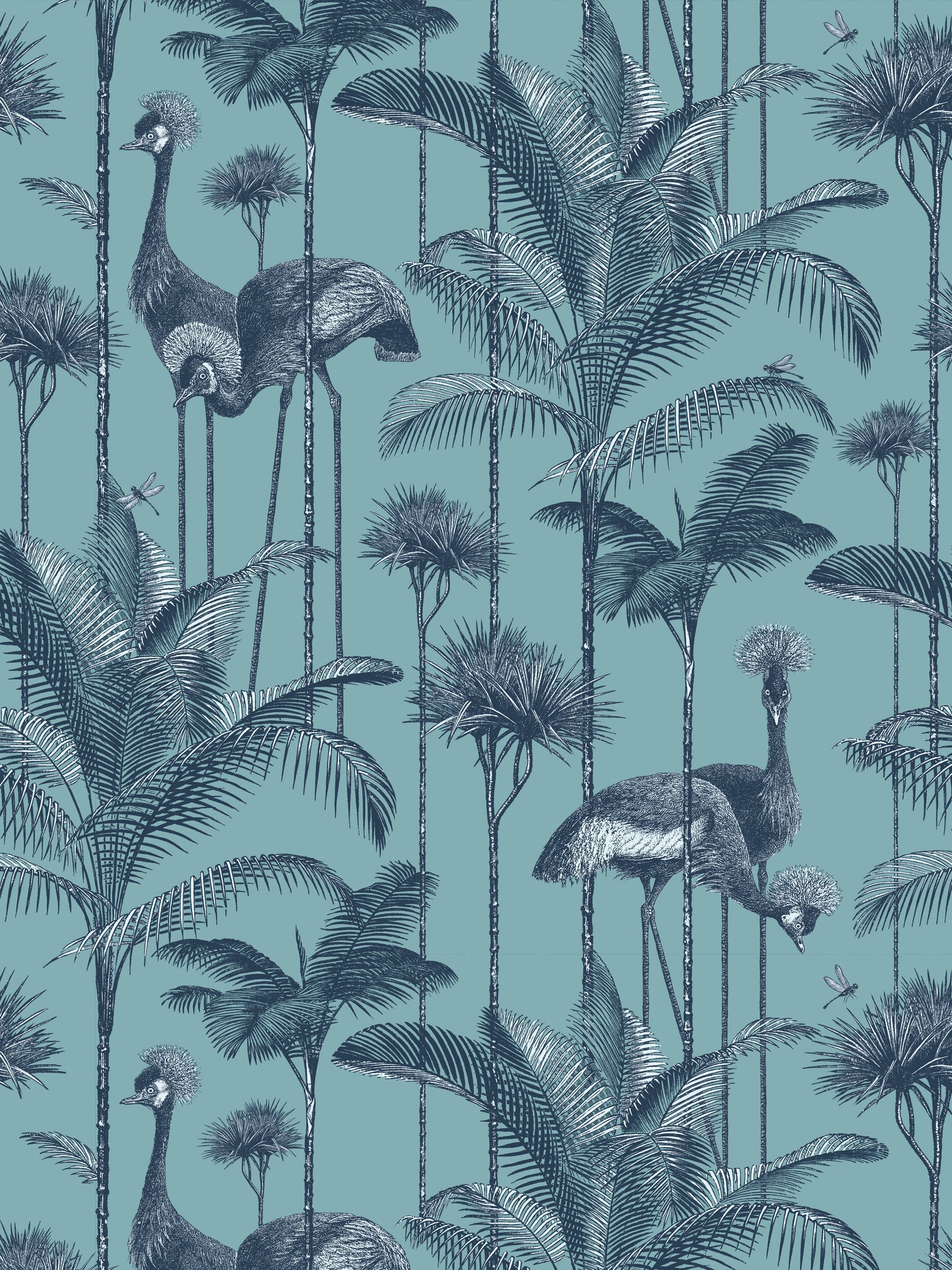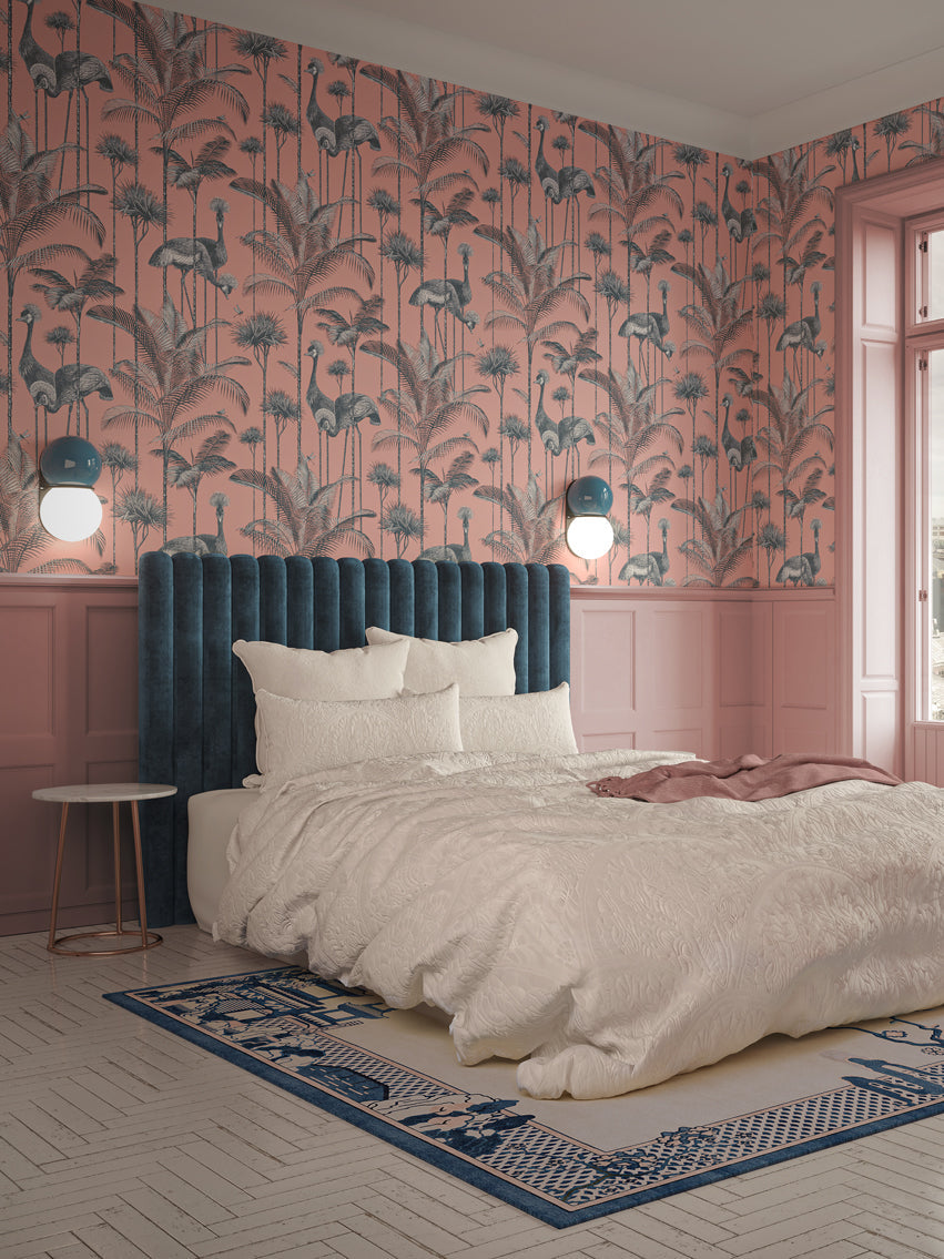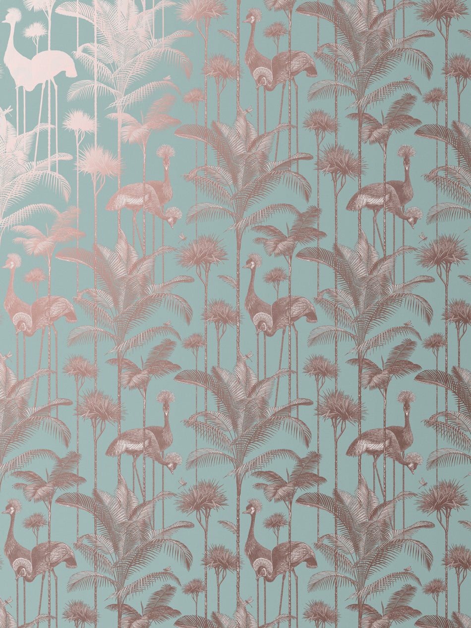 Our iconic Crane Fonda wallpaper features the elegantly fabulous Grey Crowned Crane amongst lush palm fronds for a fresh and breezy interior.