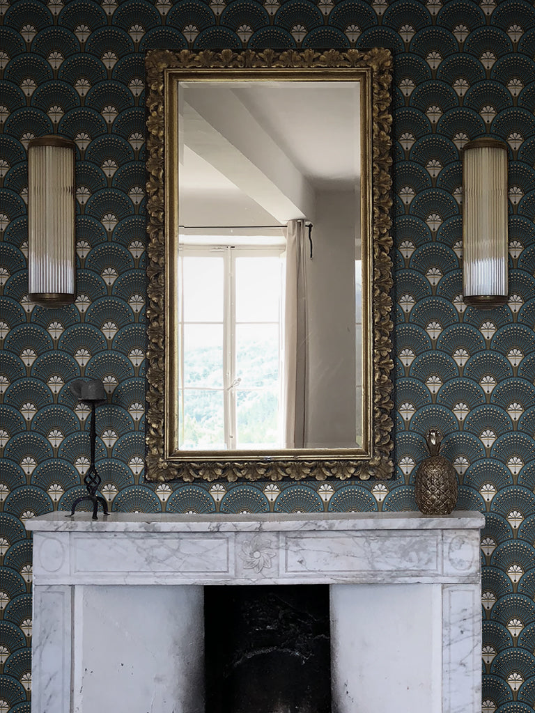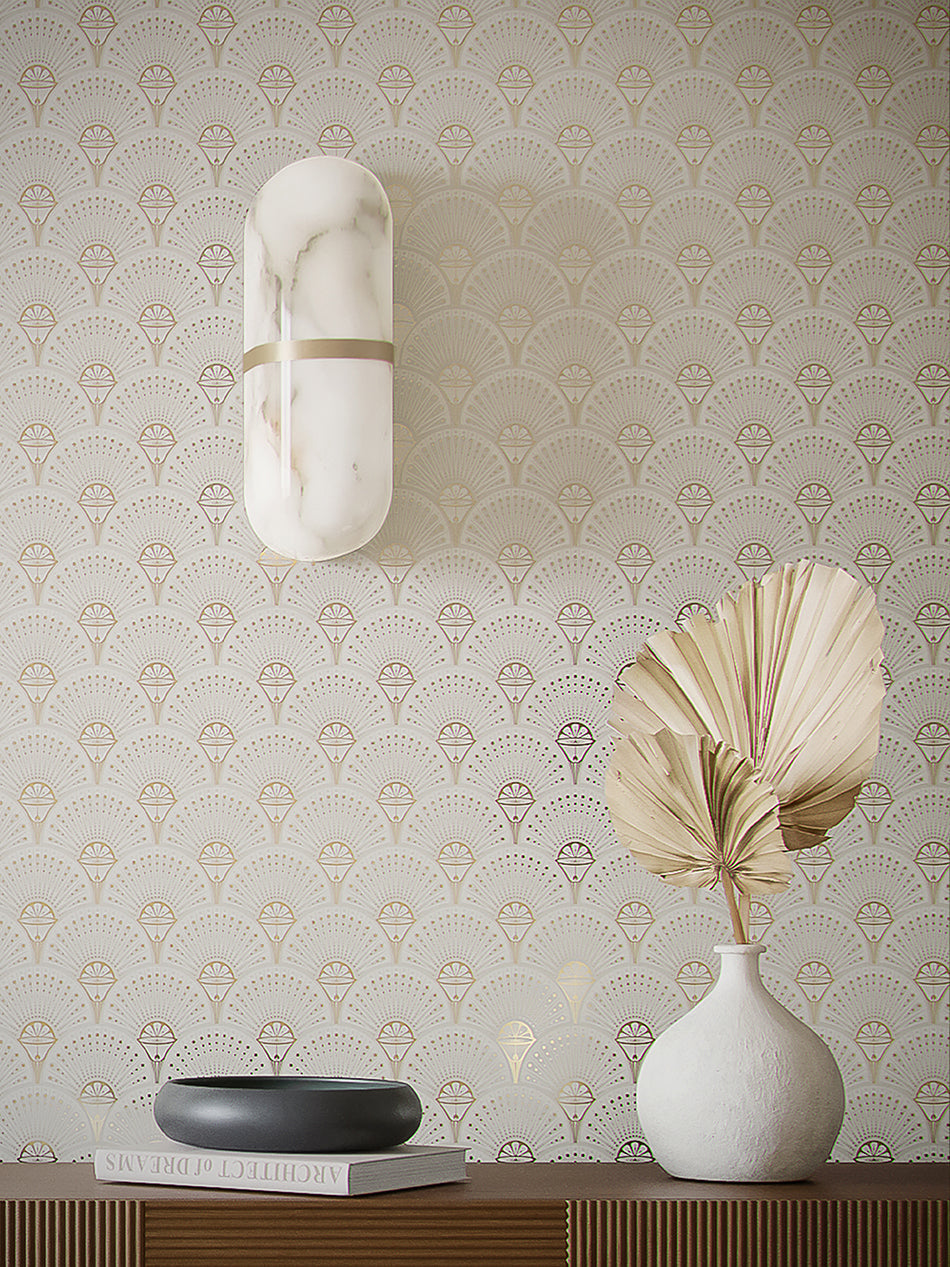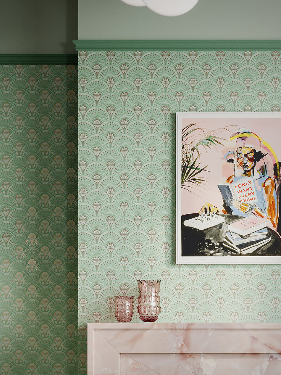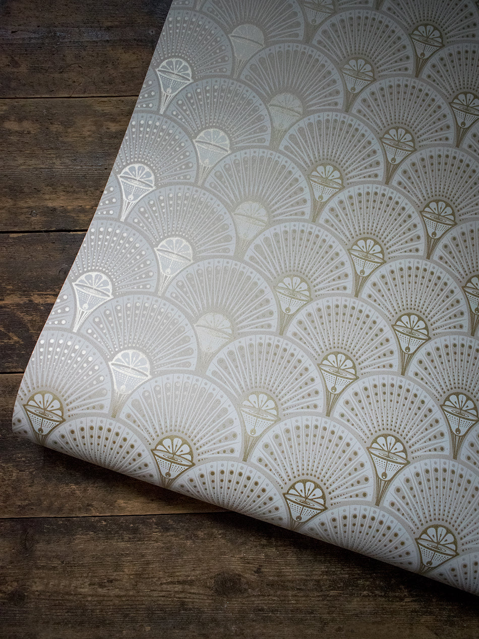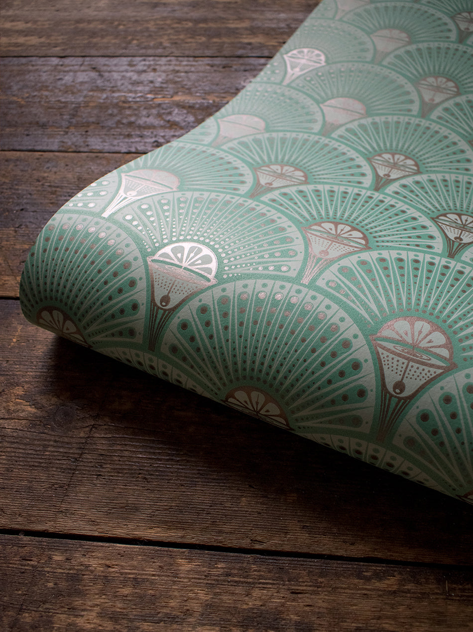 An Art Deco wallpaper that brings Gatsby glamour to your home. This metallic wallpaper shimmers with colours of gold and green.