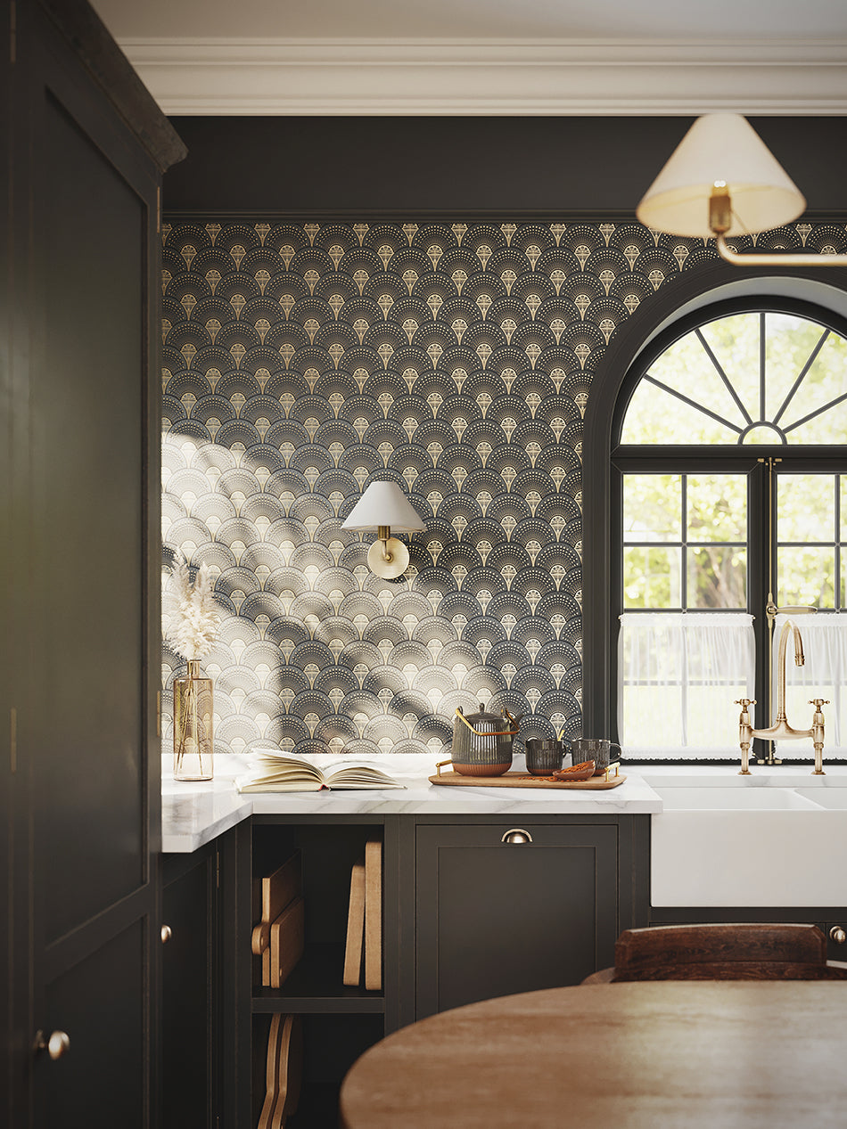Inspired by the Roaring Twenties and the decadent tastemakers of the jazz age, this bold graphic wallpaper brings Art Deco opulence to your interior with our Divine Savages twist on the traditional fan motif, featuring a hidden martini glass within the print.
