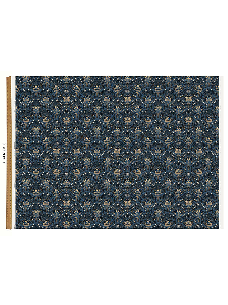 An Art Deco velvet that brings Gatsby glamour to your home. With a striking colour palette of deep blue, black and gold, this works particularly well as sumptuous velvet bedroom curtains, or an exquisite upholstered daybed.