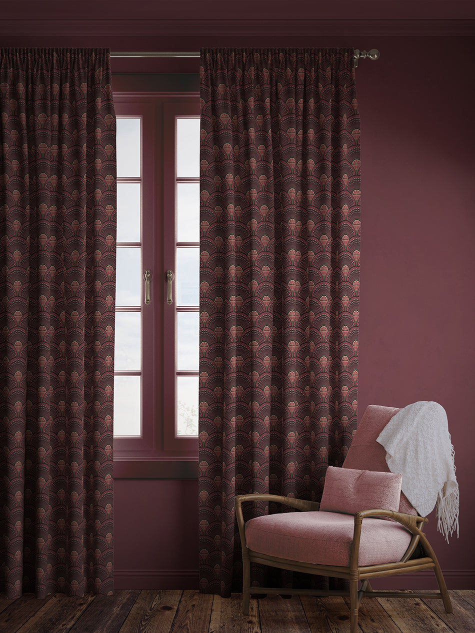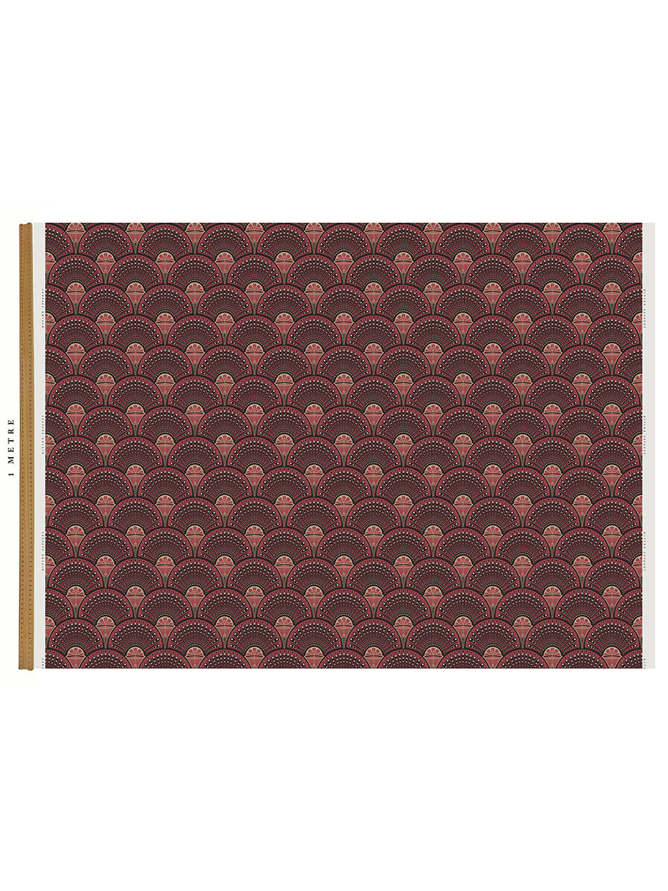 An Art Deco linen that brings Gatsby glamour to your home. With a striking colour palette of deep red, black and gold, this works particularly well as soft bedroom curtains, or an exquisite upholstered daybed.