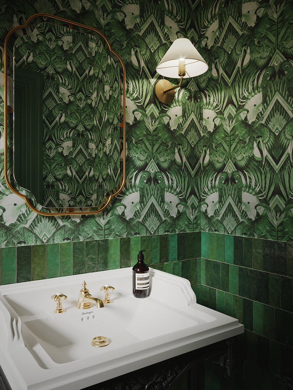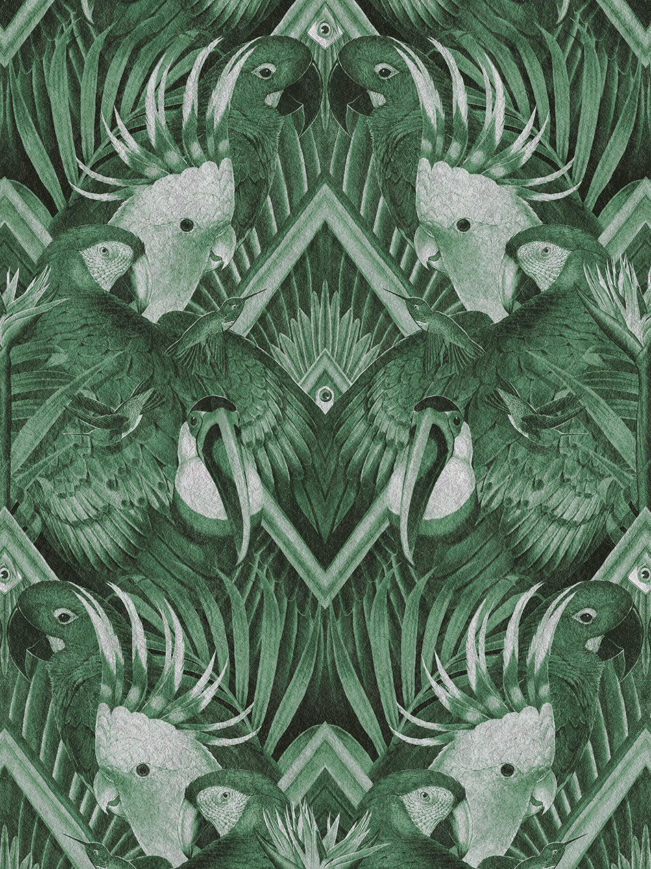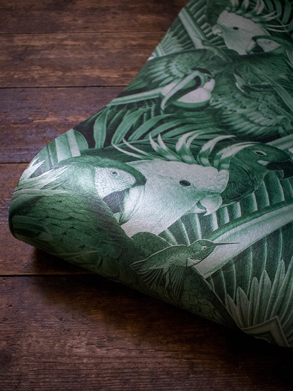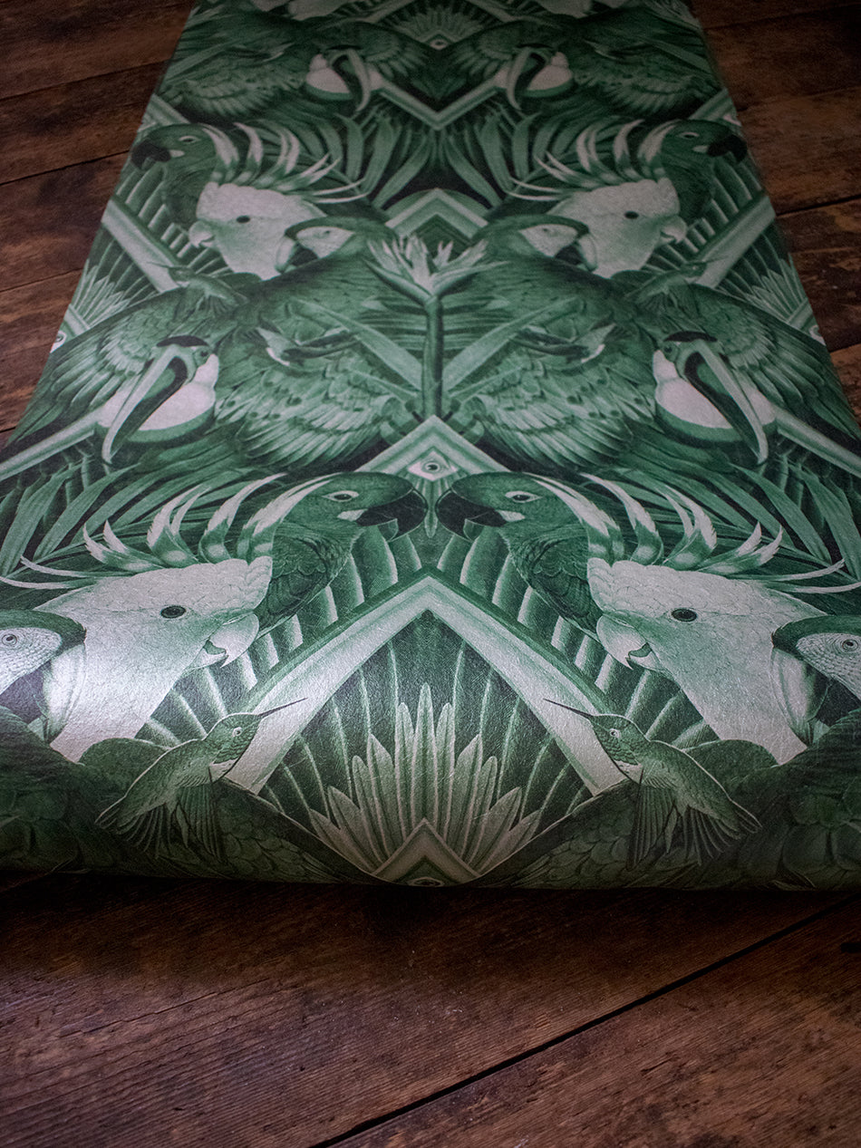 Inspired by the majestic birds of paradise from exotic, faraway lands, our vibrant Art Deco influenced wallpaper brings a sultry decadence to your interior in shades of greens and cream with a stunning metallic shimmer.