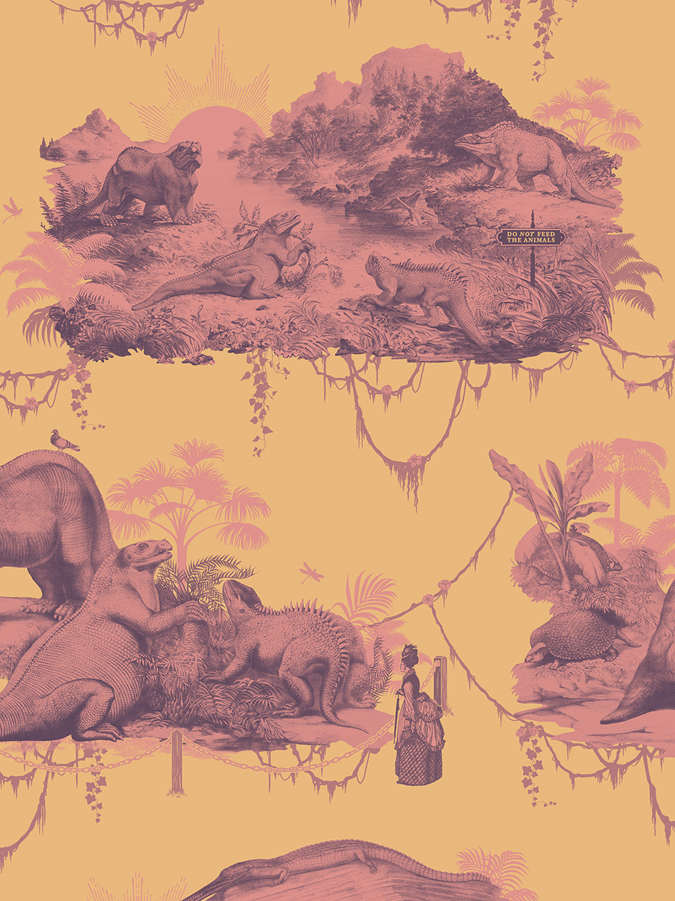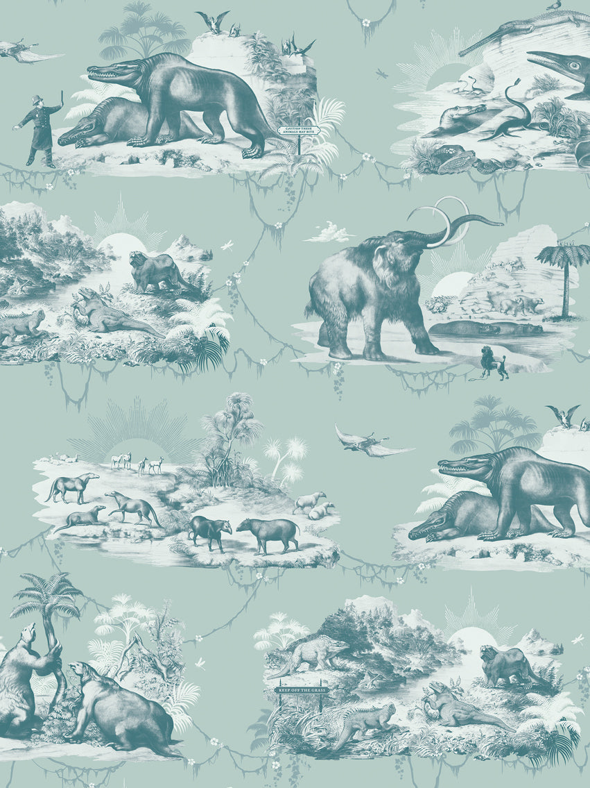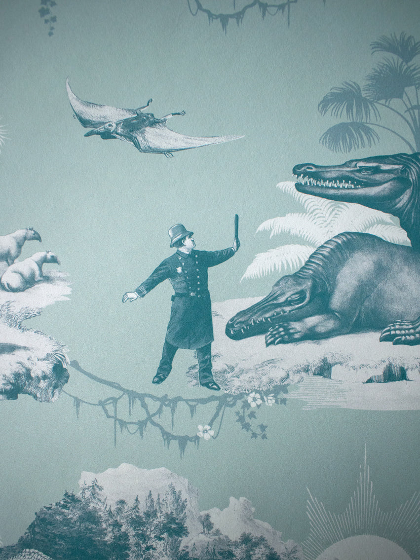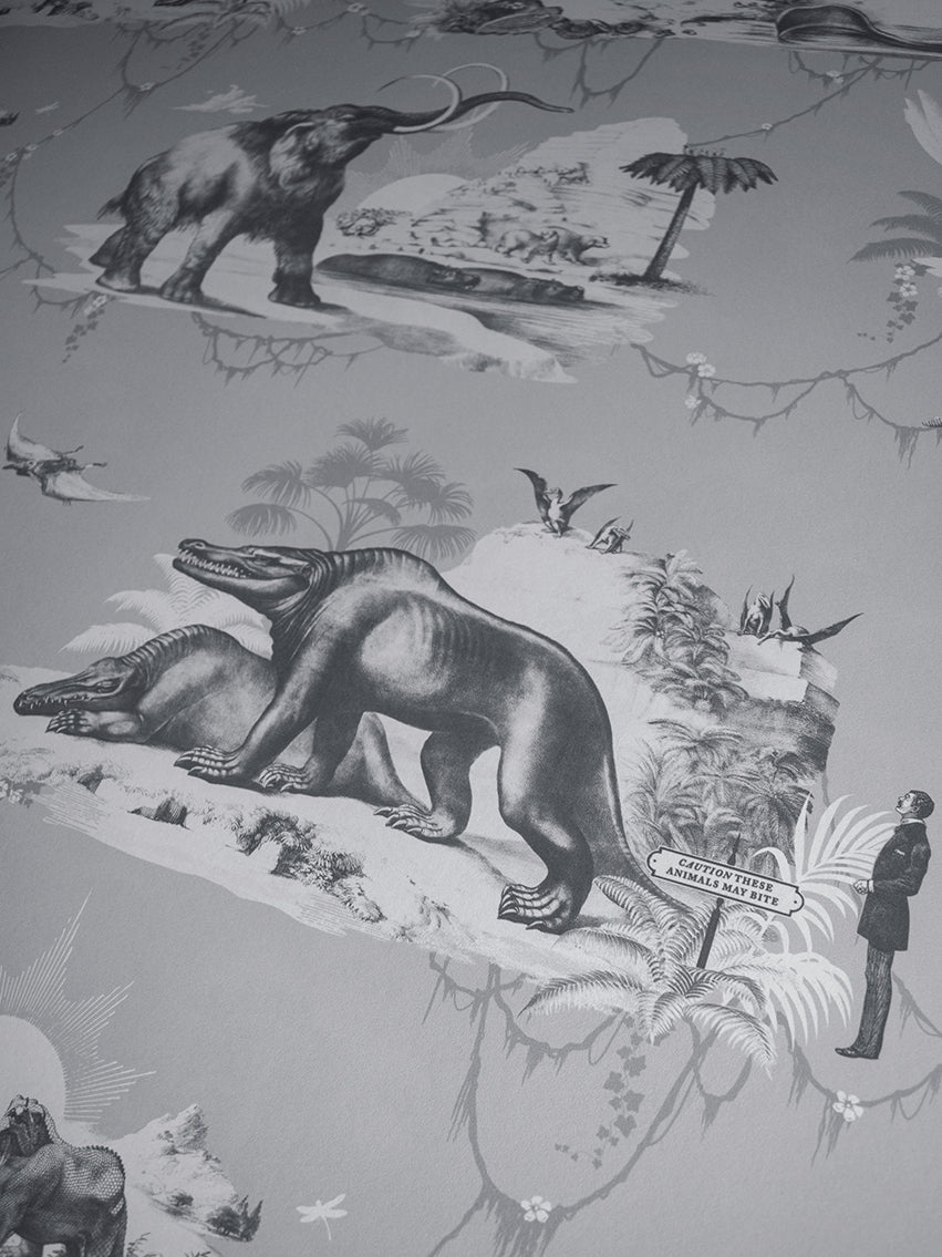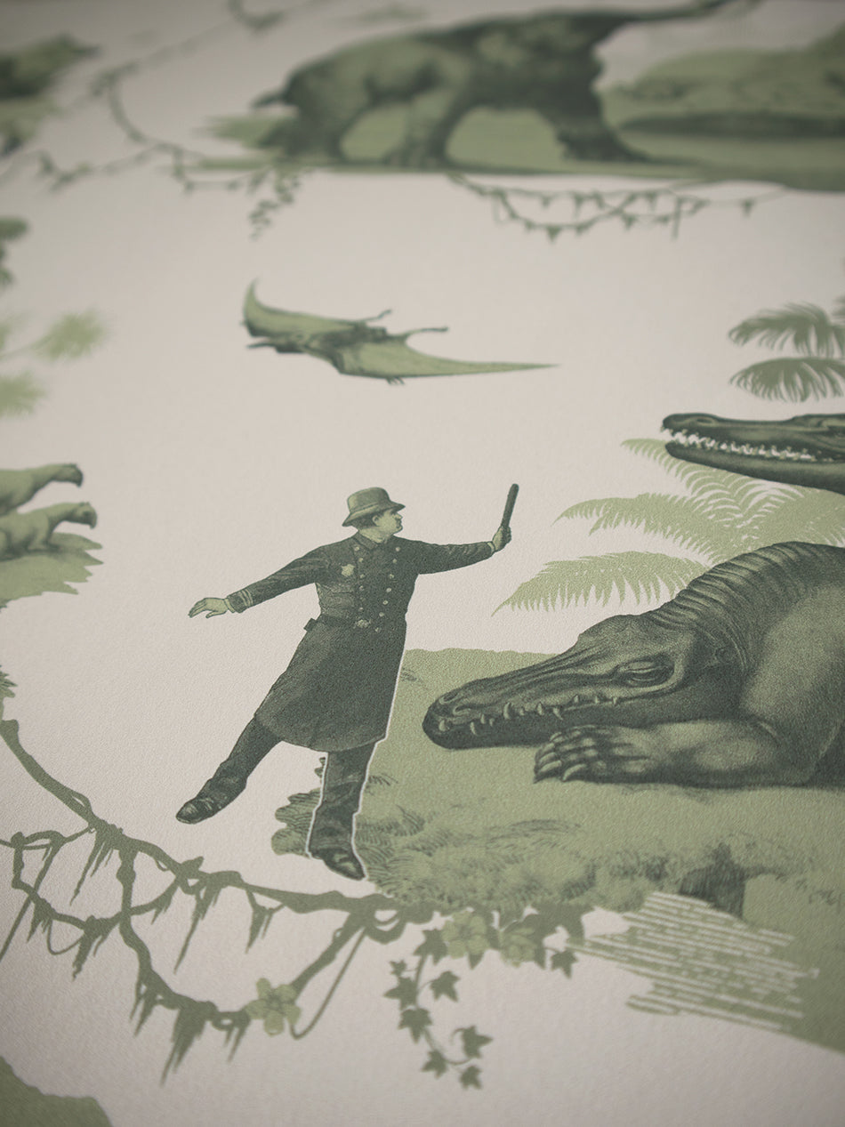 Taking inspiration from Benjamin Waterhouse Hawkin’s elaborate Victorian theme park at Crystal Palace, South-East London. Featuring a plethora of prehistoric beasts as they skulk in the bushes and frolic in the water, you’ll also notice the Victorians of the time as they wander through their Jurassic fantasy world. This detail-rich, largescale wallpaper will bring an artful ambience to any interior.