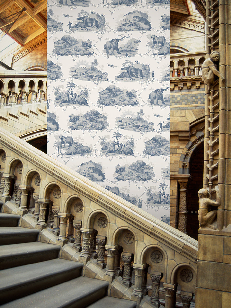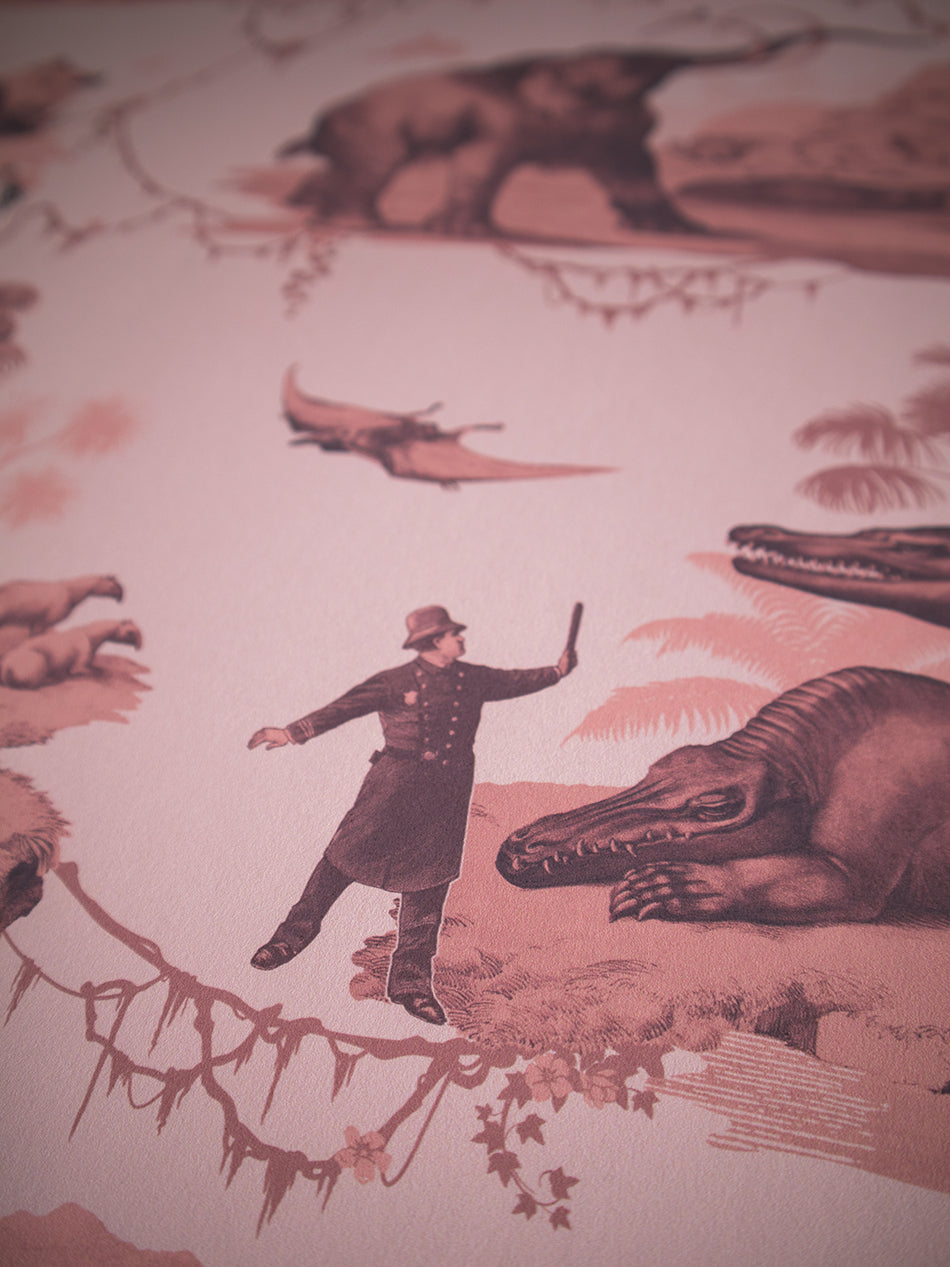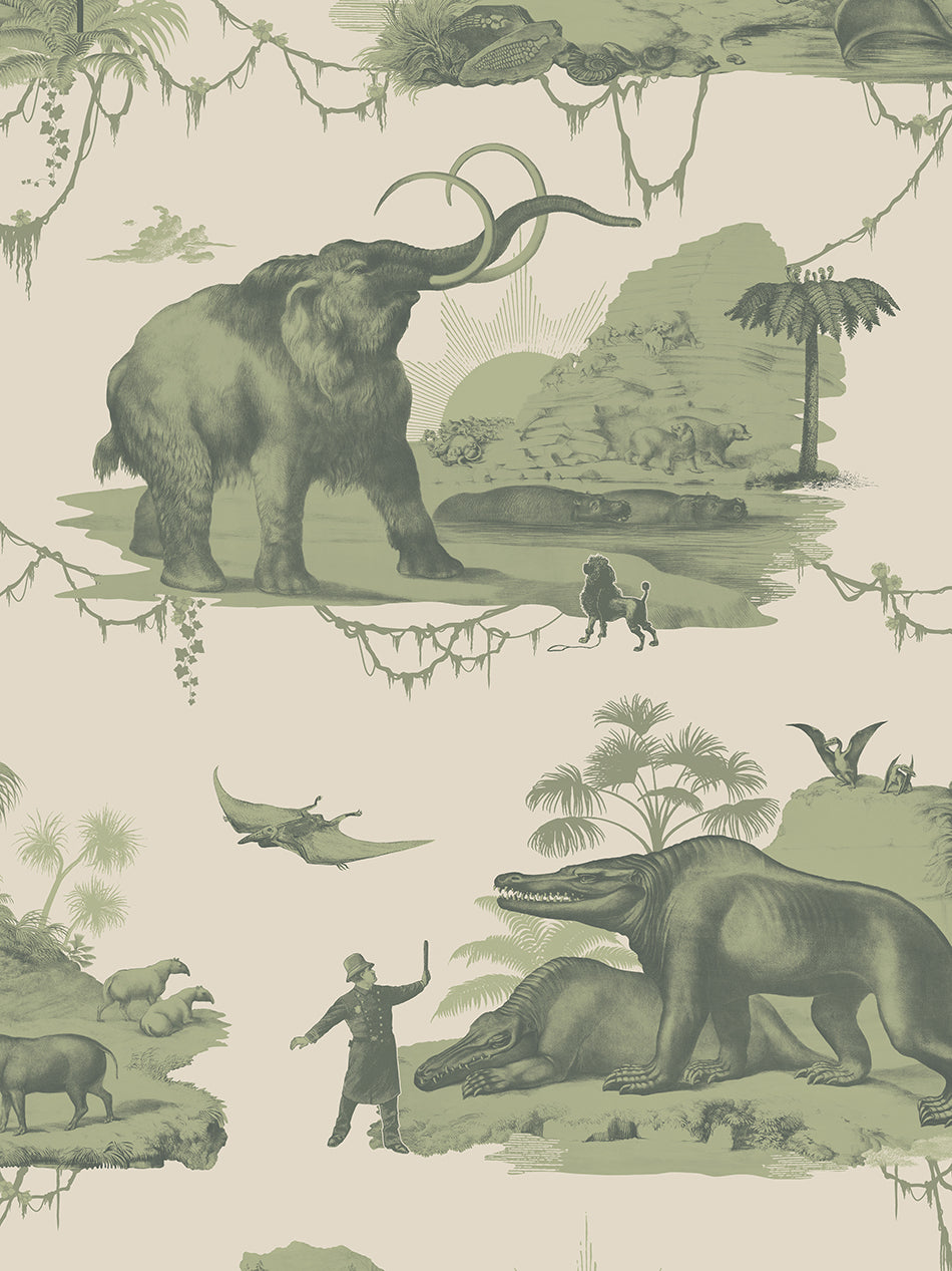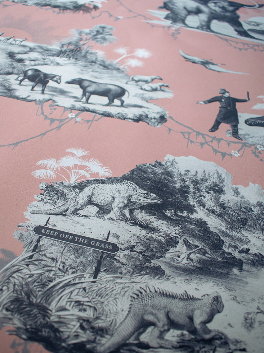 Taking inspiration from Benjamin Waterhouse Hawkin’s elaborate Victorian theme park at Crystal Palace, South-East London. Featuring a plethora of prehistoric beasts as they skulk in the bushes and frolic in the water, you’ll also notice the Victorians of the time as they wander through their Jurassic fantasy world. This detail-rich, largescale wallpaper will bring an artful ambience to any interior.