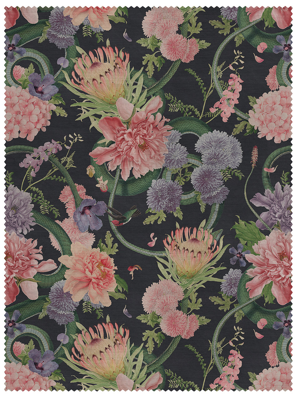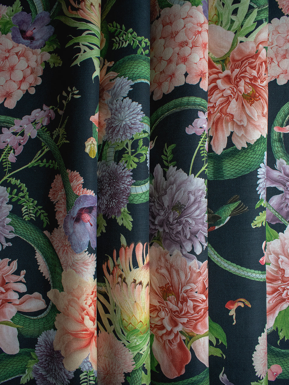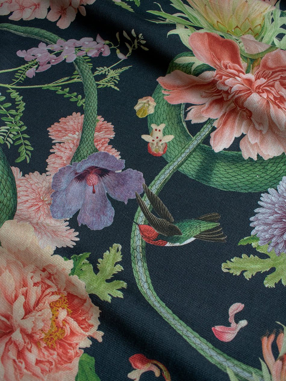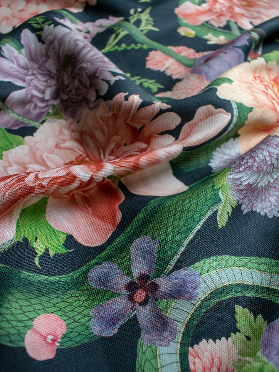 Blending the botanical and reptile collections from The Natural History Museum, this linen features beautifully illustrated floral blooms mysteriously intertwined with sweeping serpents for a wild and untamed interior. Look closer, can you spot the serpent’s head?