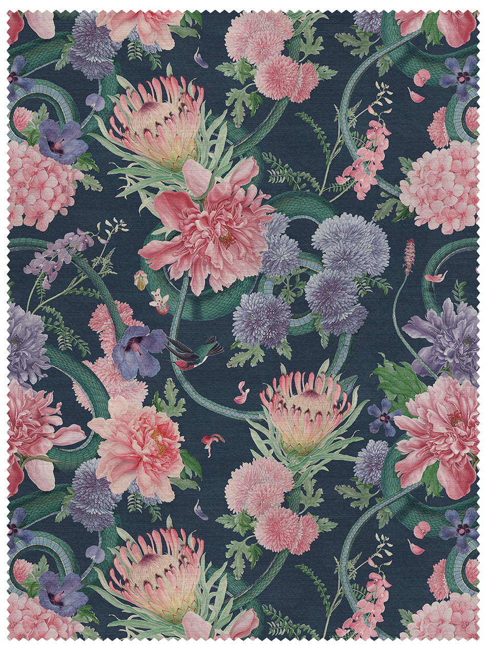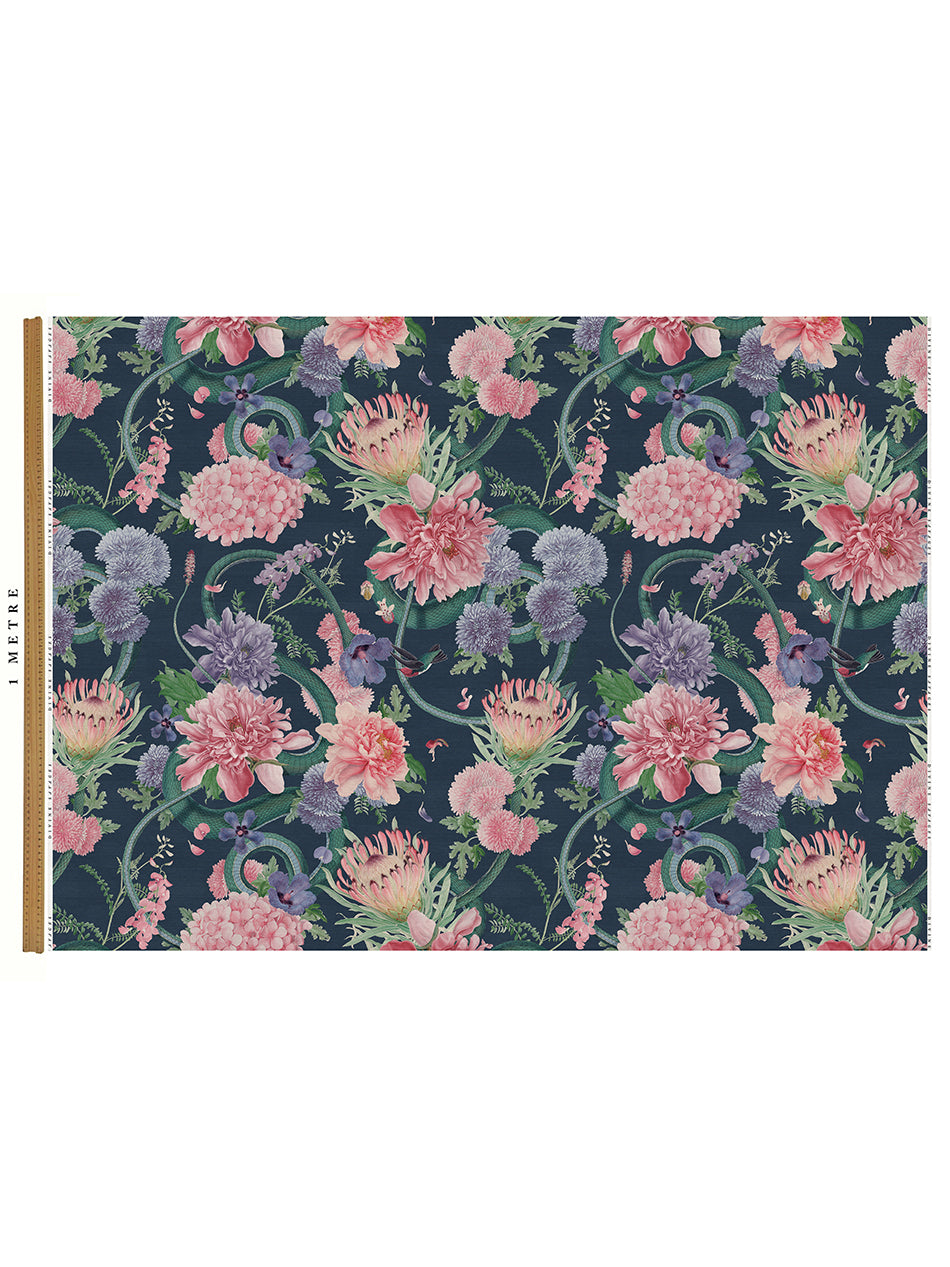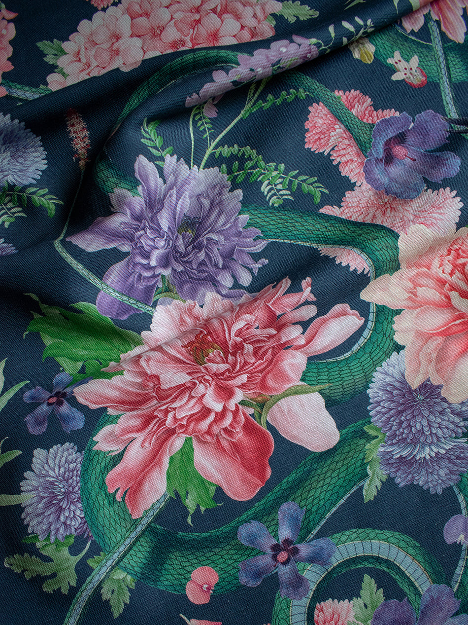 Blending the botanical and reptile collections from The Natural History Museum, this floral linen features beautifully illustrated blooms mysteriously intertwined with sweeping serpents for a wild and untamed interior. A deep blue base with details in soft pinks and green.
