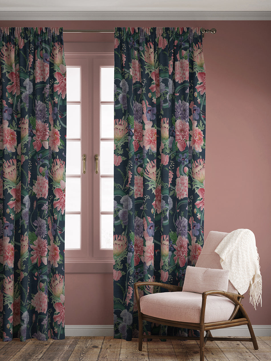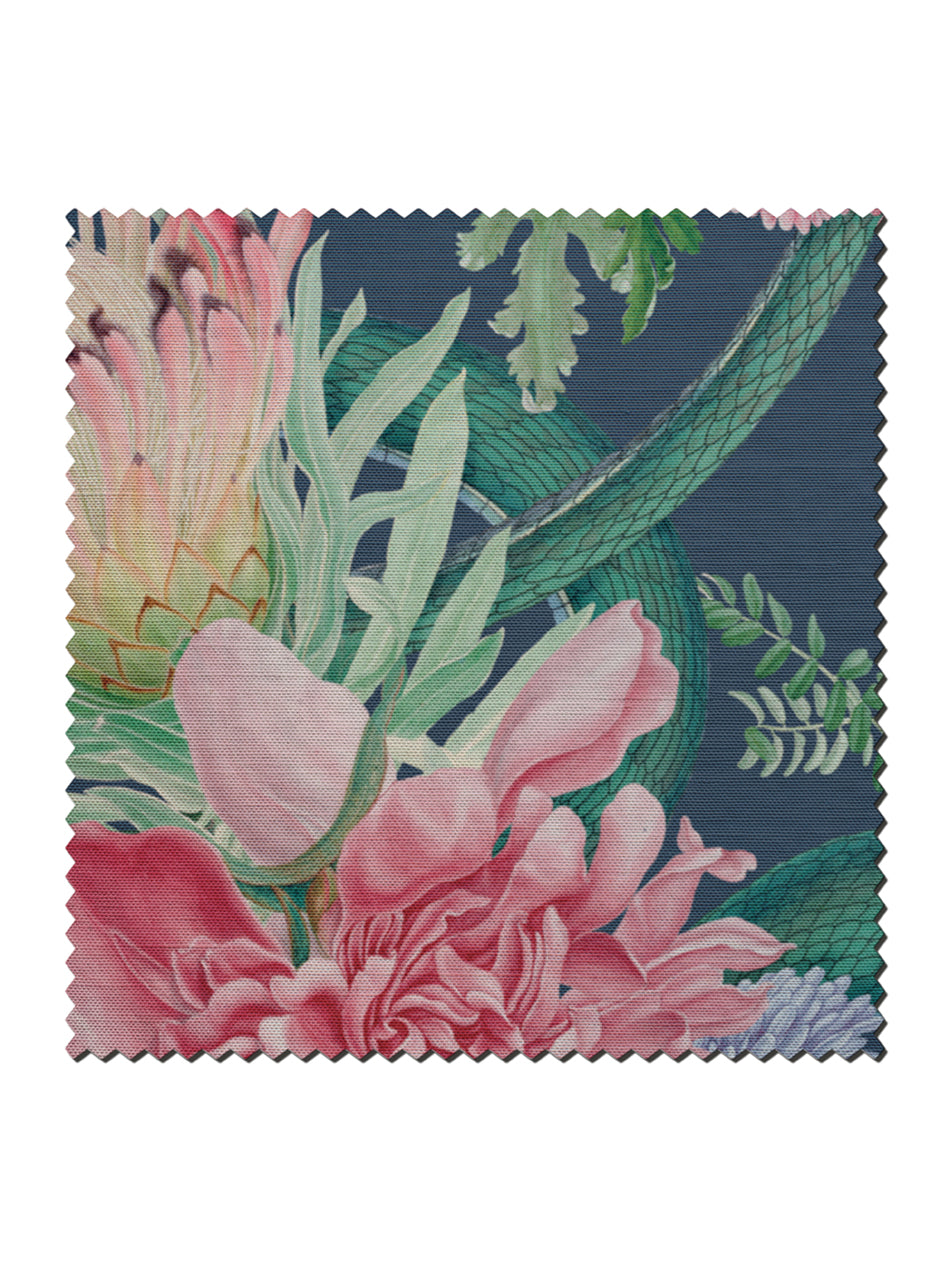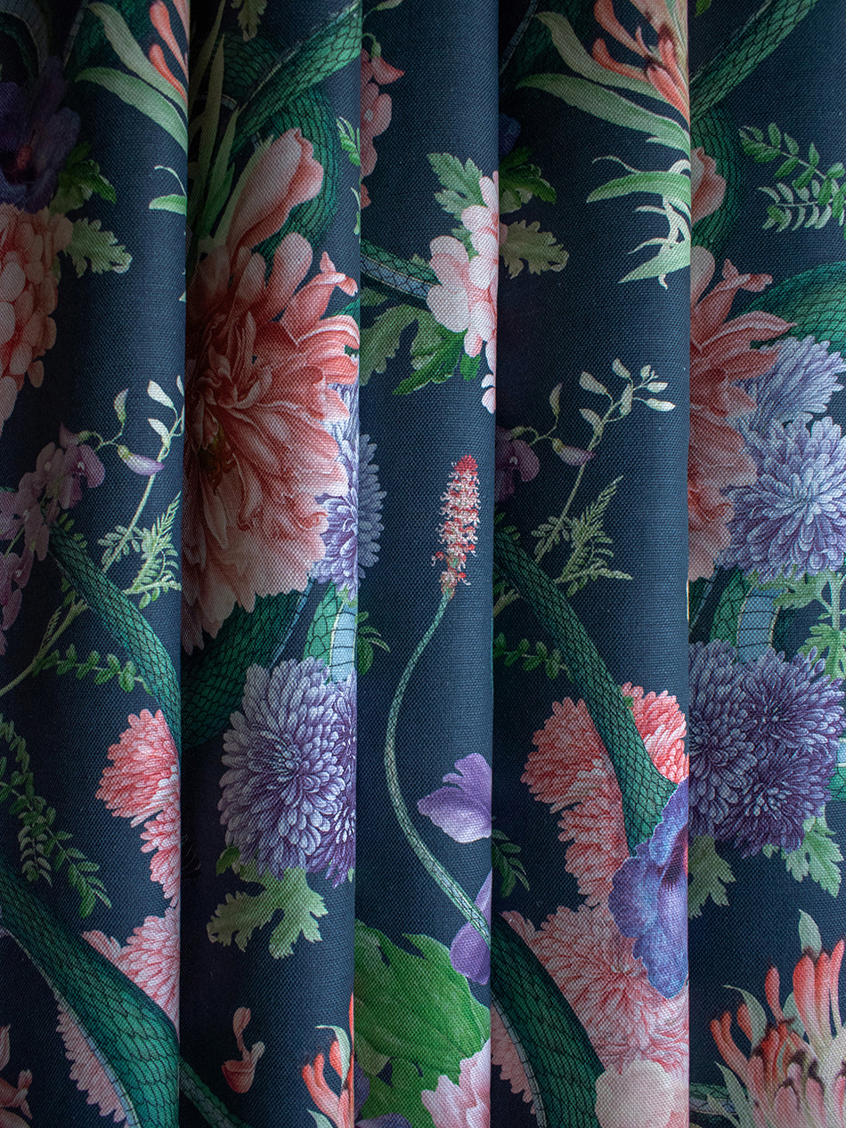 Blending the botanical and reptile collections from The Natural History Museum, this floral linen features beautifully illustrated blooms mysteriously intertwined with sweeping serpents for a wild and untamed interior. A deep blue base with details in soft pinks and green.