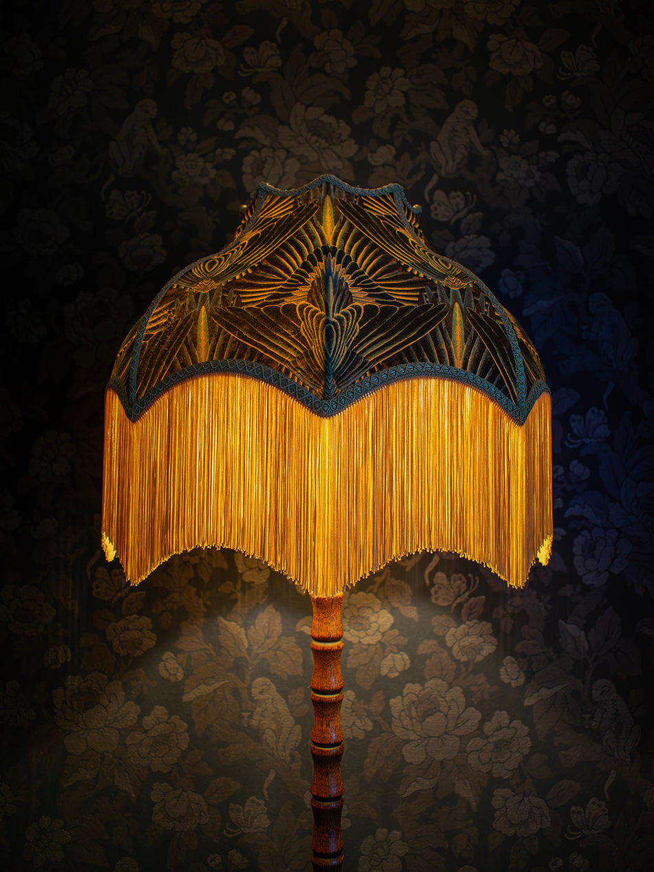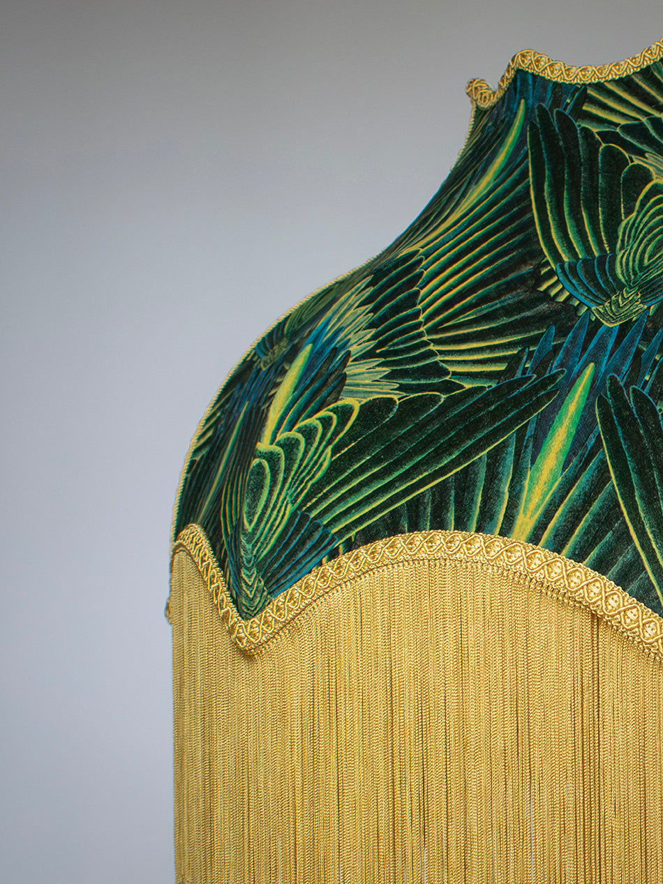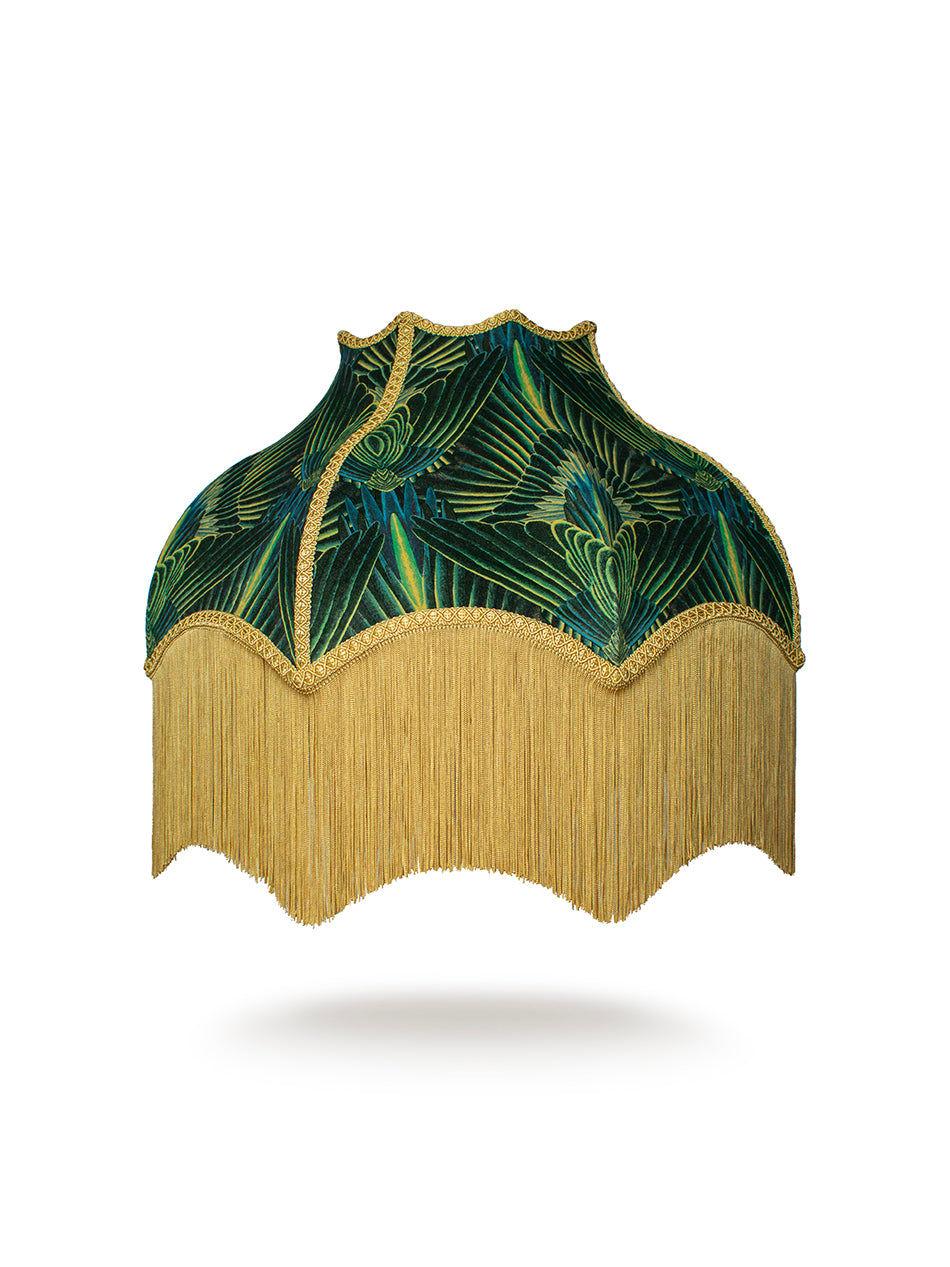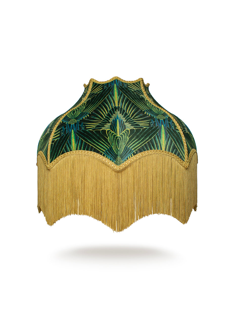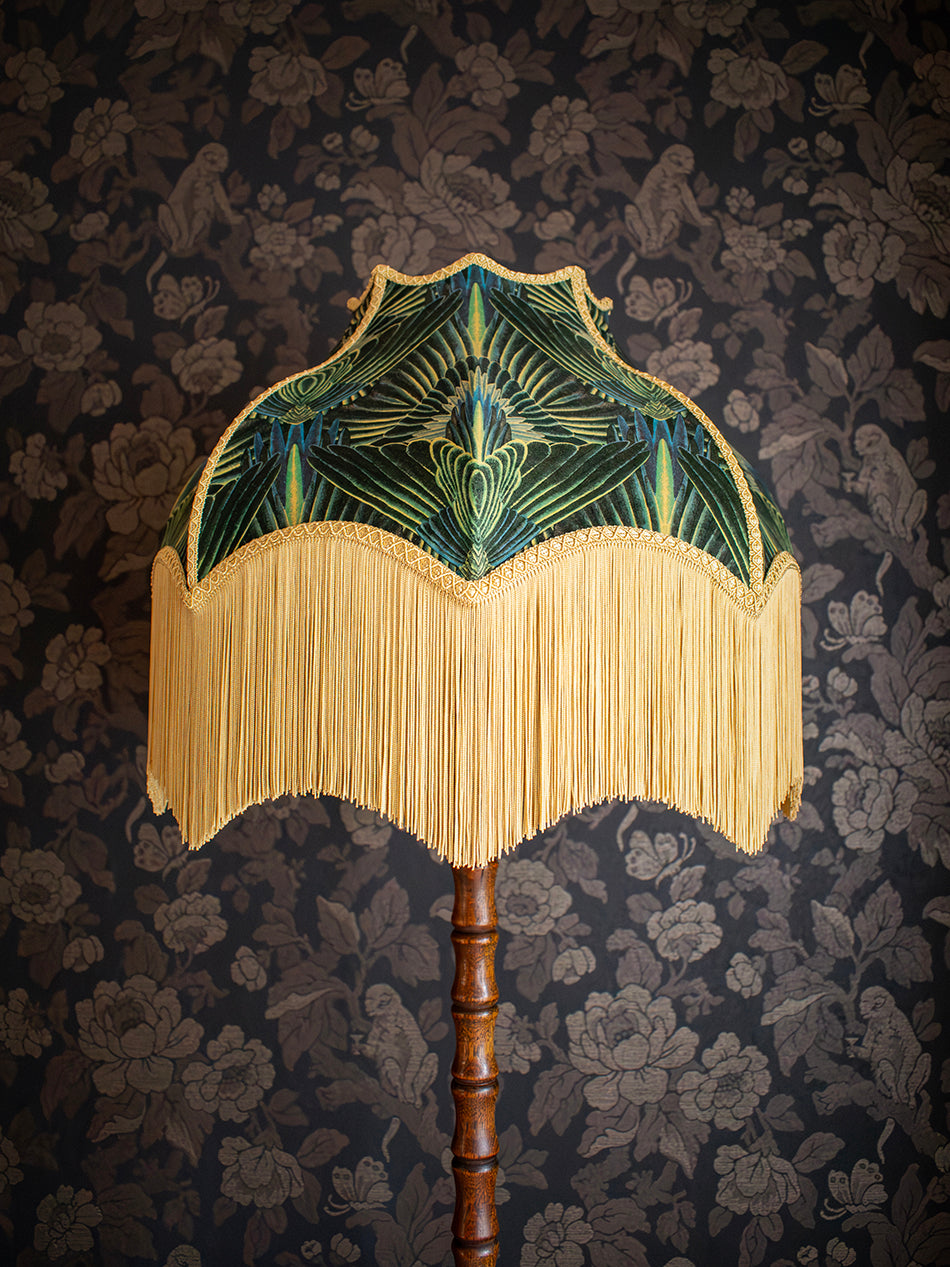 A handmade velvet lampshade in a stunning palette of rich greens, blues and yellows, and finished with ornate braiding and fringe.
