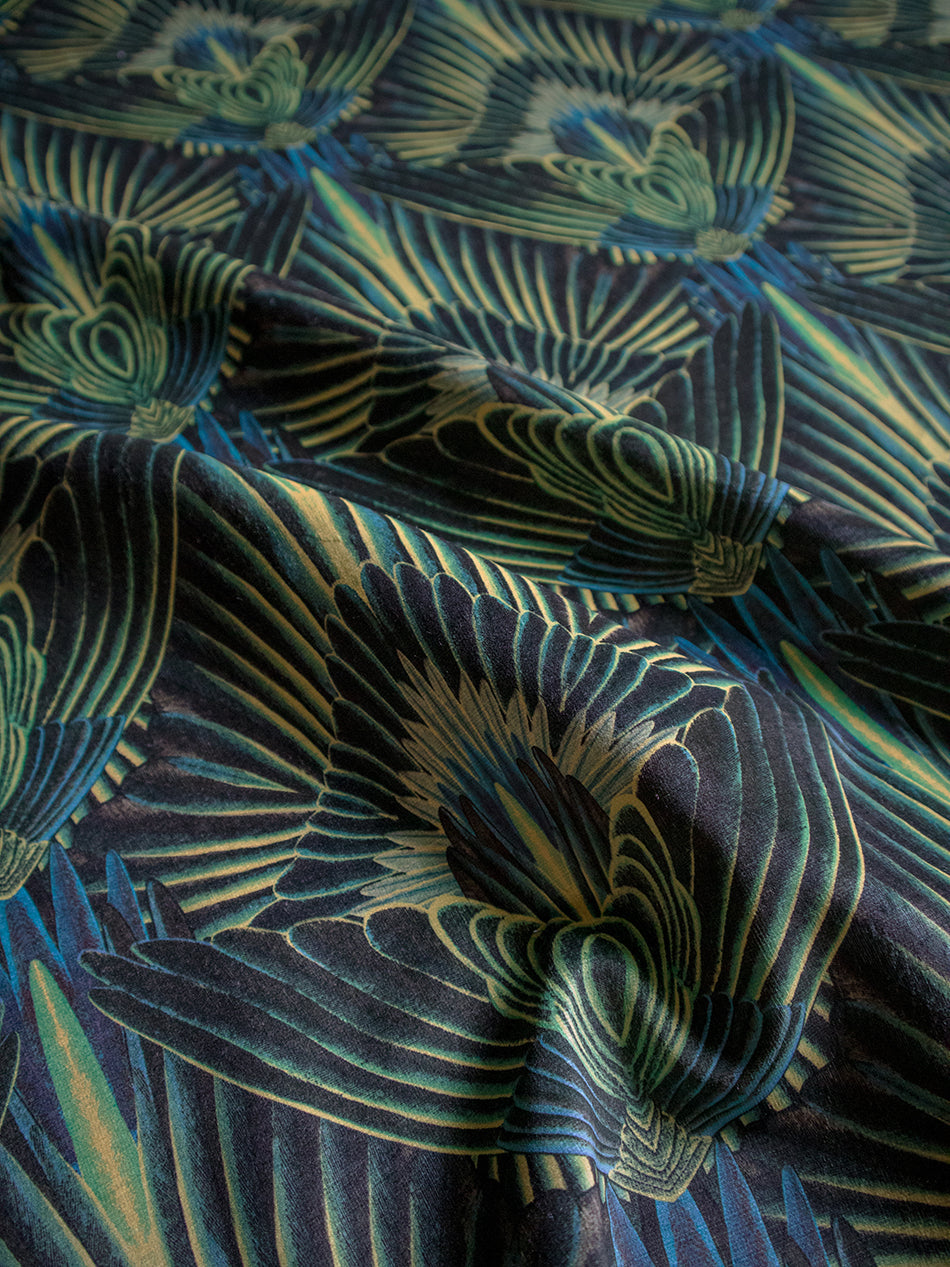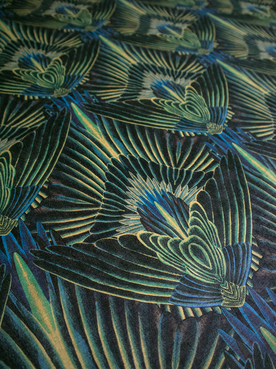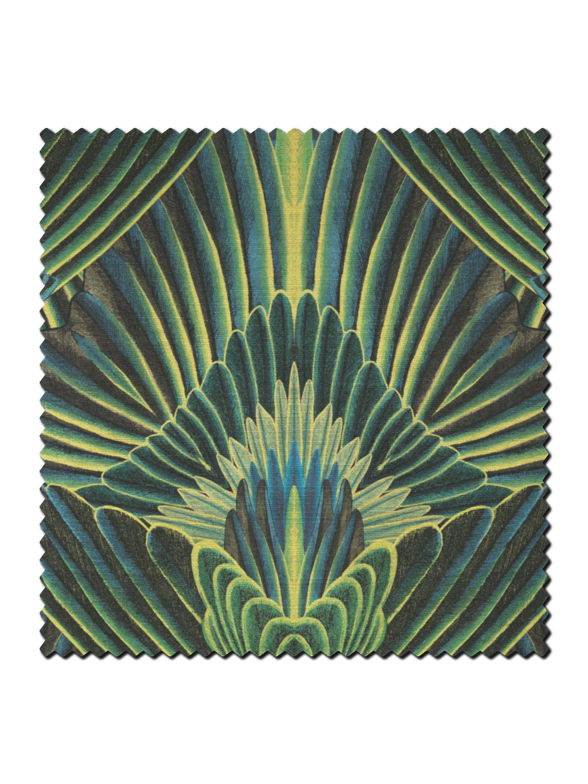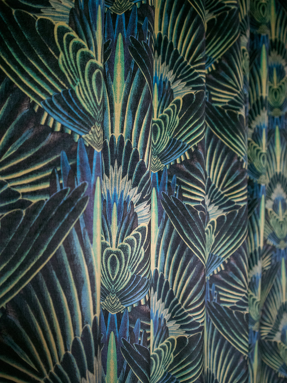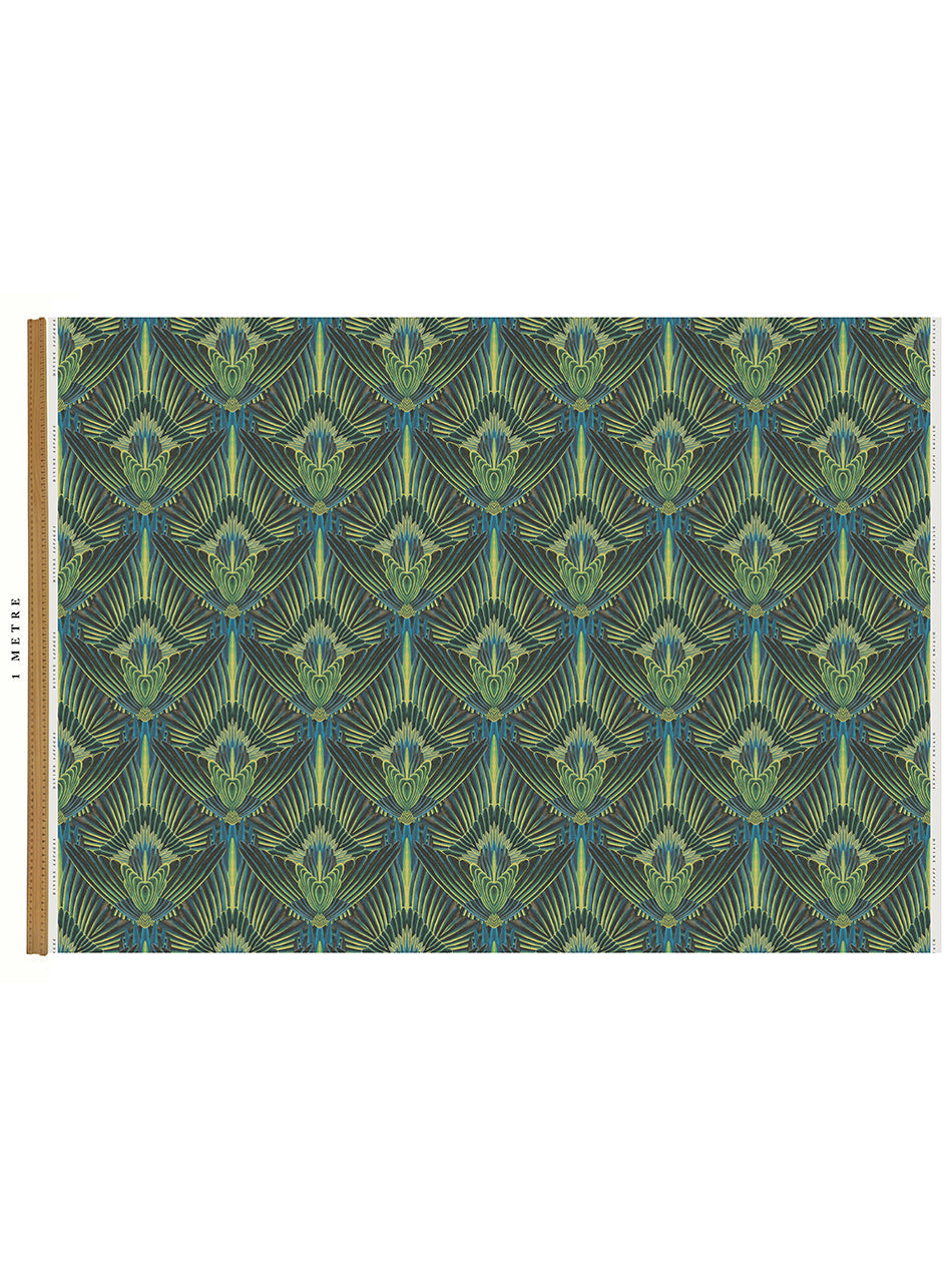 A decadent, feathered, Art Deco influenced print that brings unapologetic glamour and depth to any interior. A vibrant palette of greens and yellows work beautifully together and we love using this as upholstery velvet on a set of vintage cinema seats.