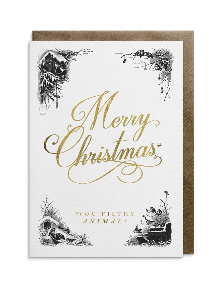 An ornate seasonal greeting card with beautiful gold foil calligraphy and Victorian inspired Christmas designs in each corner. The card reads ‘Merry Christmas, you filthy animal’ inspired by the movie Home Alone 2.