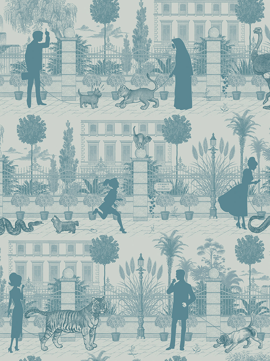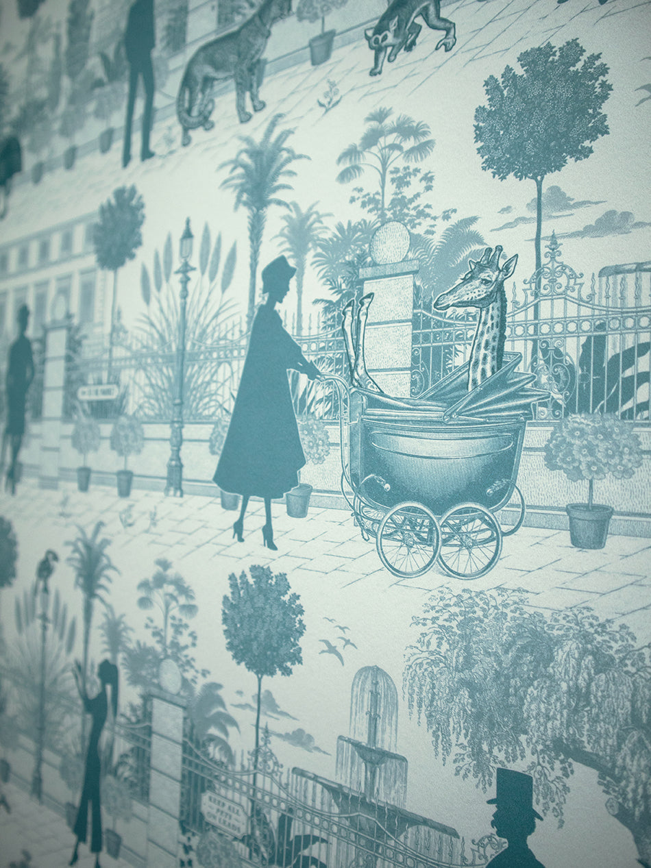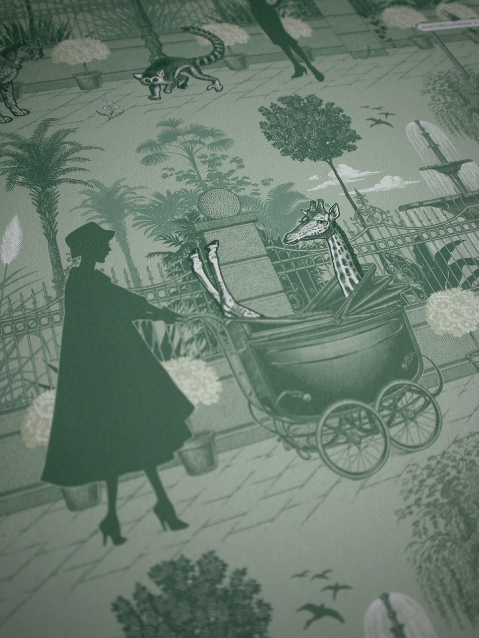 Inspired by London’s most unusual pets, this detail-rich wallpaper revisits a bonkers, bygone era where you could encounter an array of exotic animals not just at the zoo, but on the streets!