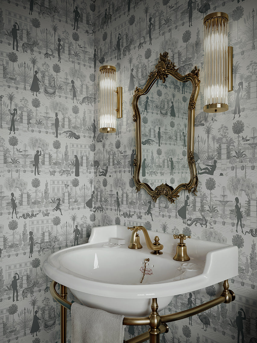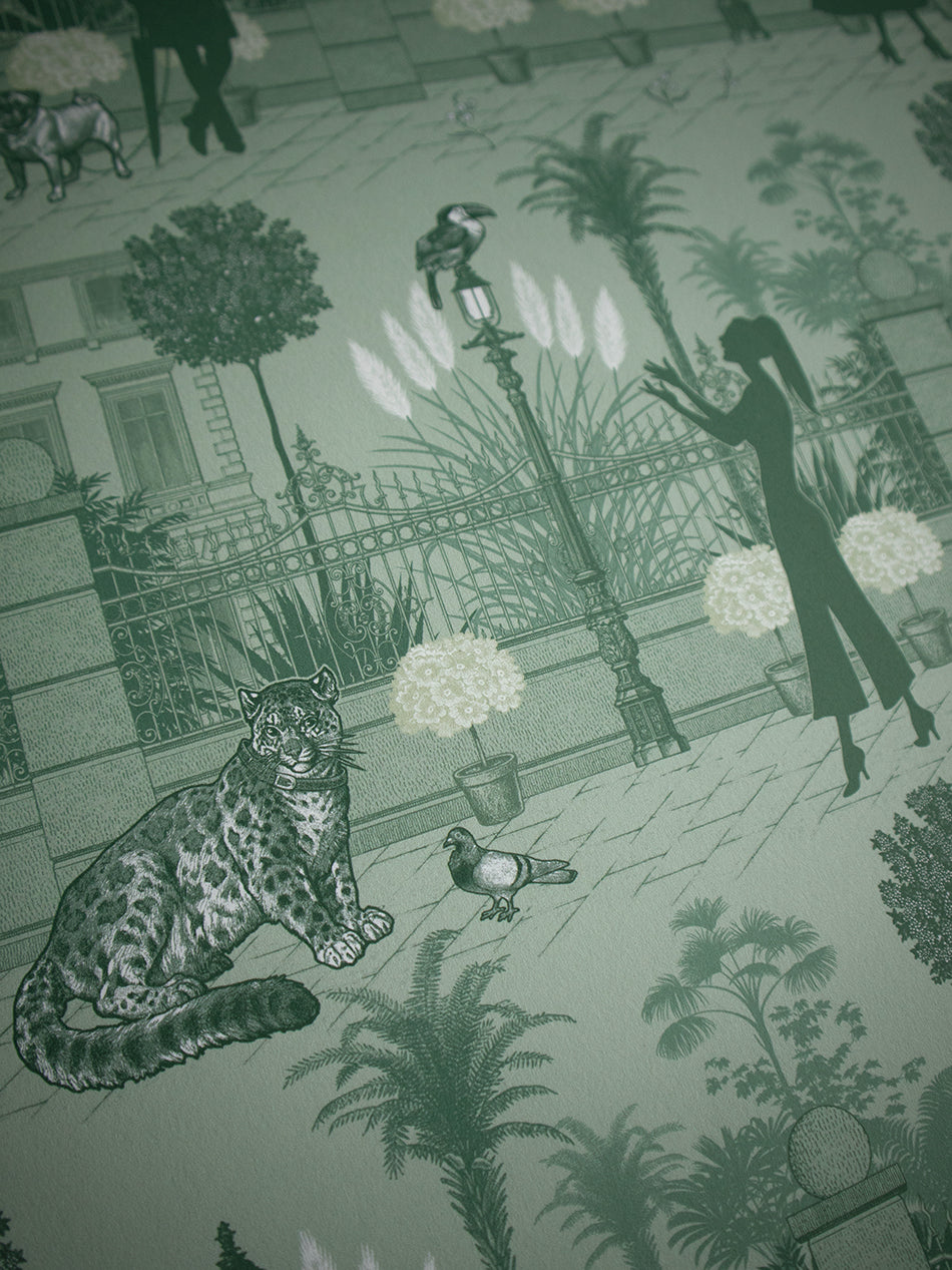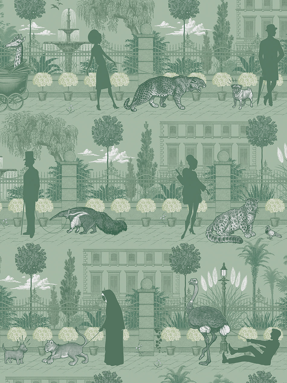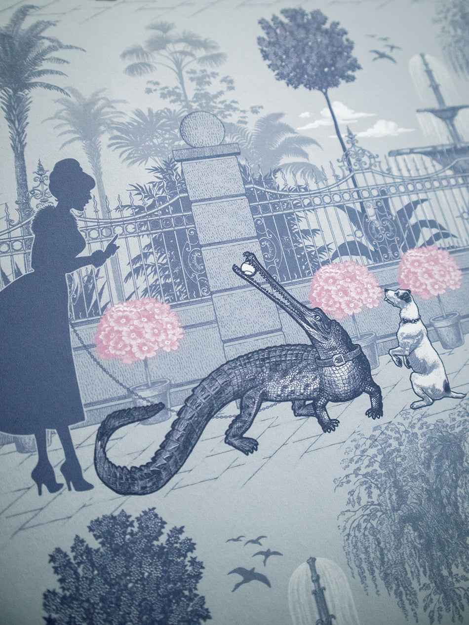 Inspired by London’s most unusual pets, this detail-rich wallpaper revisits a bonkers, bygone era where you could encounter an array of exotic animals not just at the zoo, but on the streets!