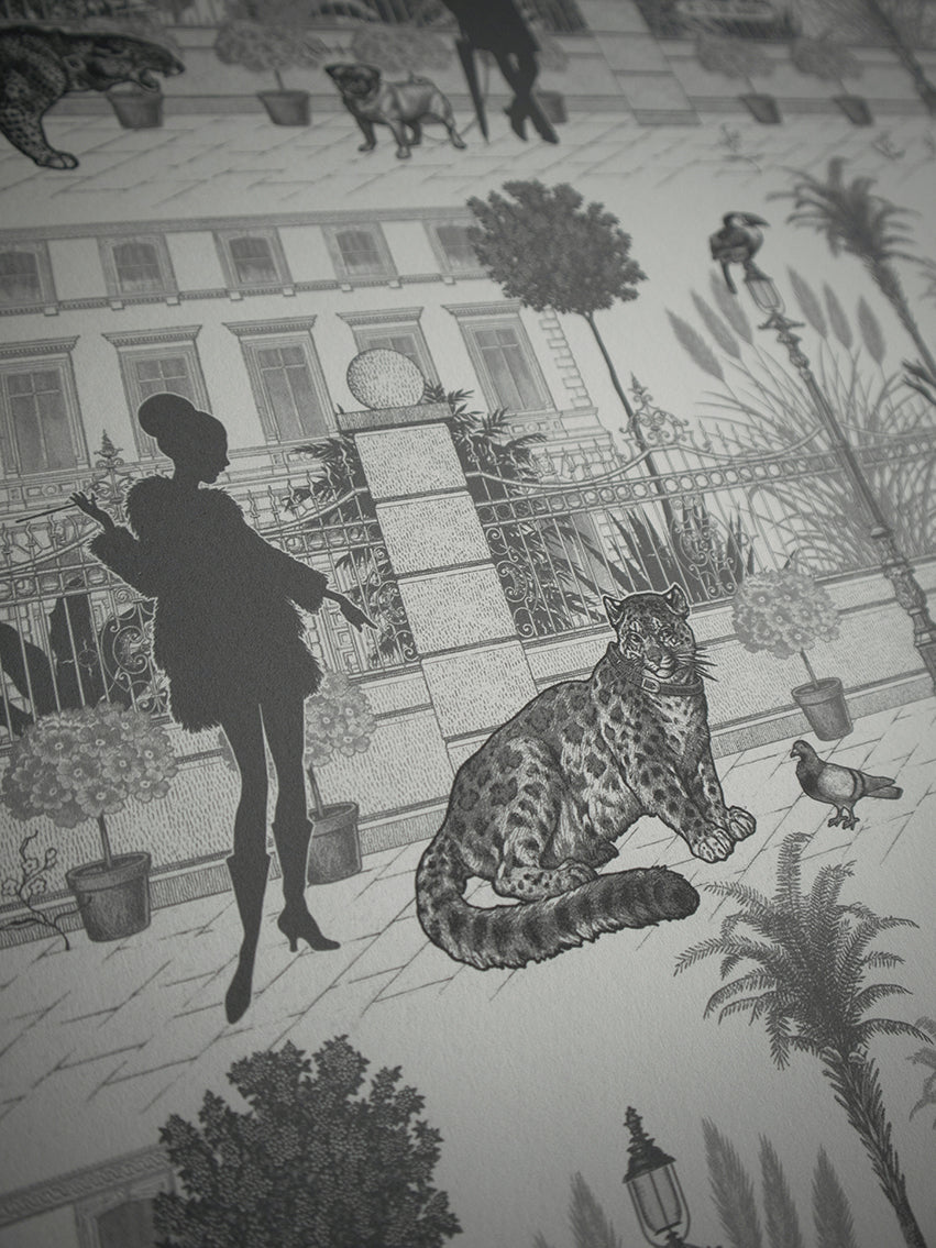 Beautifully illustrated, you’ll discover something new each time you look. Lions, leopards and lemurs stroll casually through Regency inspired streets and parklands as they cross paths with other bewildered pets for a playful, pictorial print.