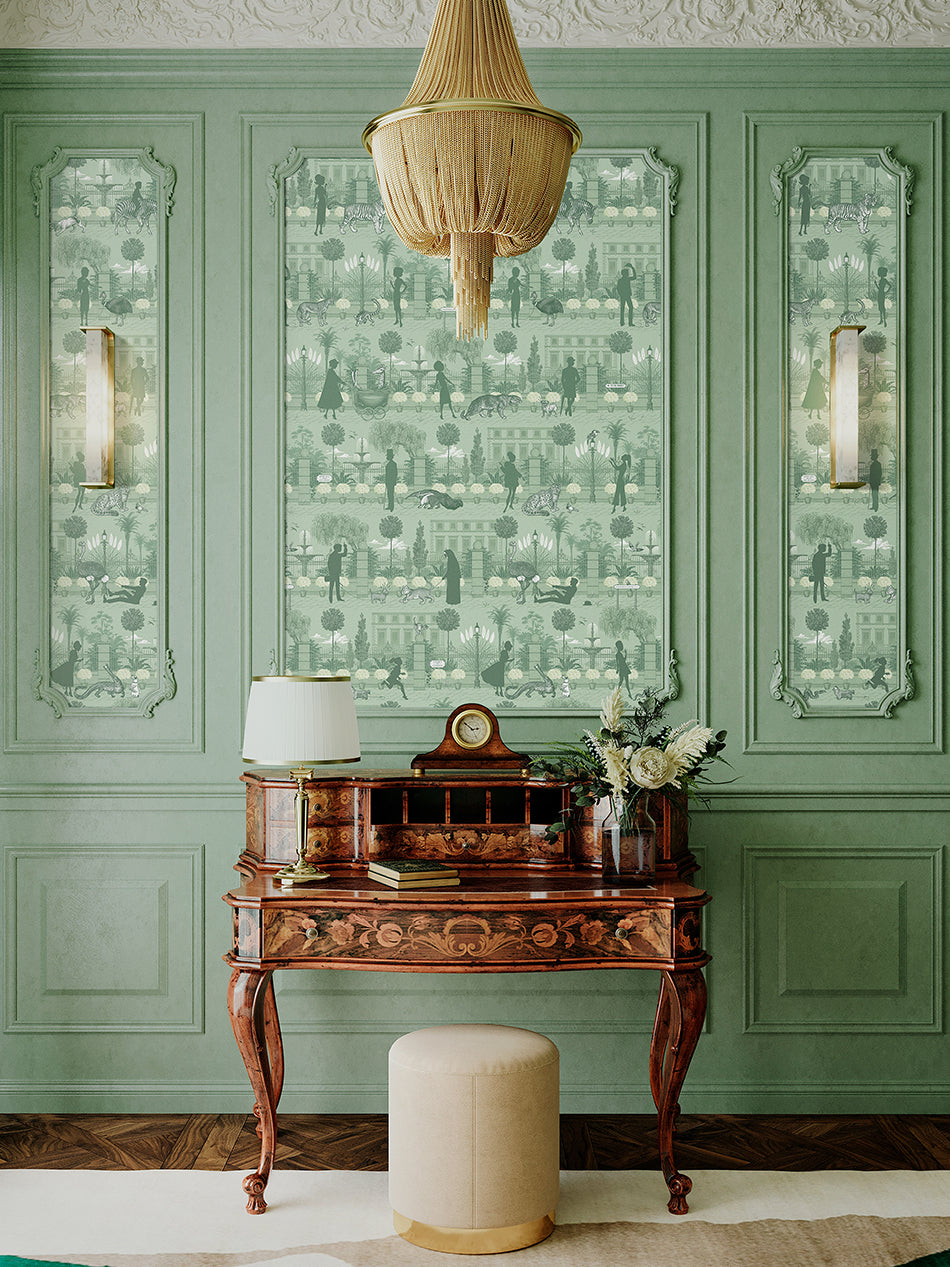 Portobello Parade wallpaper is available in five distinctive colours, themselves drawing inspiration from the city of London. Discover Park Green, a tranquil, breezy palette that creates a verdant interior, bringing the outdoors in.