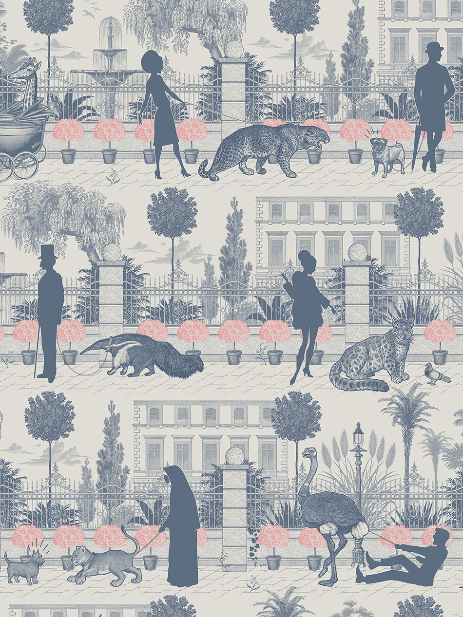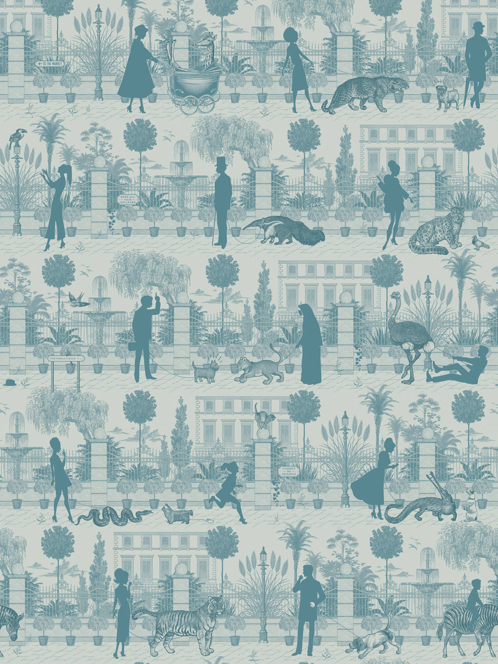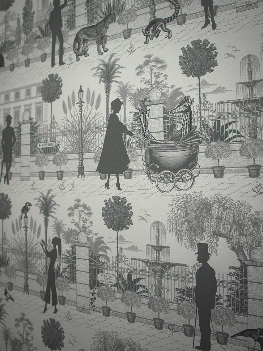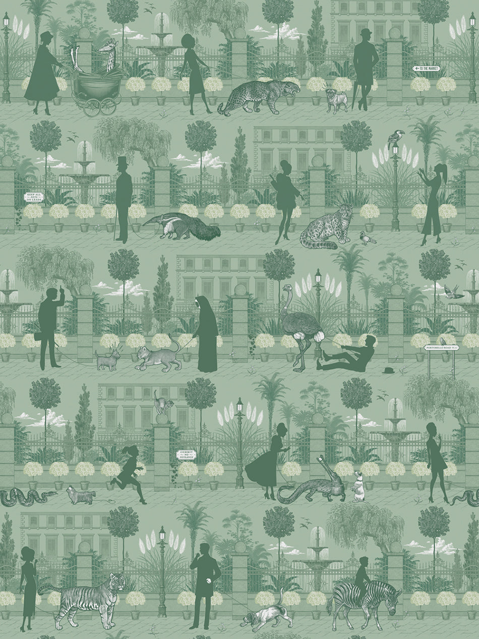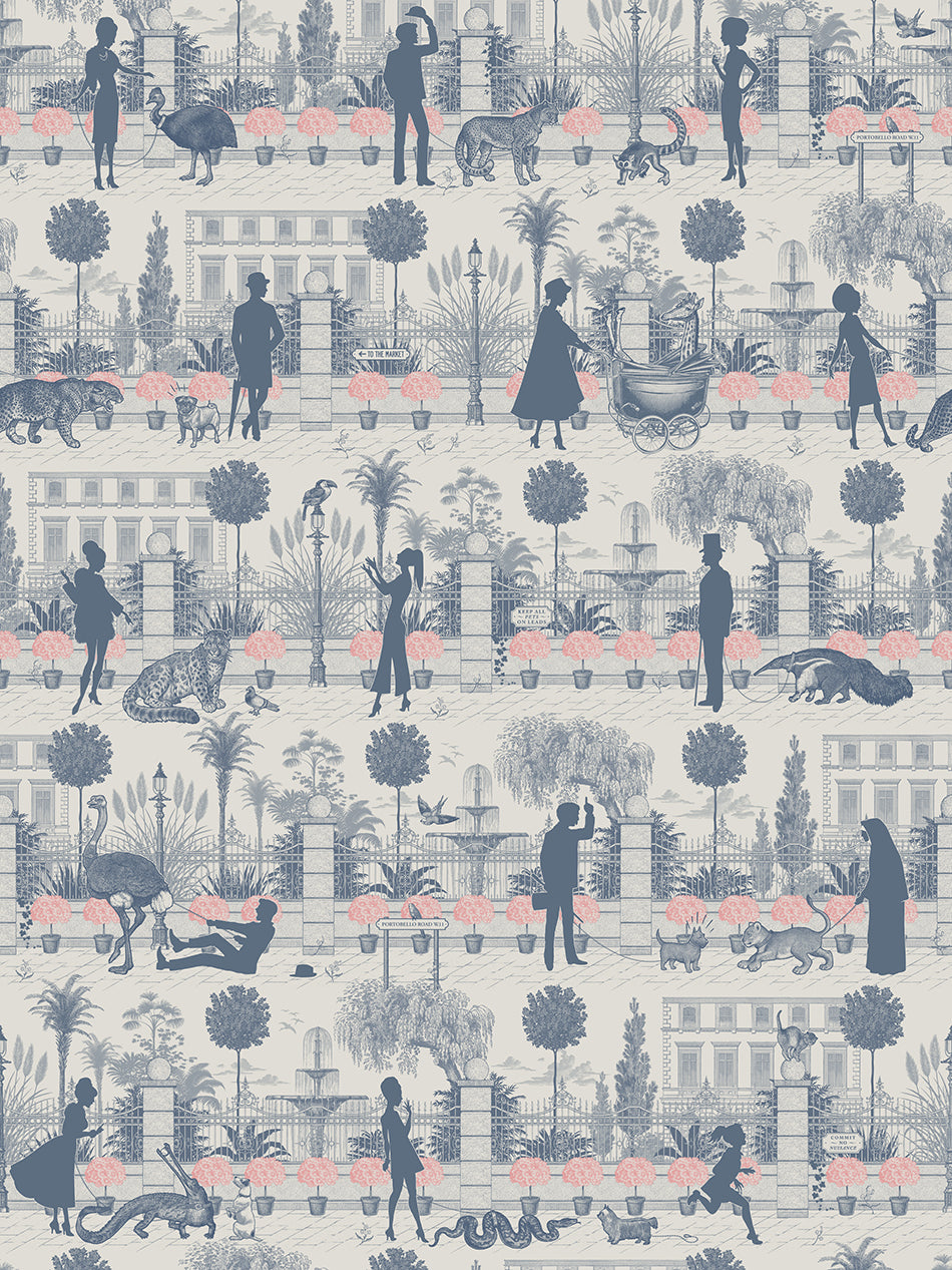 Inspired by London’s most unusual pets, this detail-rich wallpaper revisits a bonkers, bygone era where you could encounter an array of exotic animals not just at the zoo, but on the streets!