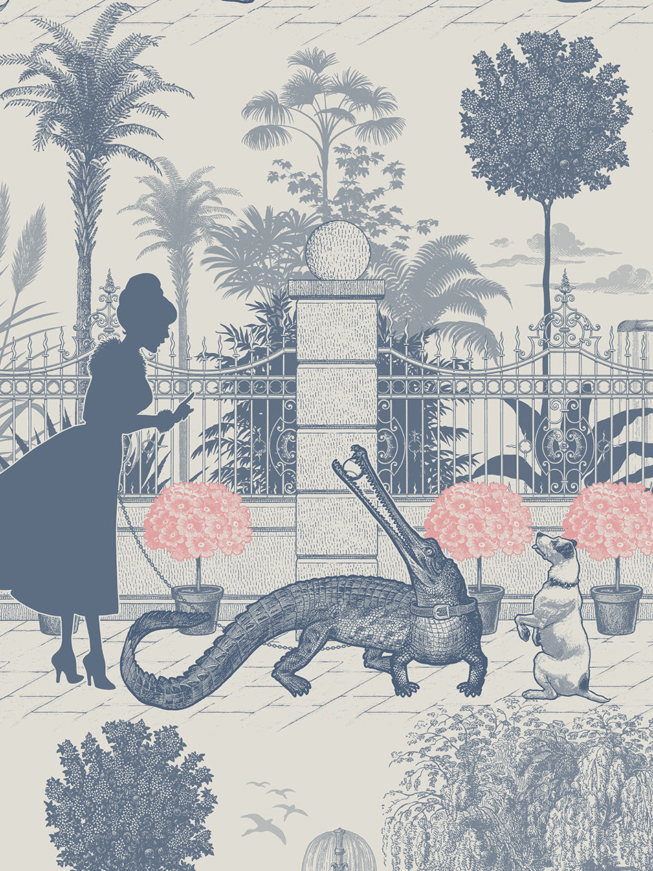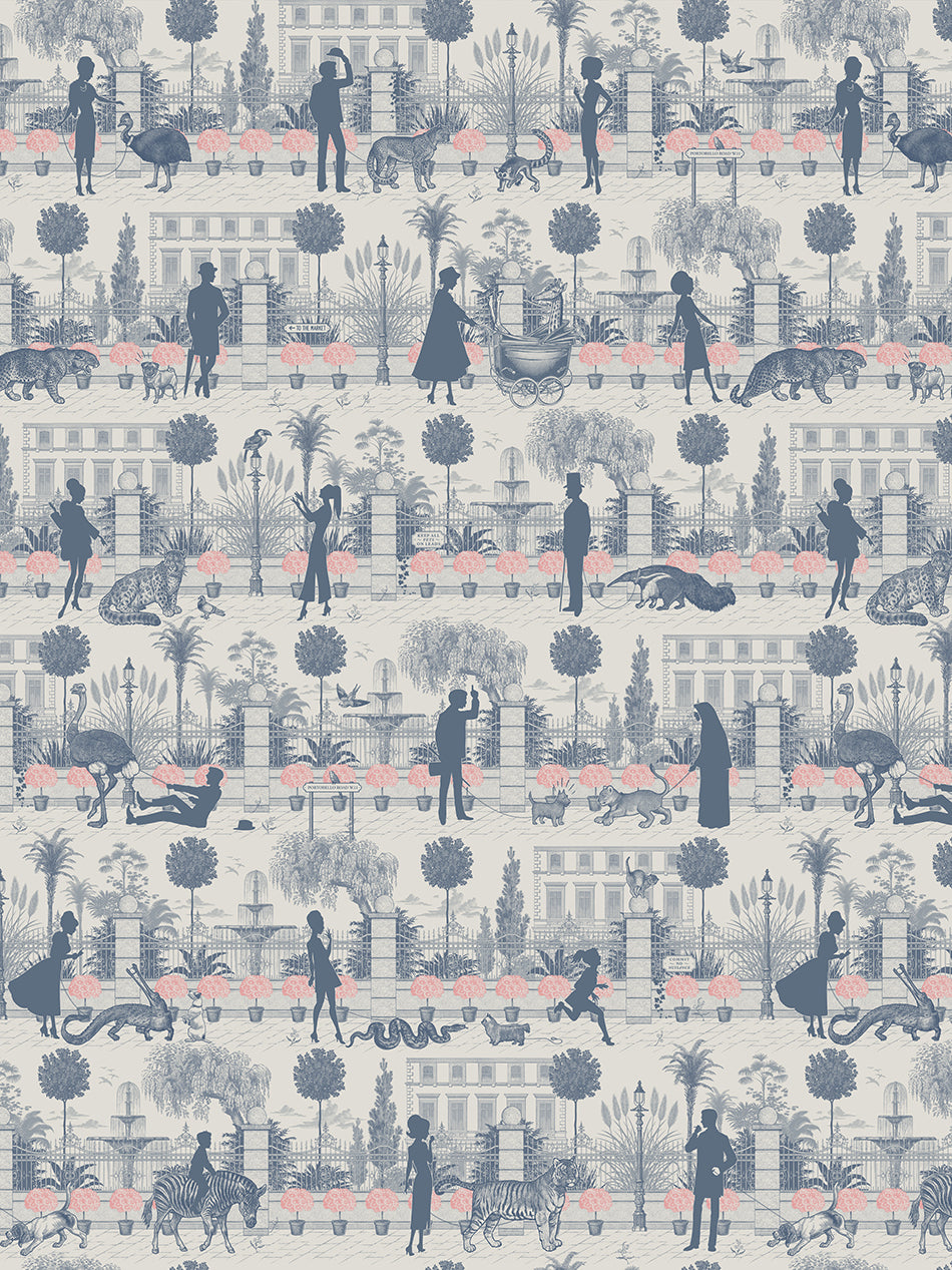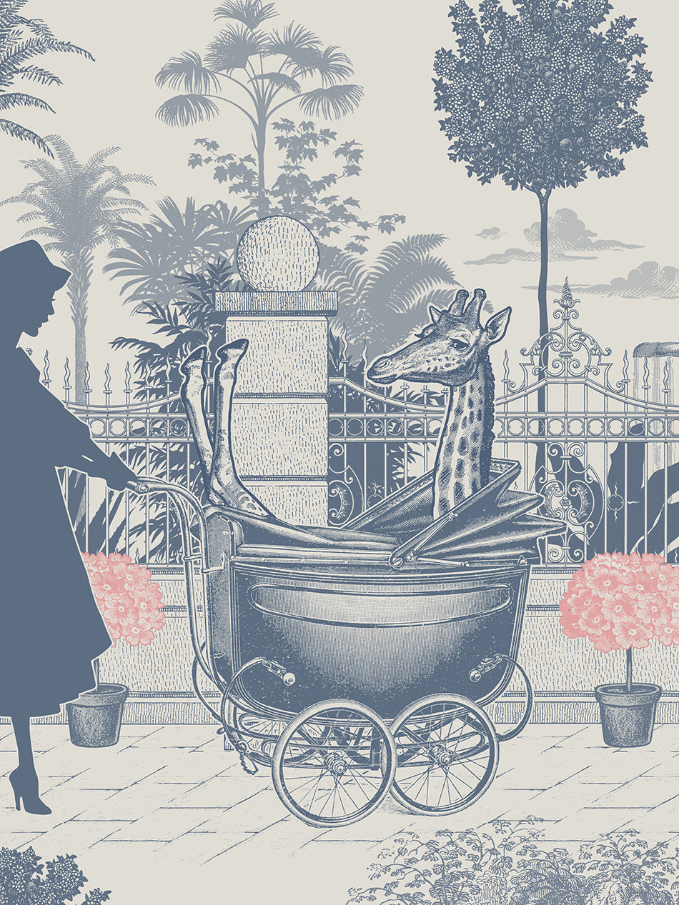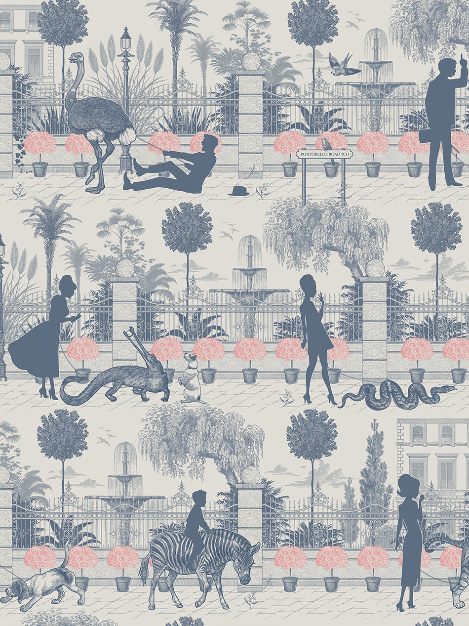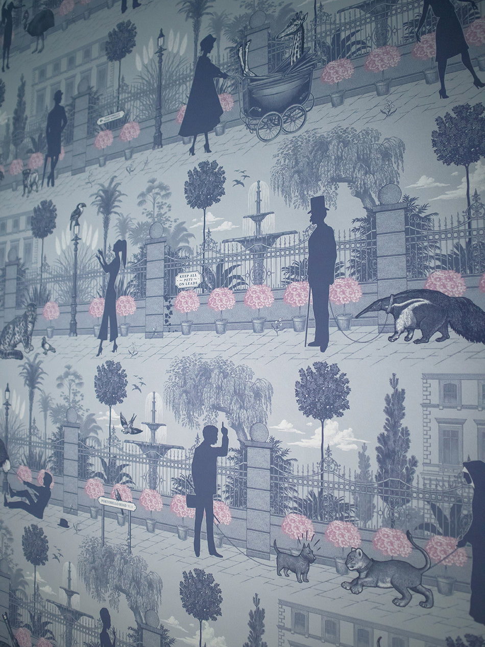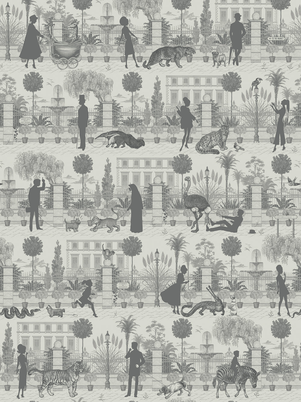 Inspired by London’s most unusual pets, this detail-rich wallpaper revisits a bonkers, bygone era where you could encounter an array of exotic animals not just at the zoo, but on the streets!