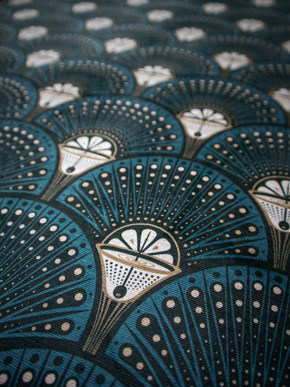 An Art Deco velvet that brings Gatsby glamour to your home. With a striking colour palette of deep blue, black and gold.