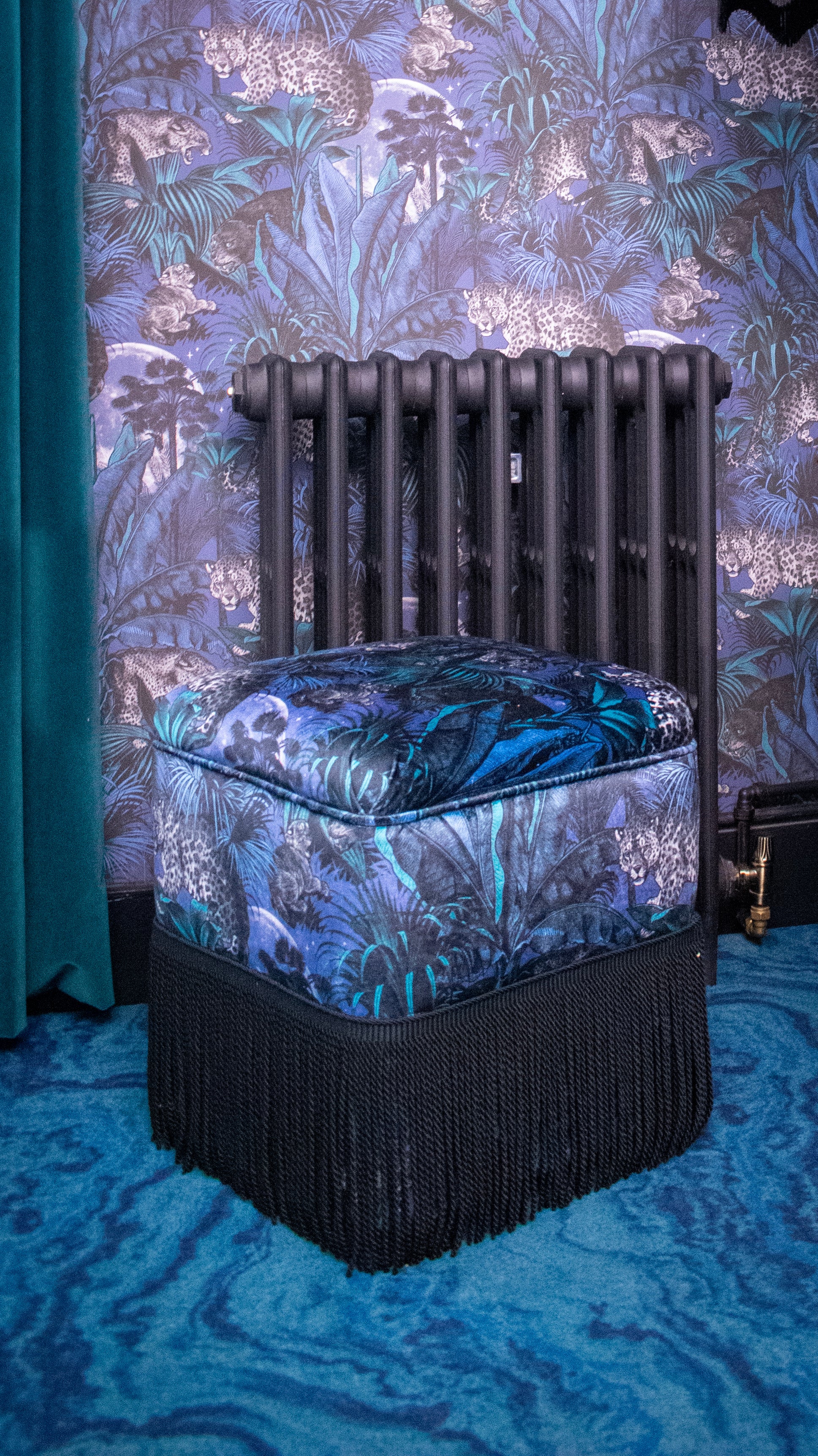 This gorgeous bespoke footstool has been upholstered in our iconic print featuring tropical palms, jungle foliage and big cats, in a luxurious palette of deep blue, teal and emerald green. The piece has been finished with ornate black braiding on the lower half and has brass wheels underneath for easy moving.