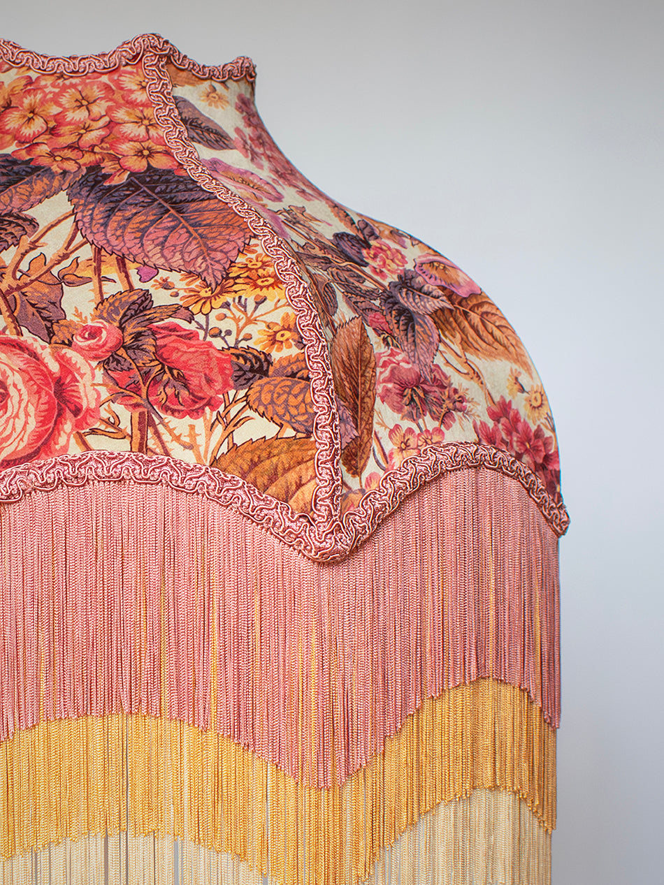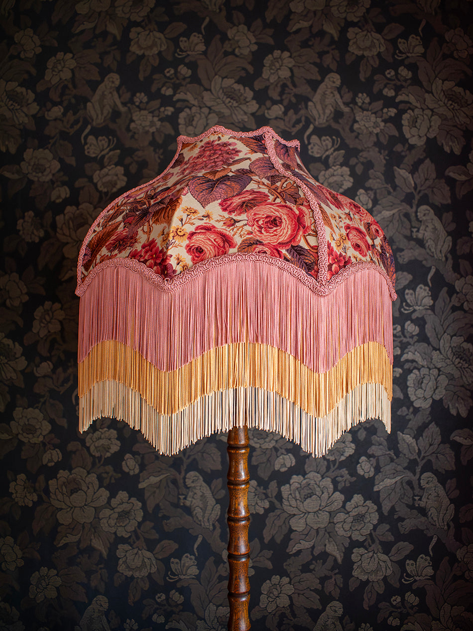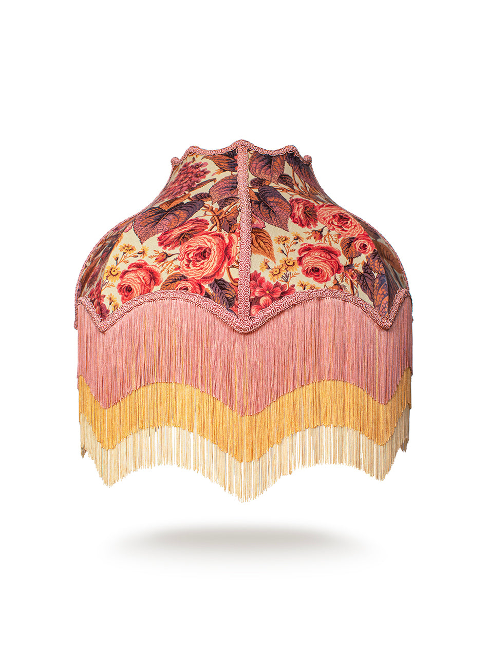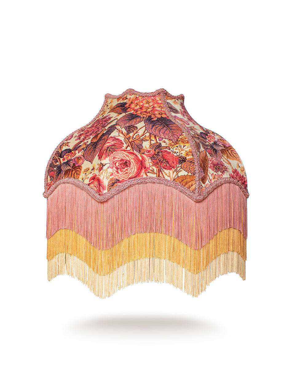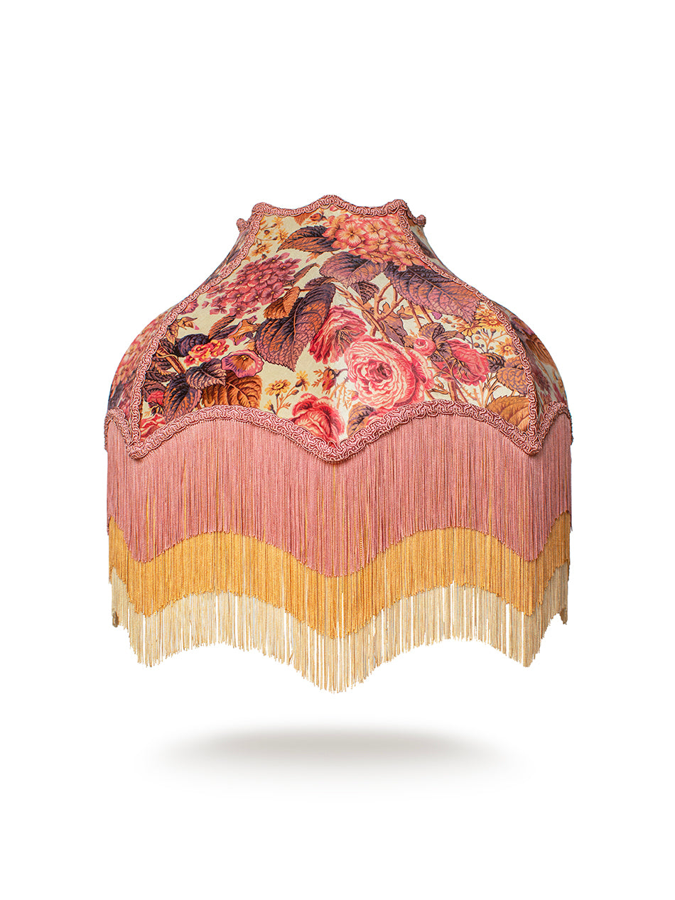 A handmade velvet lampshade in blush pink, soft rose, cream and gold, finished with ornate braiding and a luxuriously three-layered fringe.