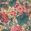 A calming wallpaper with a delicate, neutral background and accents of deep green, pink and blue. We love using this as a living room or bedroom wallpaper.