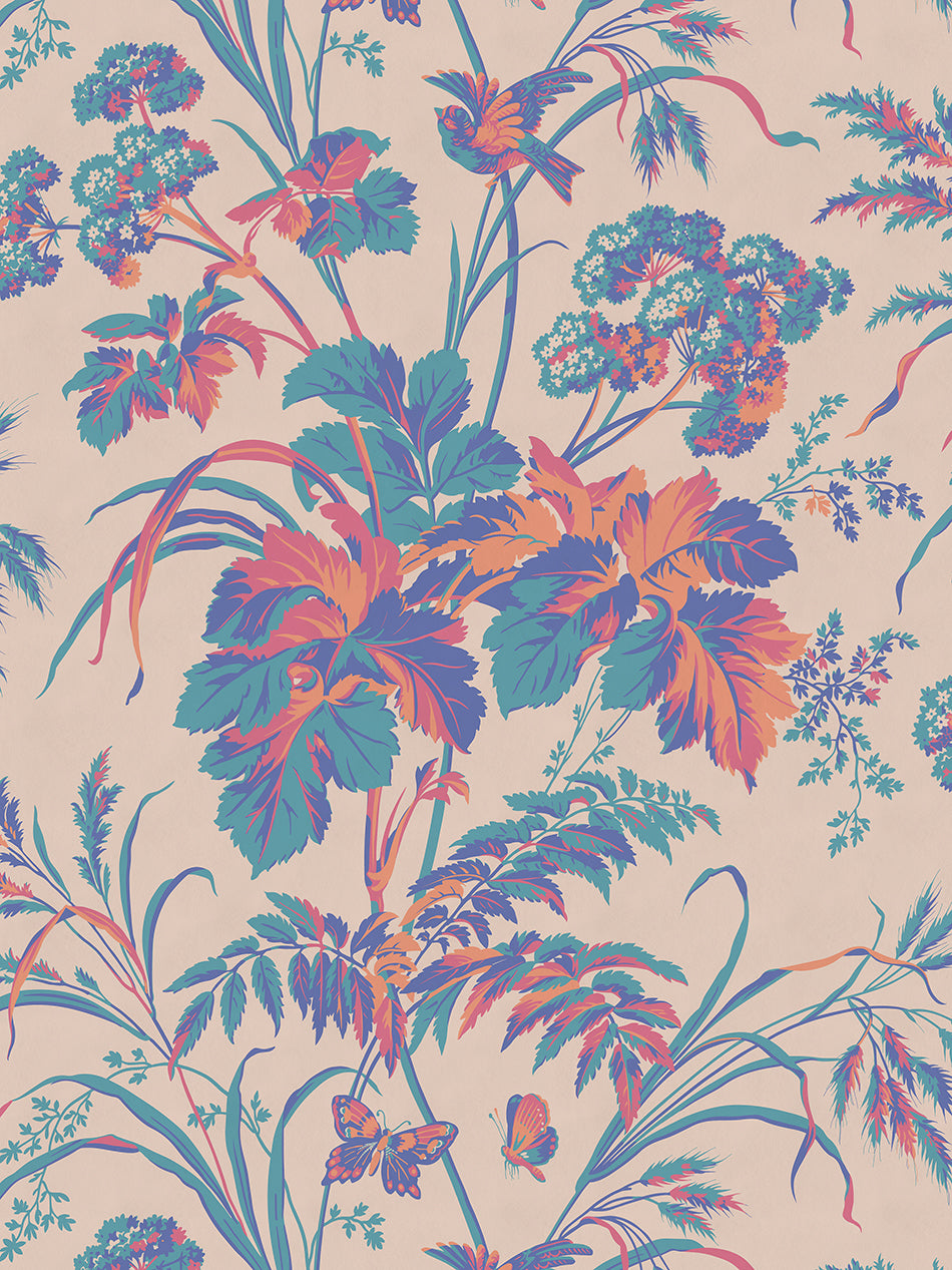 A vibrant, Warhol-inspired palette of pinks, blues and teals with a soft, neutral background. We love using this as a statement hallway wallpaper.