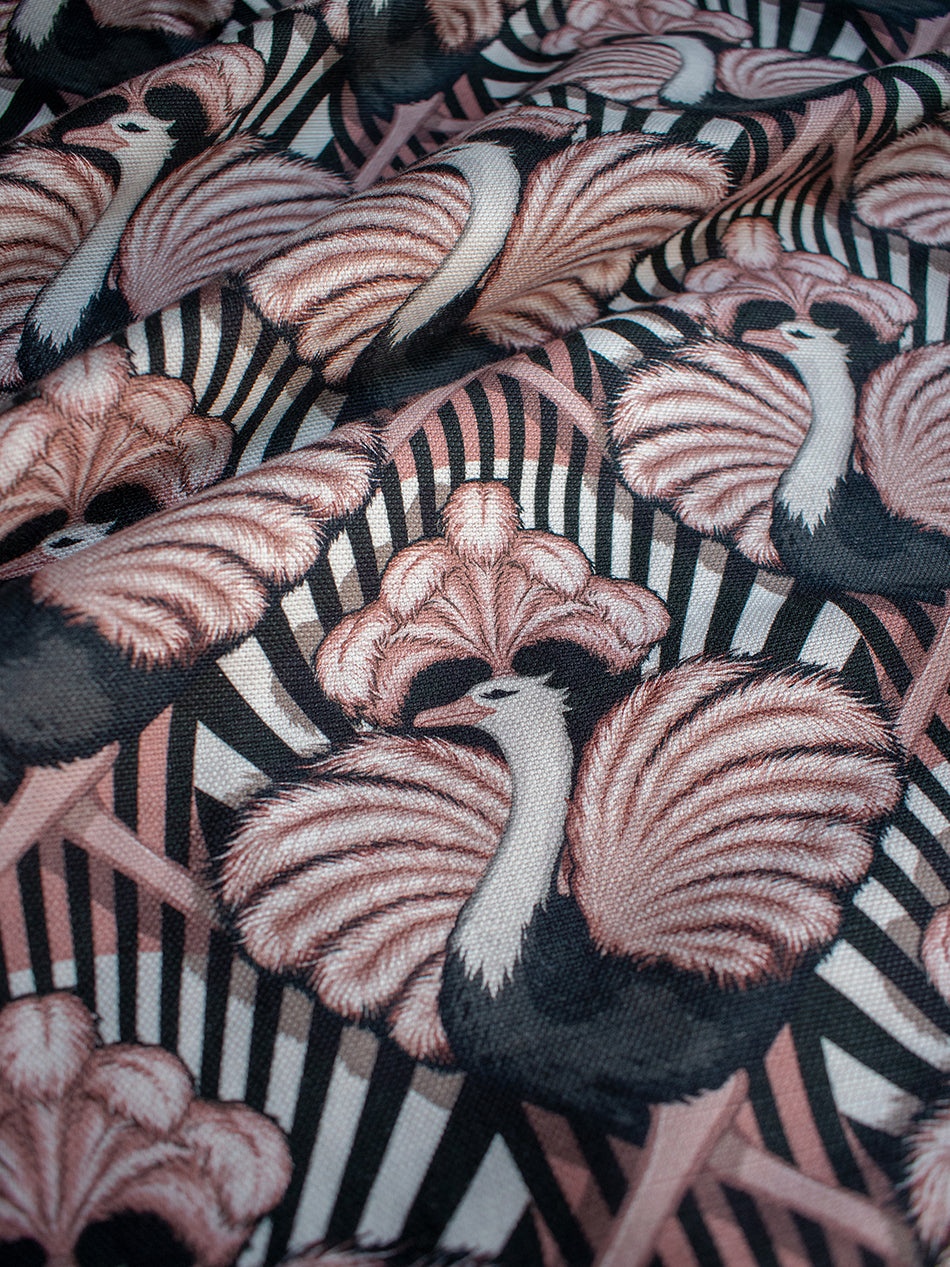 A stunningly flamboyant design that conjures the Golden Age of Hollywood and the iconic motion pictures of Fred Astaire and Ginger Rogers. Our glorious ostrich showgirls display their beautiful feathers as they dance across the stage in glorious Technicolour formation.