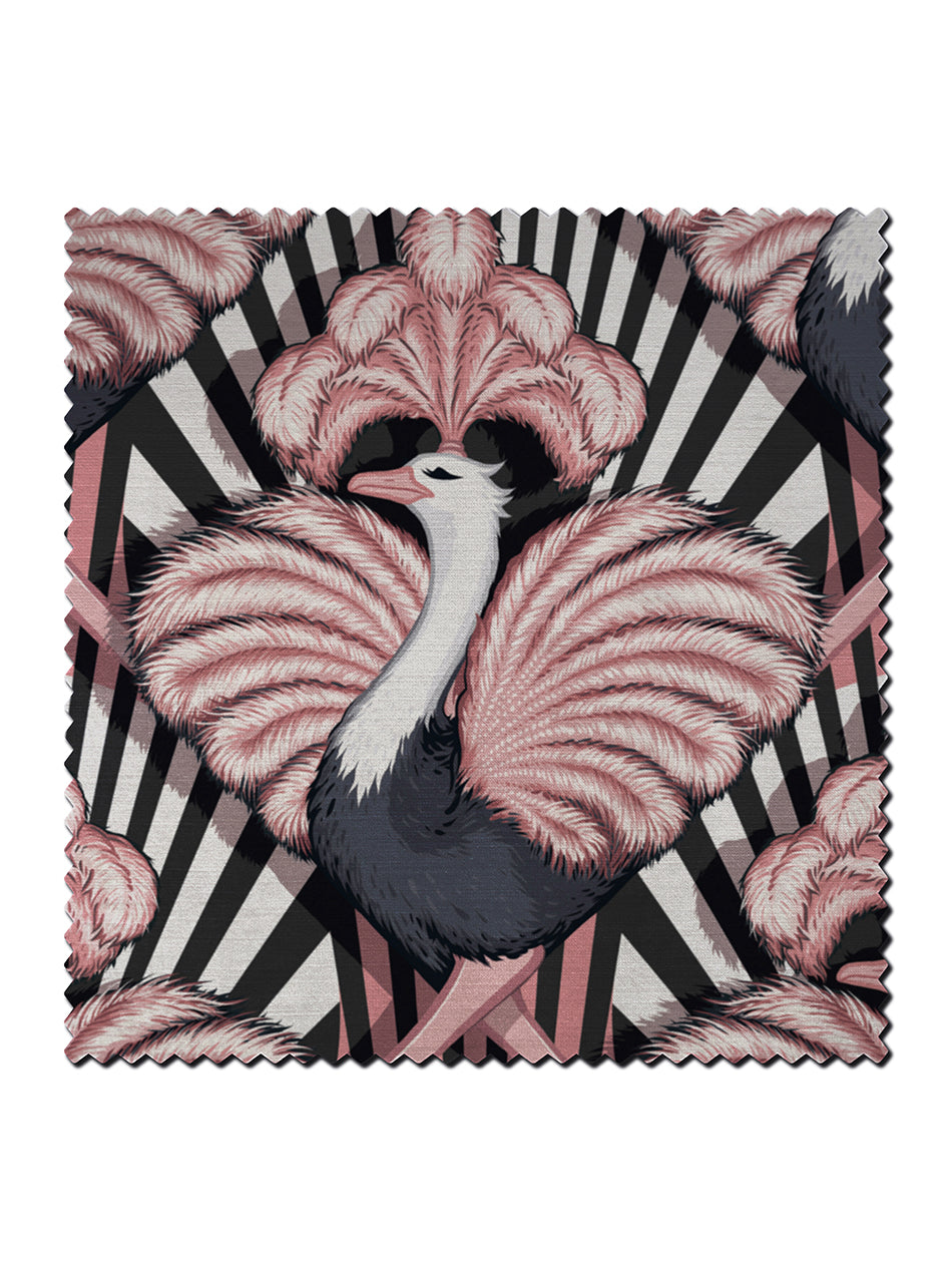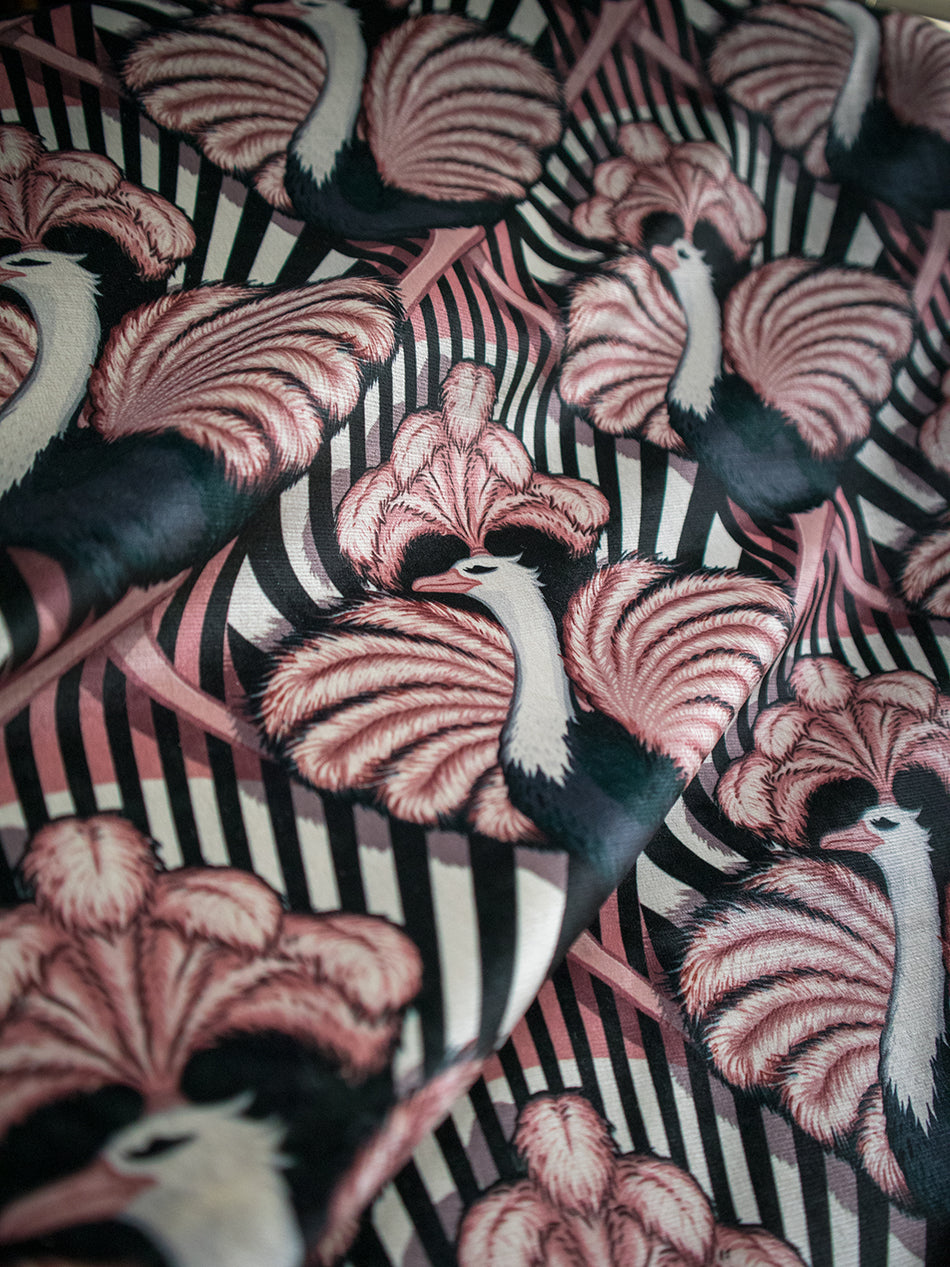 A stunningly flamboyant velvet that conjures the Golden Age of Hollywood with glorious ostrich showgirls dancing across the stage.