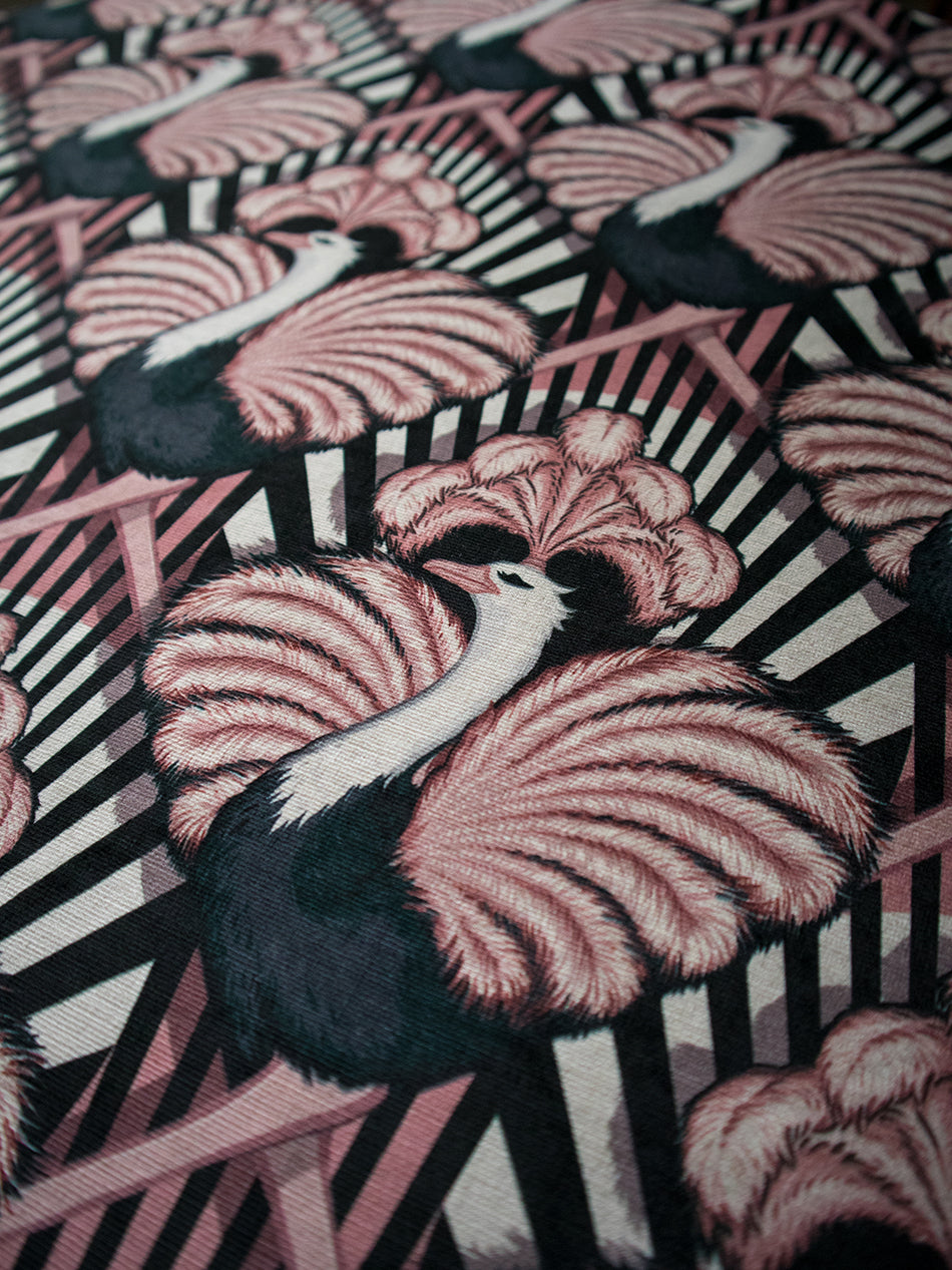 A stunningly flamboyant velvet that conjures the Golden Age of Hollywood with glorious ostrich showgirls dancing across the stage.